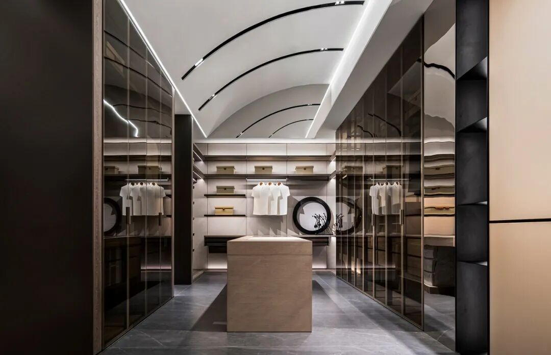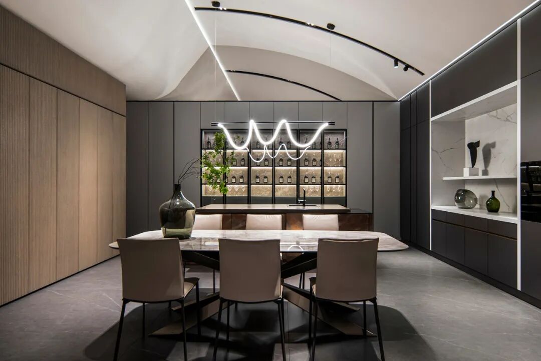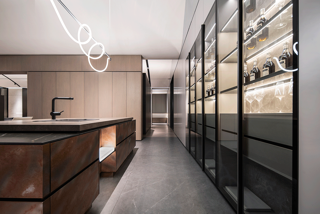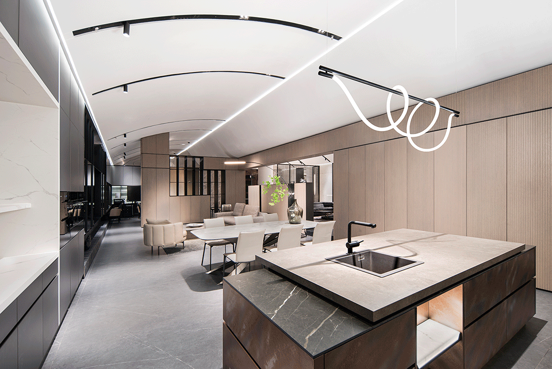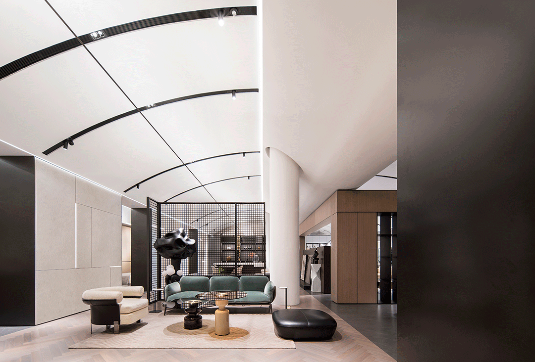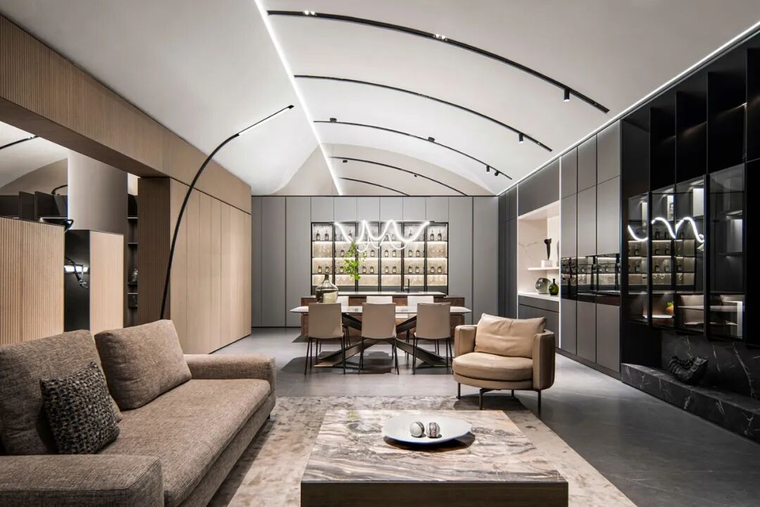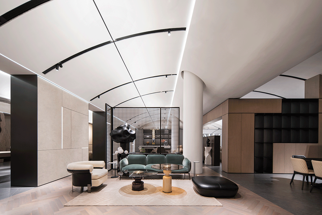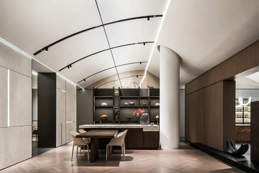 步入展厅,视线之中,天花流动的曲线,自然融合的弧形,自展示柜、吧台、门框镜面、墙柱,借由灯光的点缀灵活延伸至整个场域。
