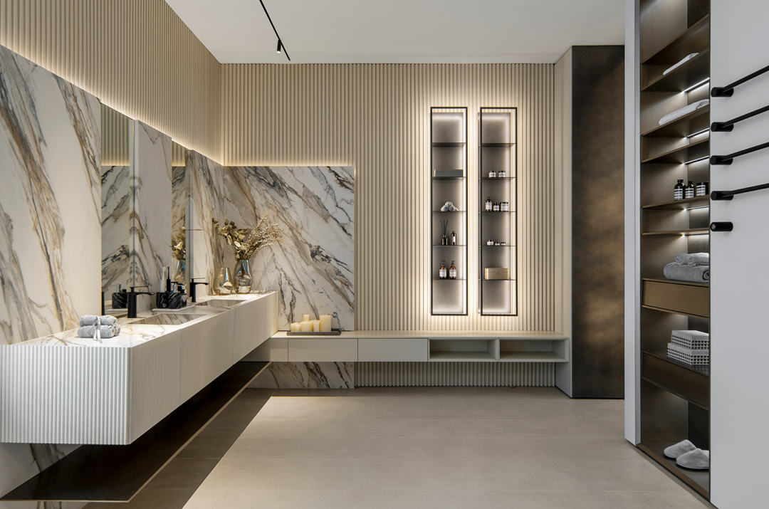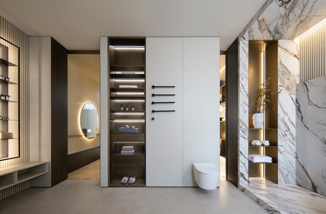 新的内饰更加私密和个性化,不同的天然色调或染色木与石材相得益彰,而墙壁微水泥和墙身饰面的中性色调则塑造了大部分空间,达到产品展示及纯粹的空间体验。让人与人、人与家具、人与空间和谐对话,启发人们在游览的过程中对于家居美学及生活方式的思考。