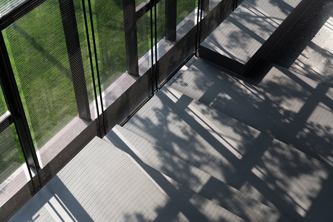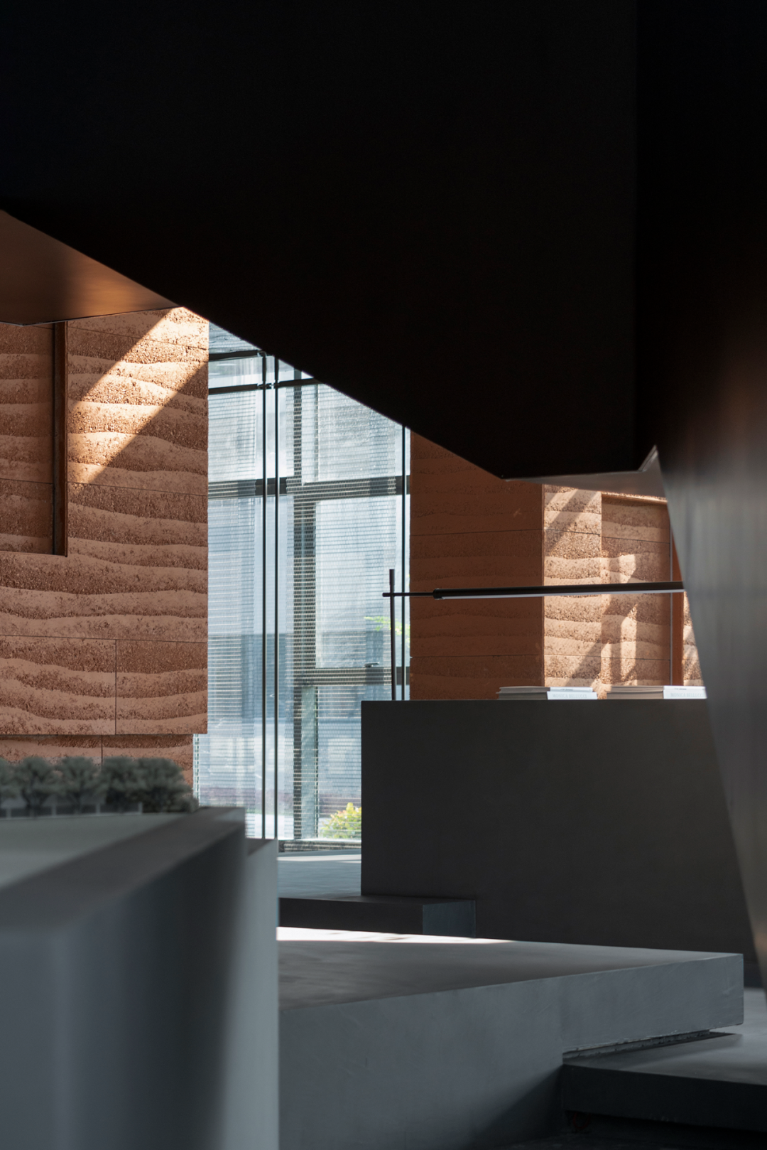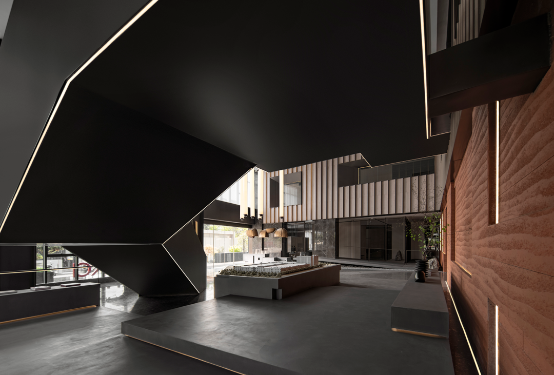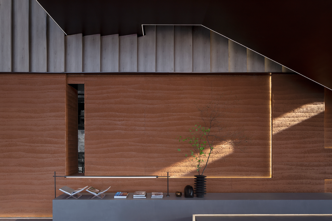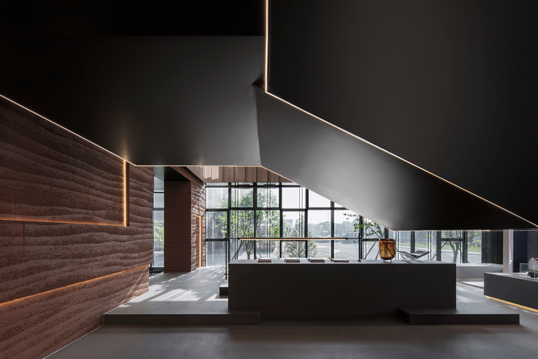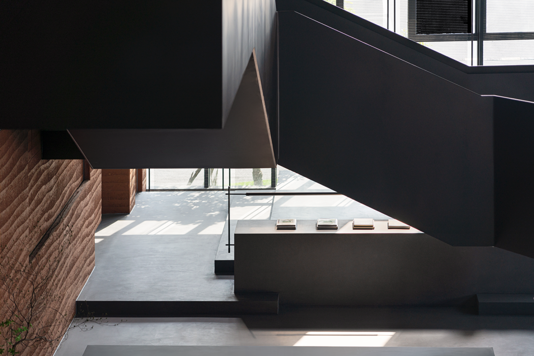 自然光柔和地铺洒在建筑块体丰富的肌理表面,形成强烈的节奏感。空间在整体柔和的基调上,跟随着光影的线条进行延展,同时营造出具有现代极简和未来消隐的不同感受,极具“城市山谷”的气场,幽静深远。