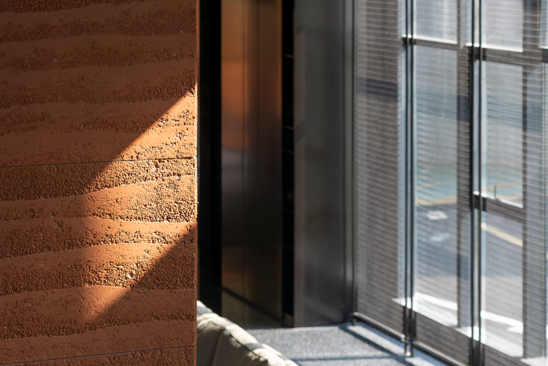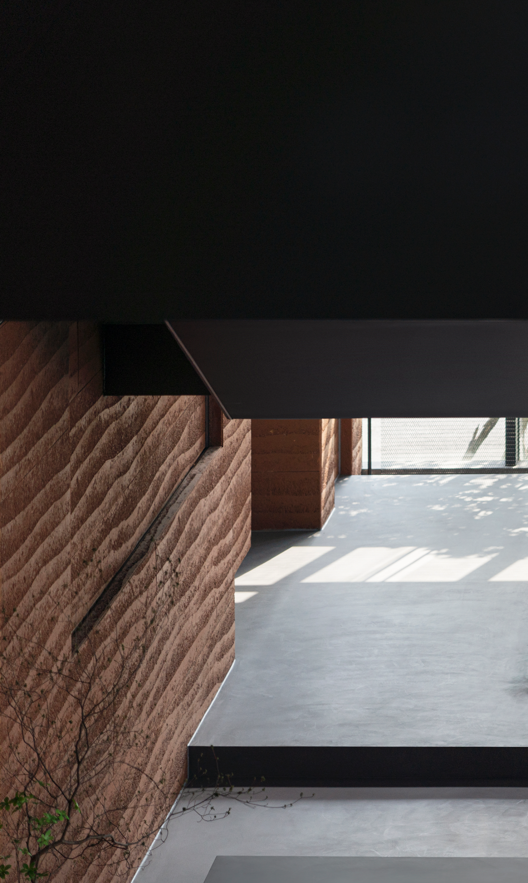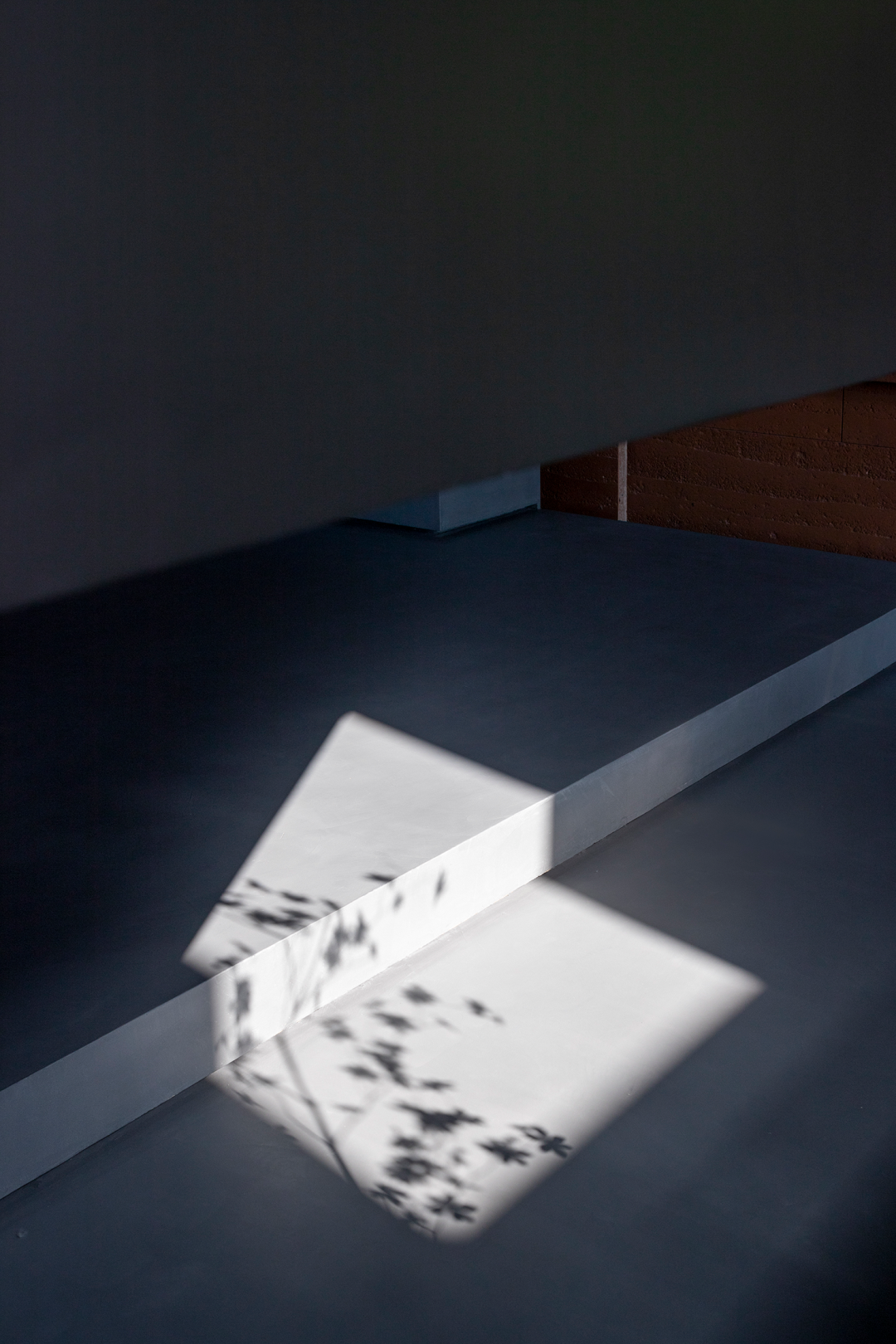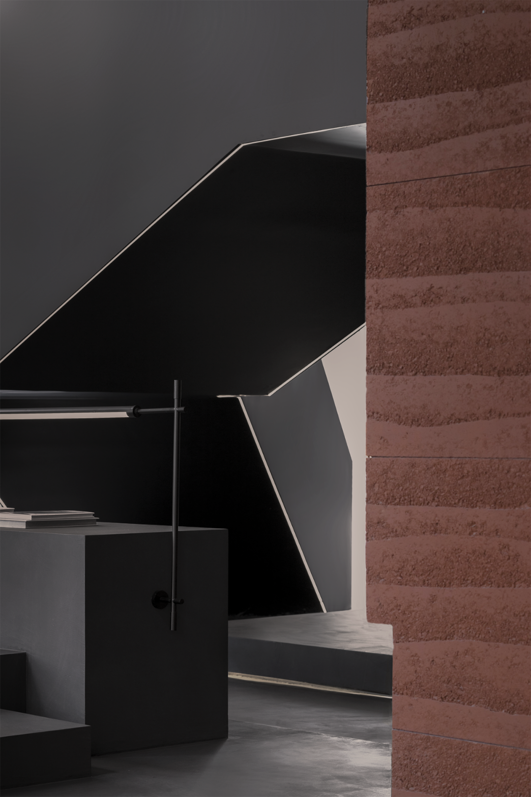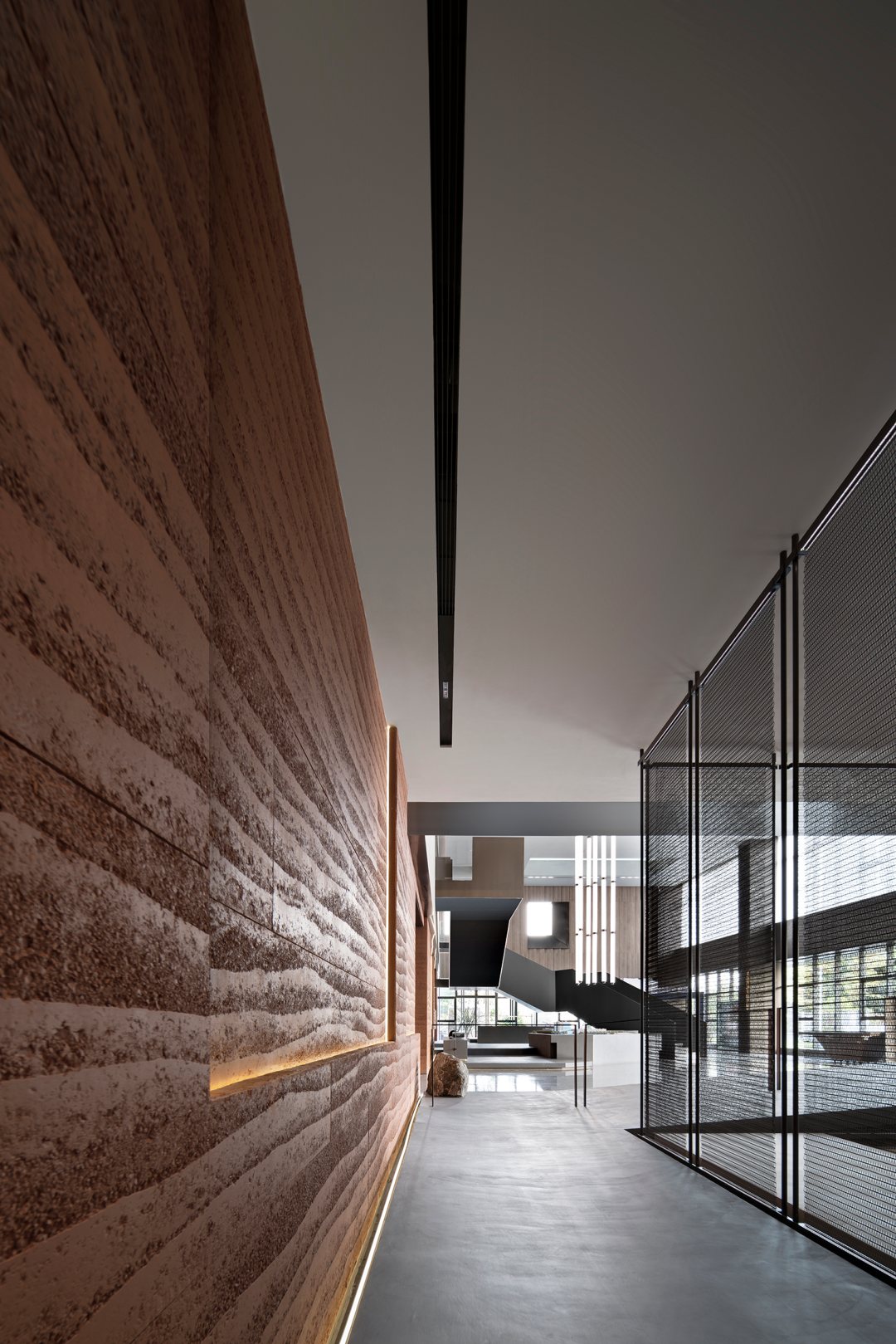 自然光柔和地铺洒在建筑块体丰富的肌理表面,形成强烈的节奏感。空间在整体柔和的基调上,跟随着光影的线条进行延展,同时营造出具有现代极简和未来消隐的不同感受,极具“城市山谷”的气场,幽静深远。