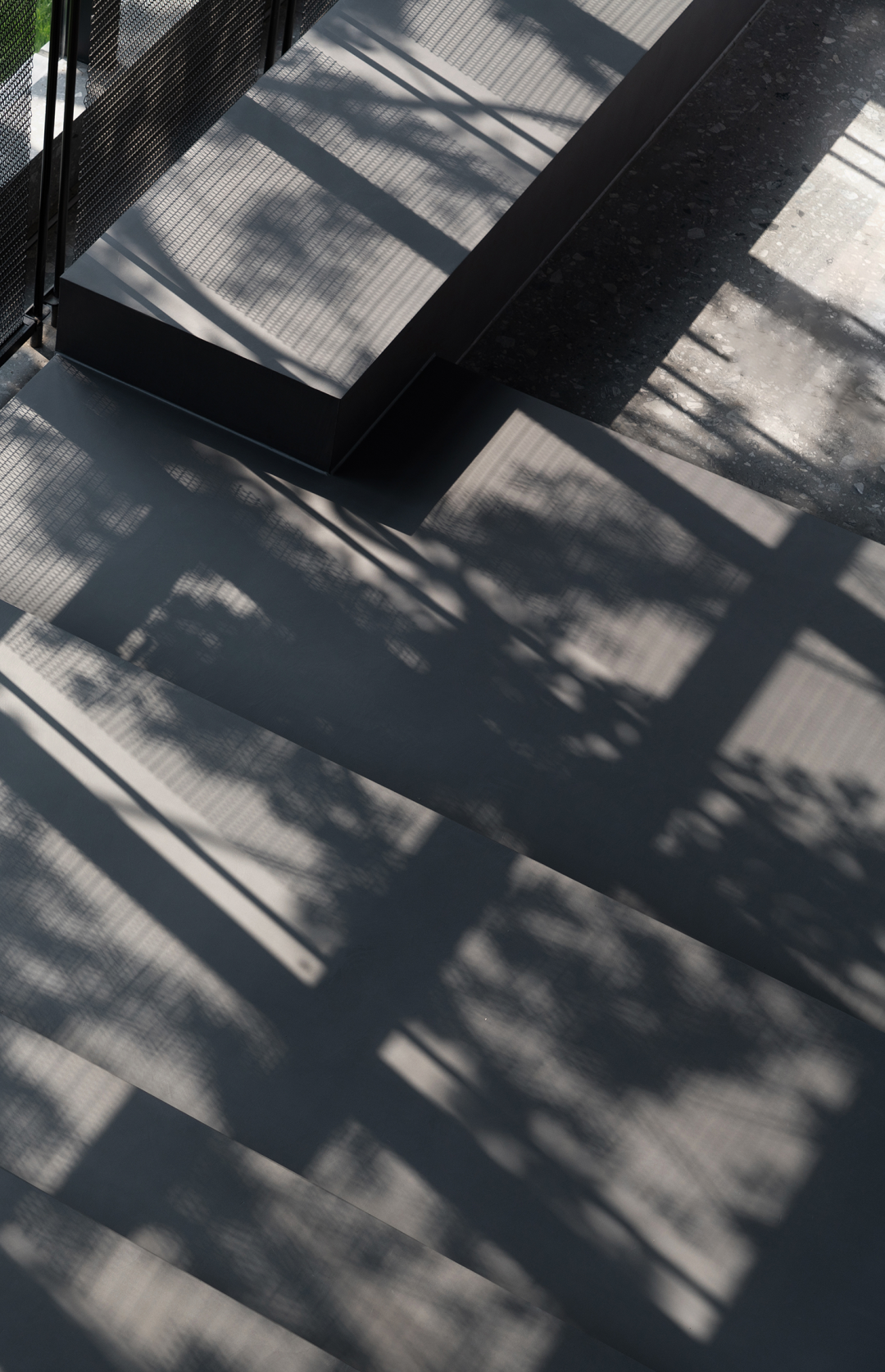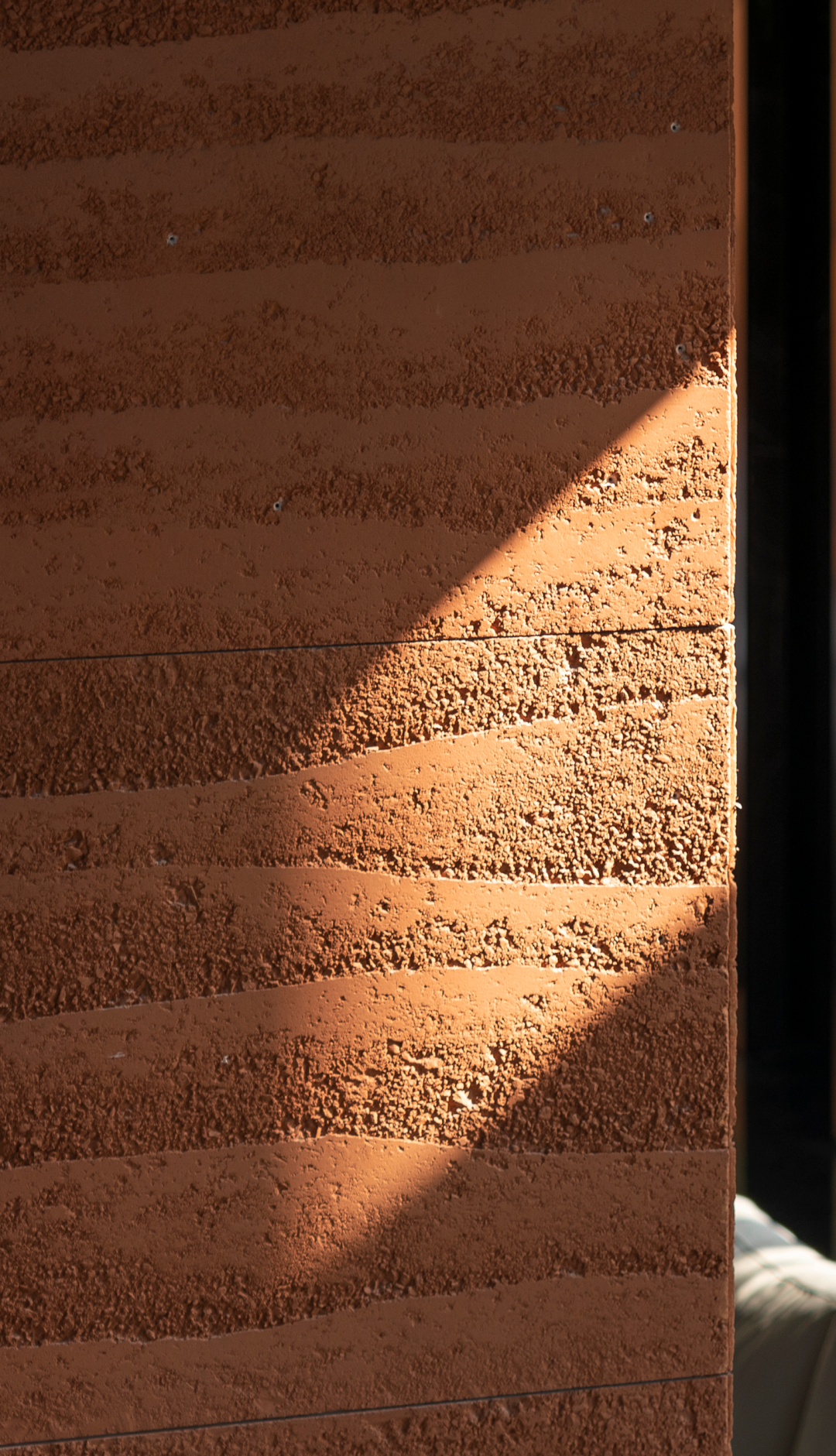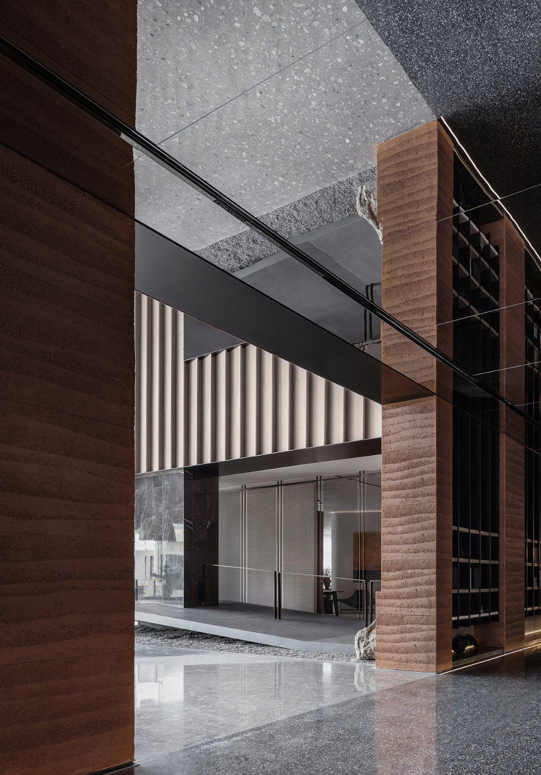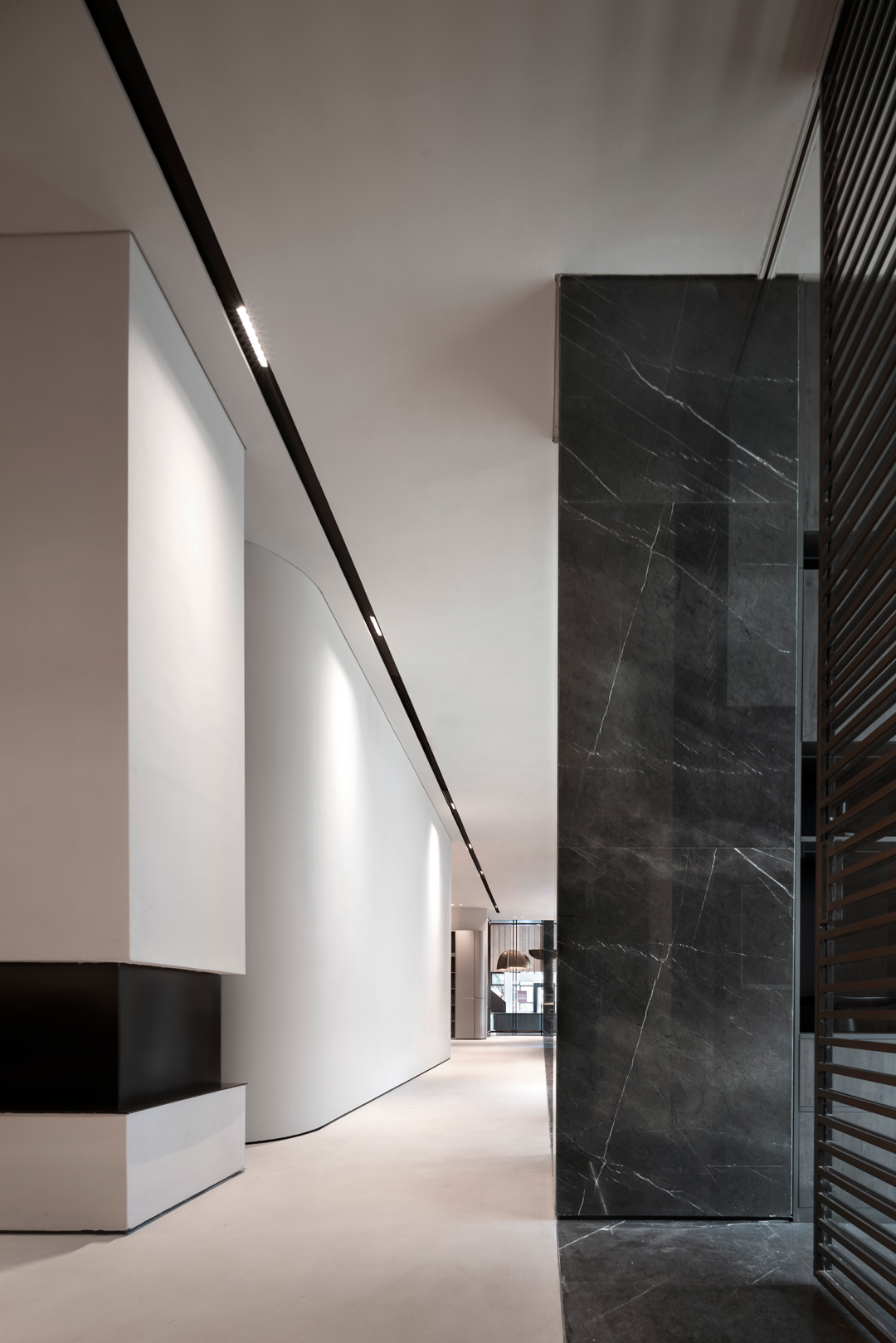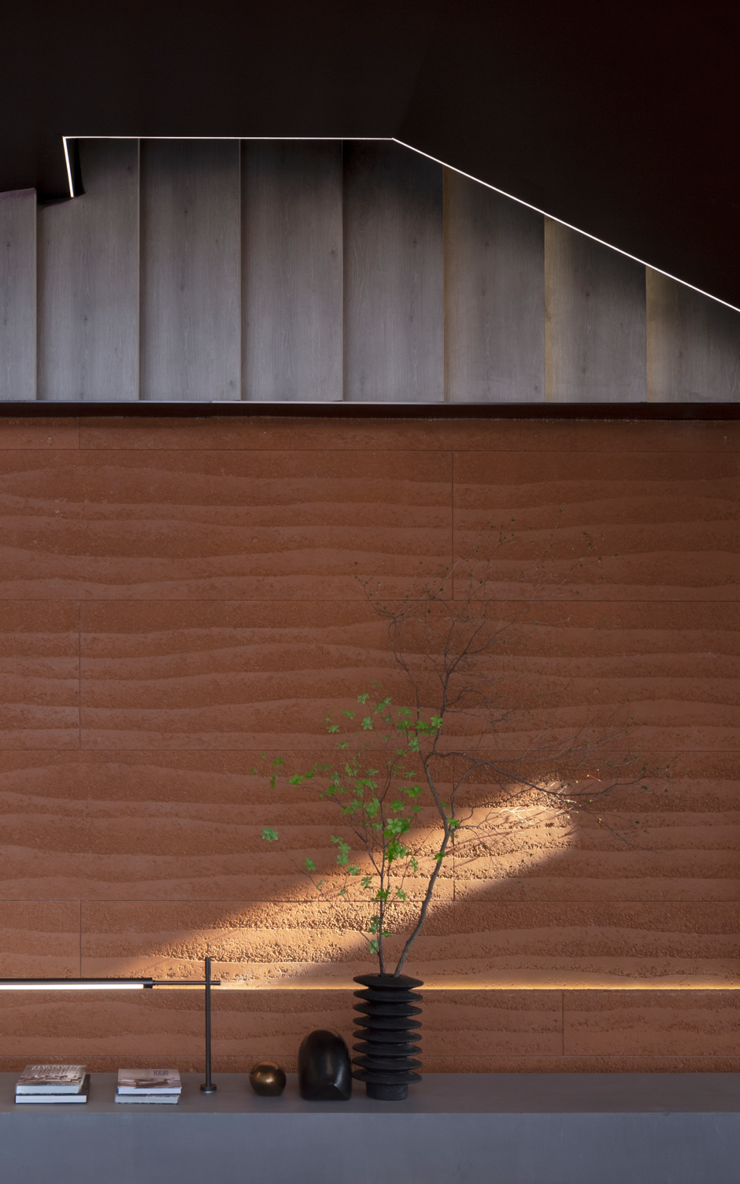 自然光柔和地铺洒在建筑块体丰富的肌理表面,形成强烈的节奏感。空间在整体柔和的基调上,跟随着光影的线条进行延展,同时营造出具有现代极简和未来消隐的不同感受,极具“城市山谷”的气场,幽静深远。
