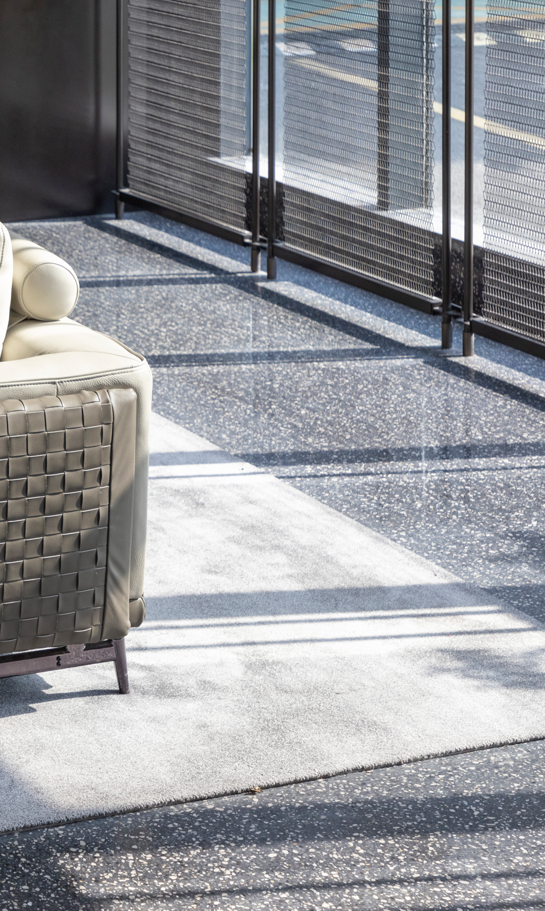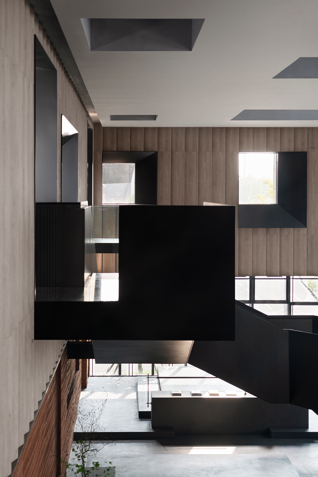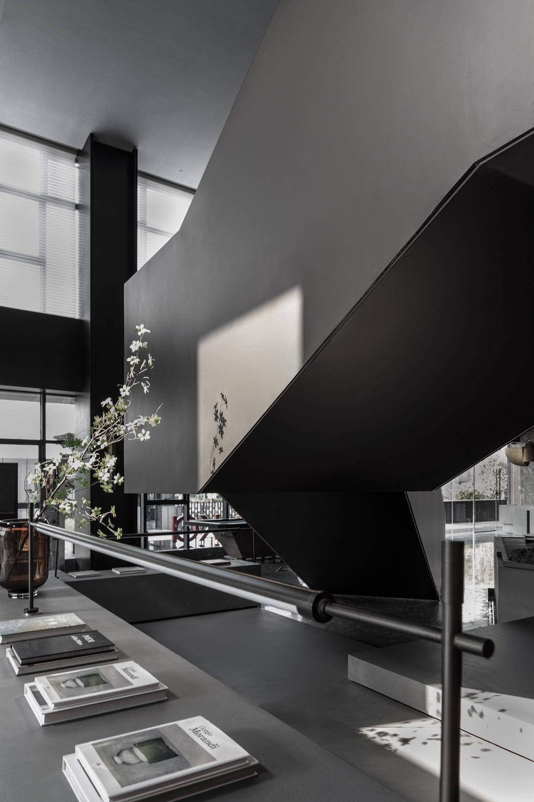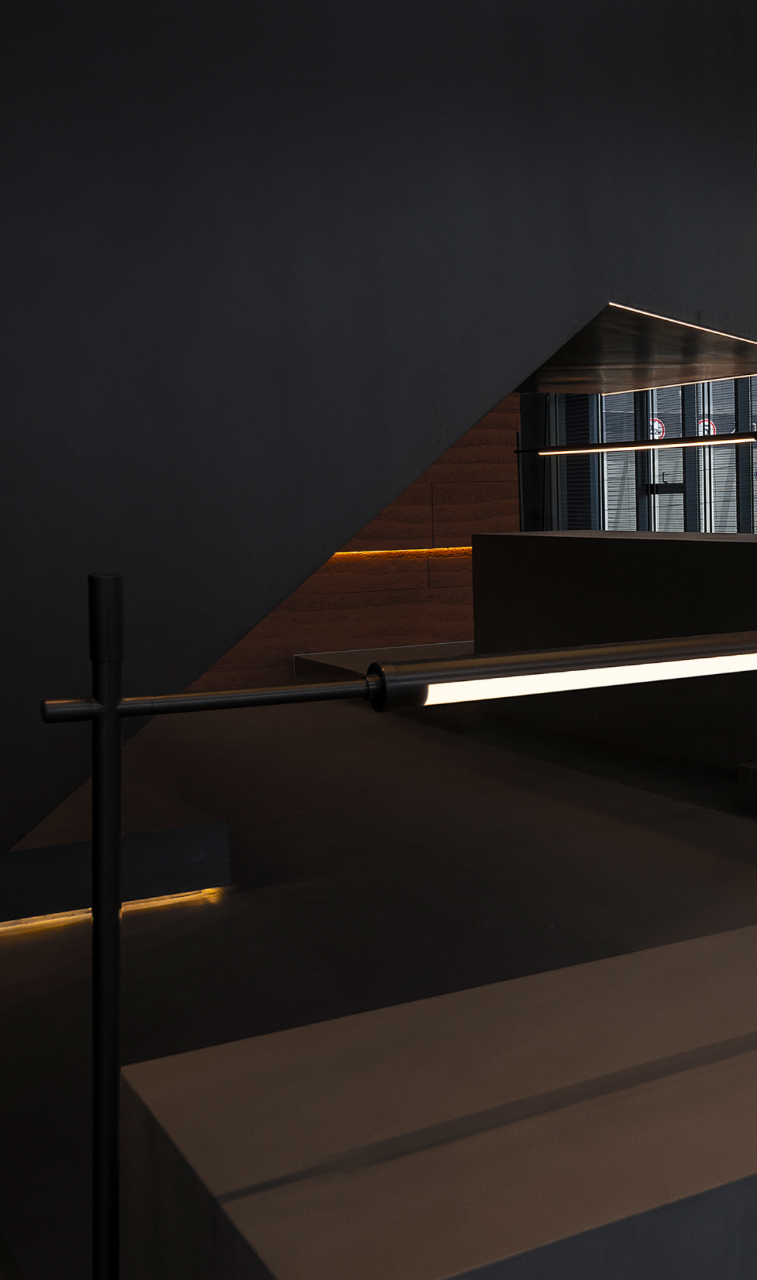 自然光柔和地铺洒在建筑块体丰富的肌理表面,形成强烈的节奏感。空间在整体柔和的基调上,跟随着光影的线条进行延展,同时营造出具有现代极简和未来消隐的不同感受,极具“城市山谷”的气场,幽静深远。