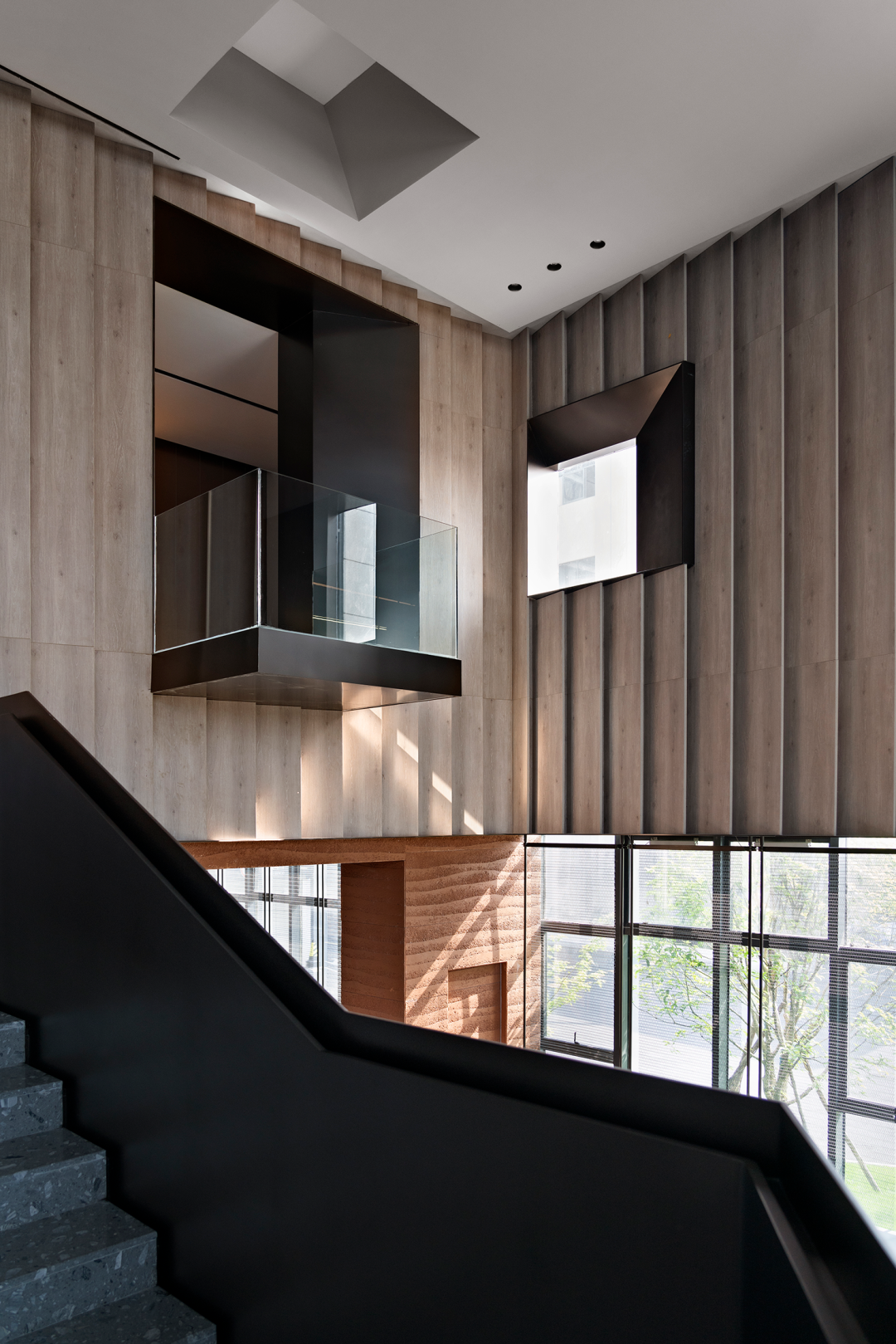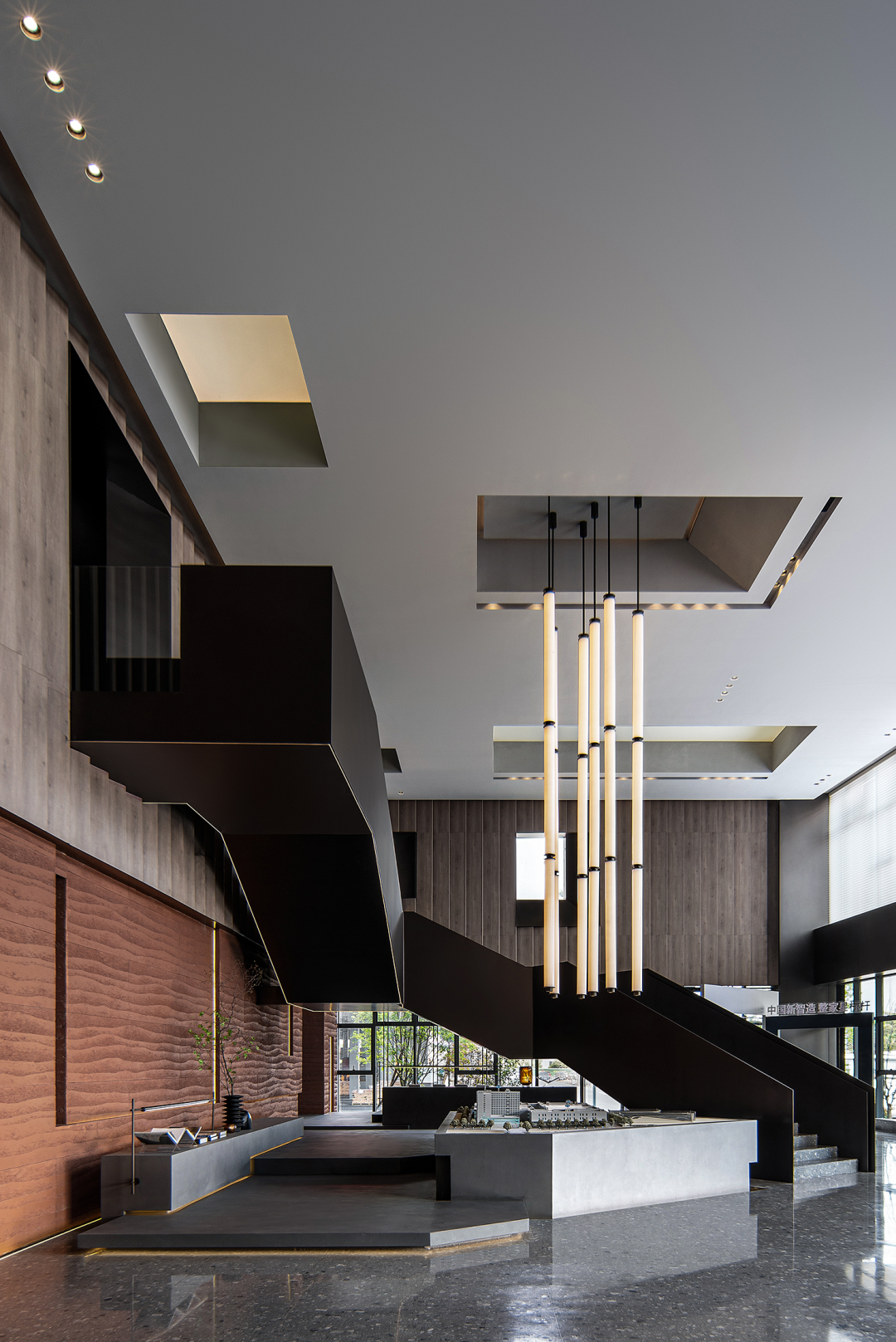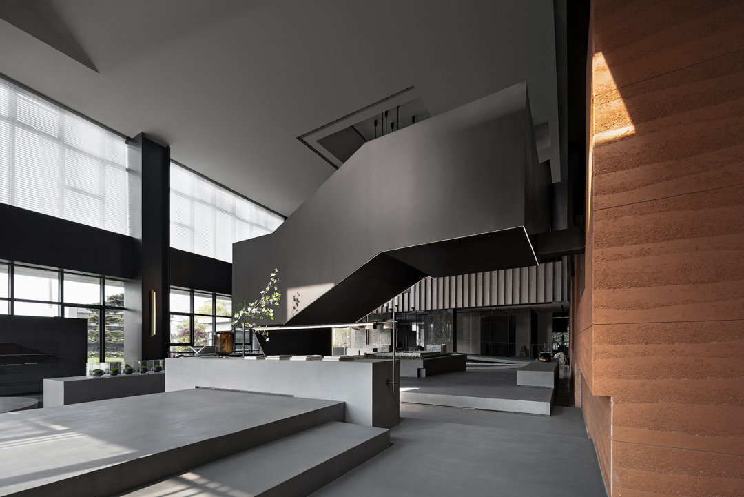设计师在中空区域运用仿生学设计抽象提纯,重色阶梯漫步于空中,光影交错,变化丰富。从而把自然与建筑形态引入到接待大厅。