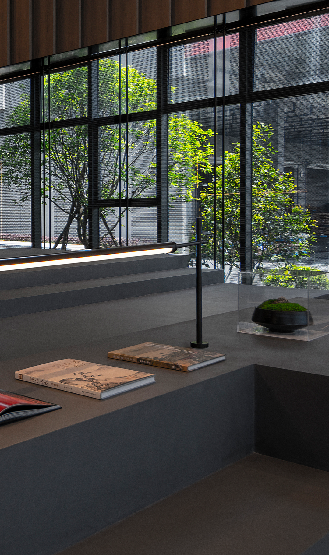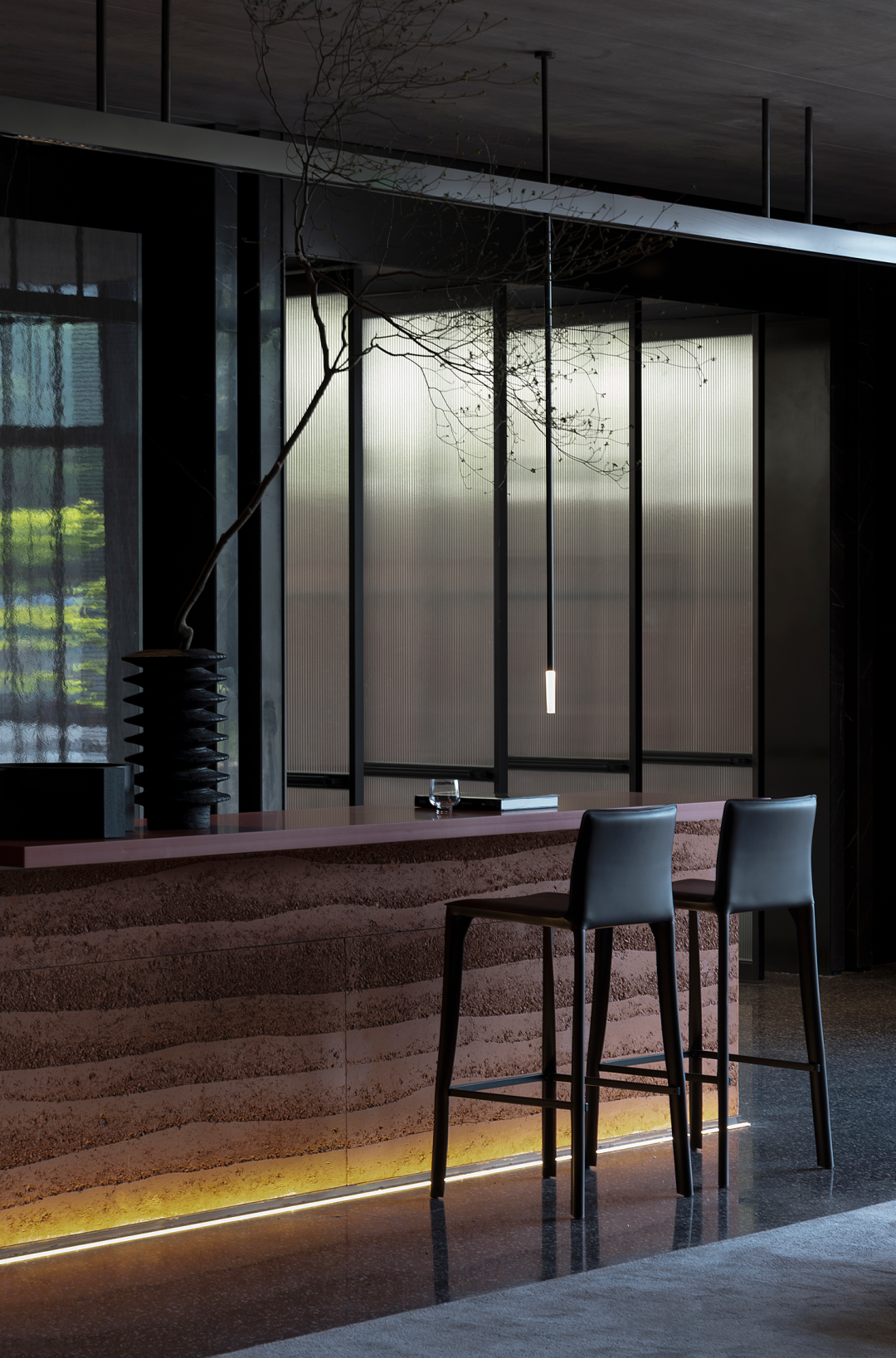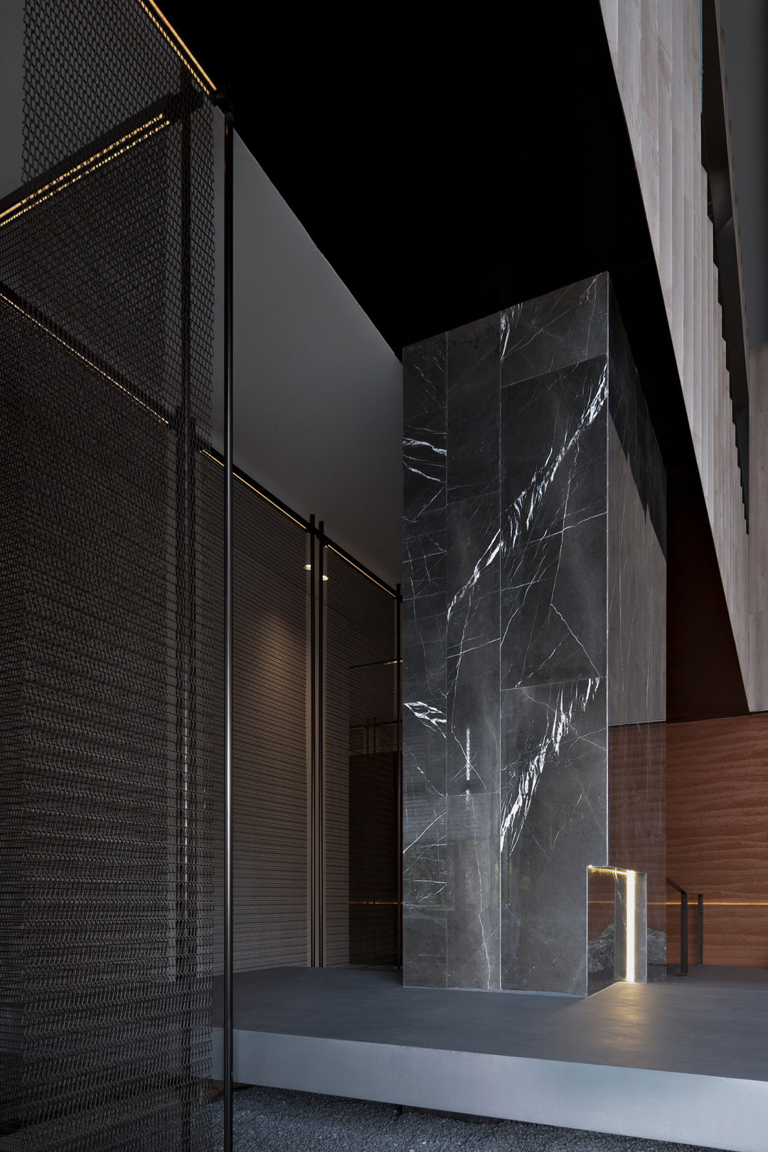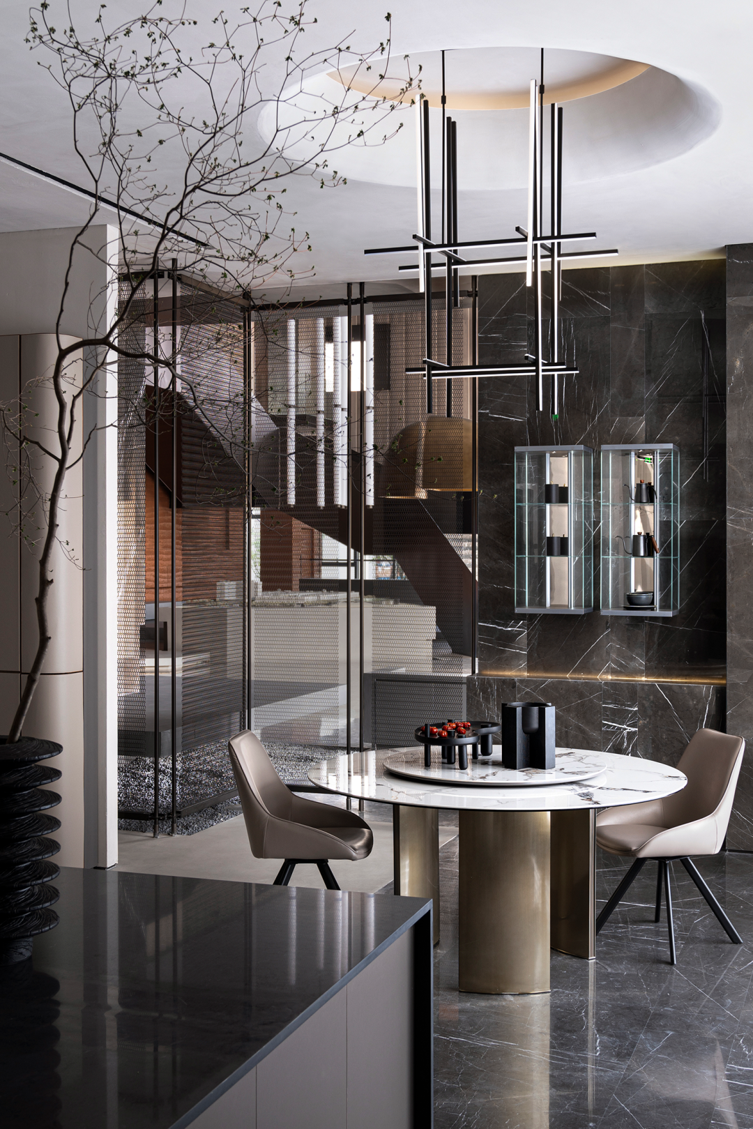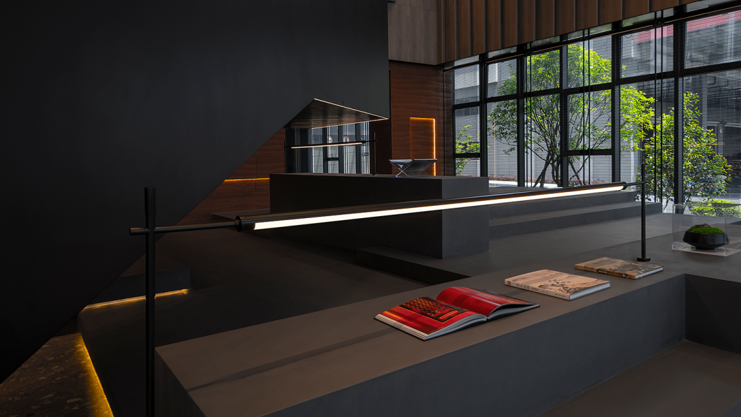 在不同的空间场景中,设计师利用线条、框架等设计元素来表达空间的内在精神。金属格屏自然肌理、铁板材质的优雅姿态,以及特殊涂料的运用,在光线的投射下营造出层层的阴影,一幅唯美、静谧的画面顿时浮现于眼前。