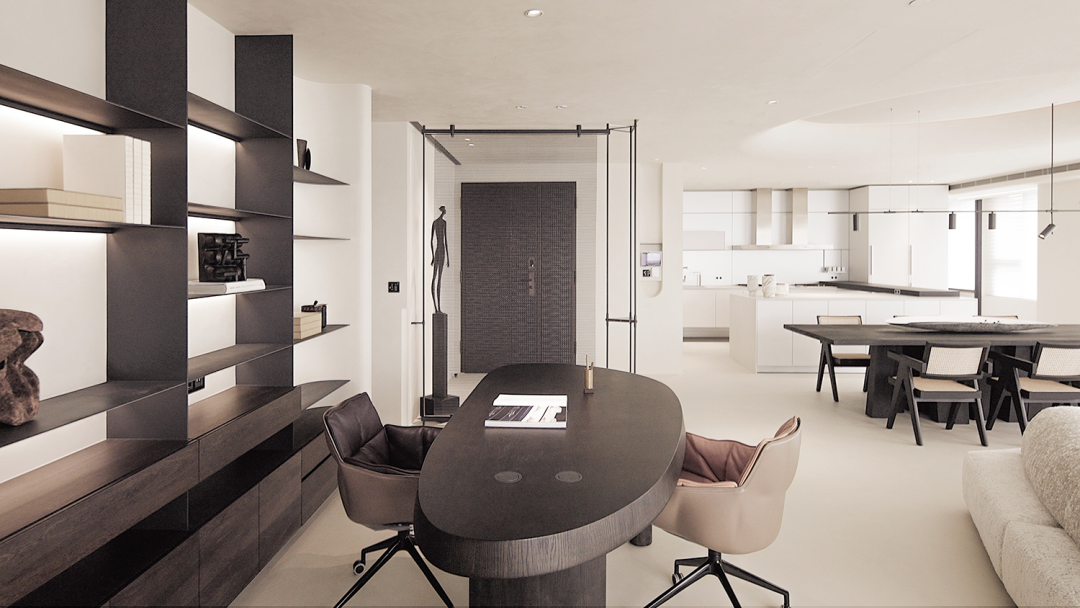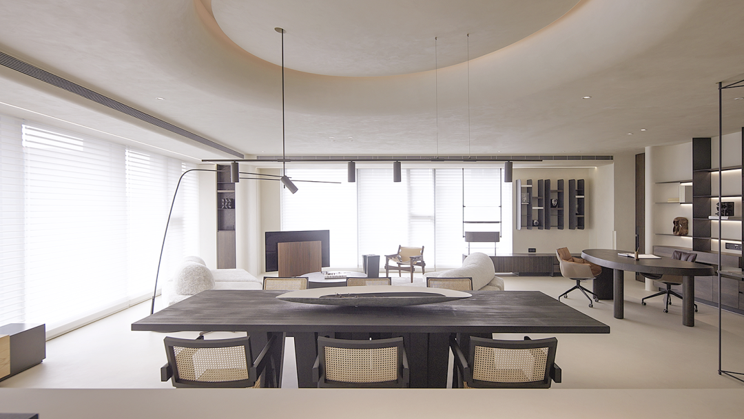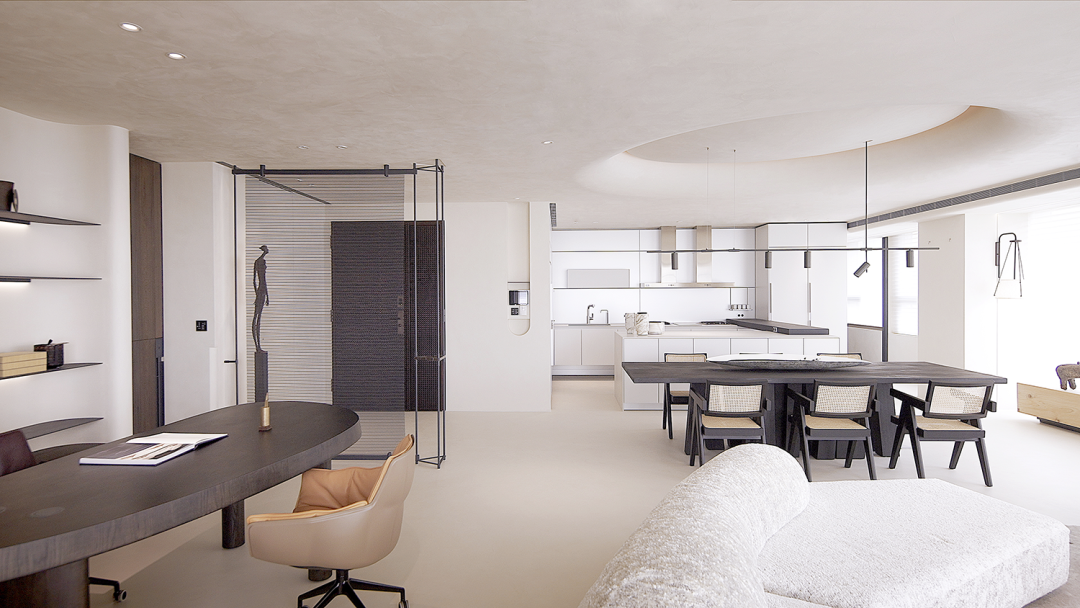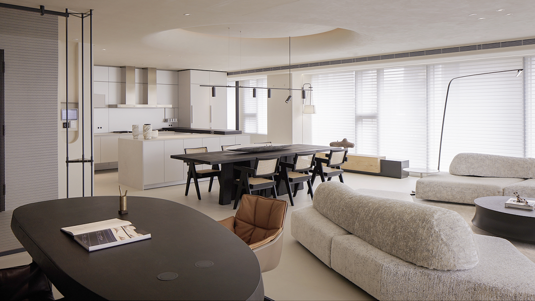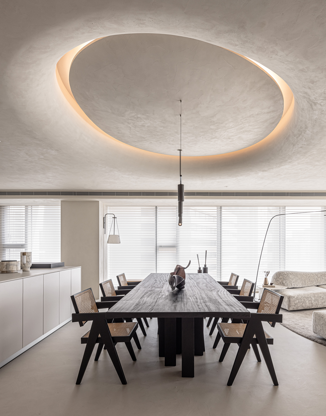 为了达至心灵与物理空间的双重自由,设计师将客厅、餐厅、厨房、阅读区、玄关等多个功能区域连成一体,创造空间与视野的自由与灵动,同时满足不同时间的不同需求。