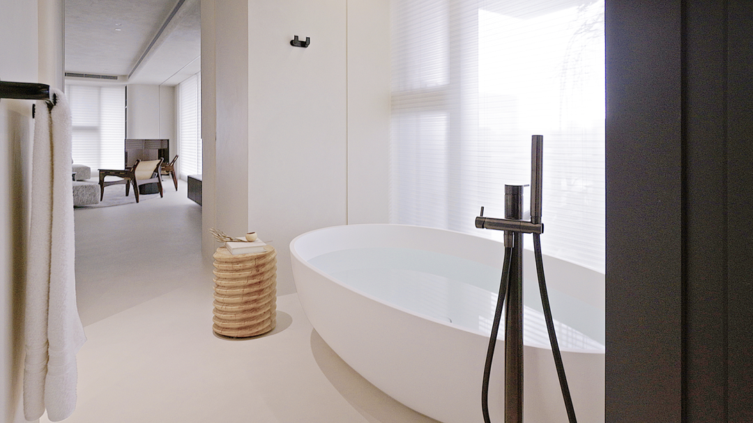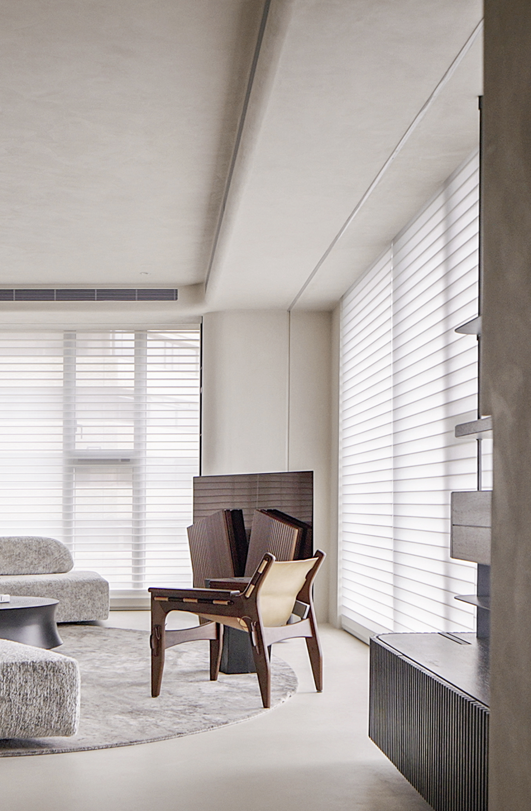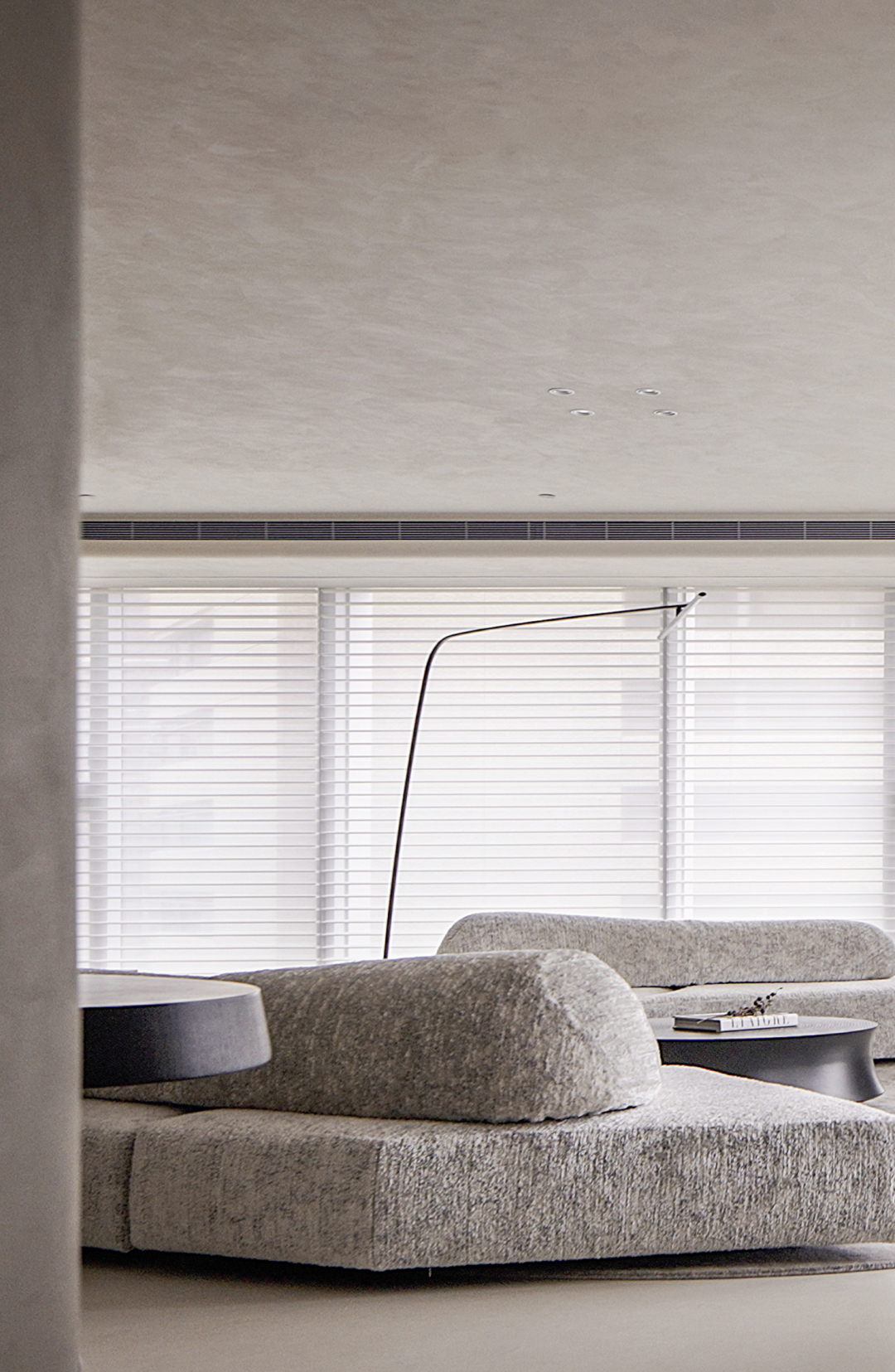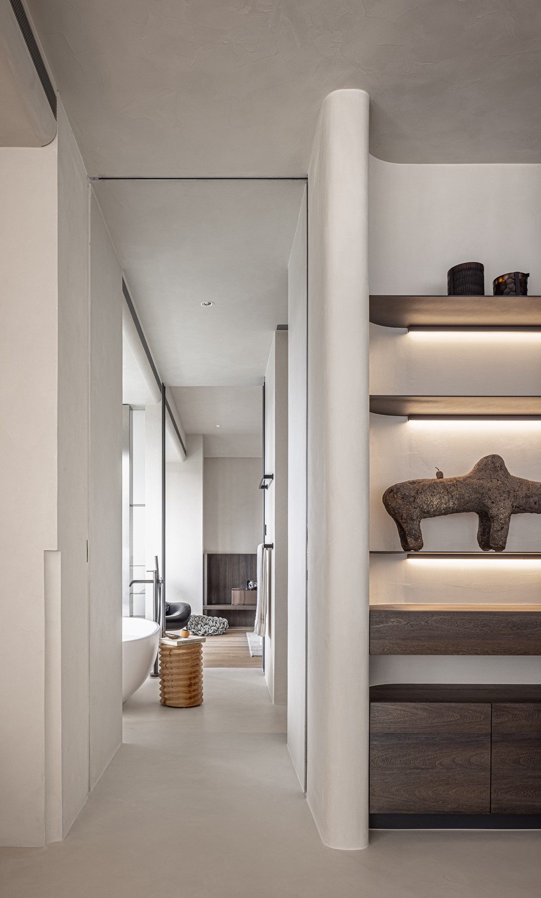 纯粹的美,是居住于纯粹形式的静谧世界。为了营造克制与内敛空间氛围,更好地回归生活的本真天、地、墙均采用同一色系的微水泥,水泥的施工讲究对材质的分量的拿捏,需要很长时间的反复试验才能达到最美地效果,一浅一深间描绘出大地细腻的痕迹,淡一重间刻画出精神的自由