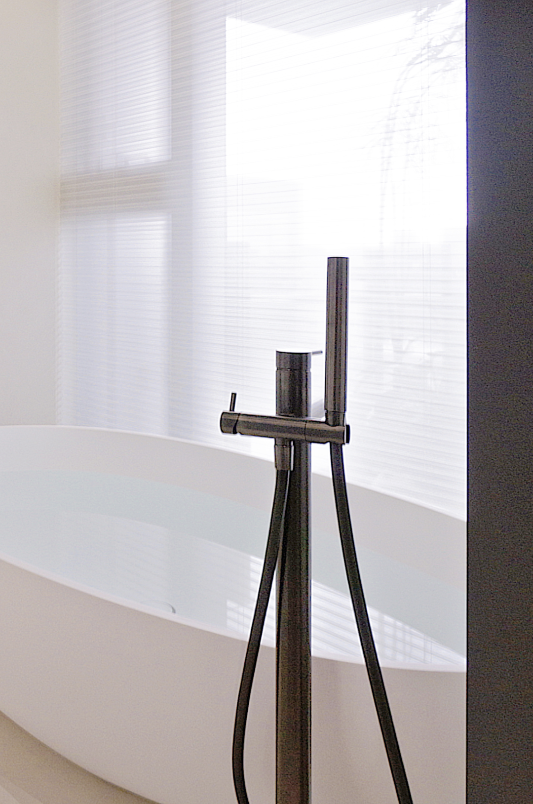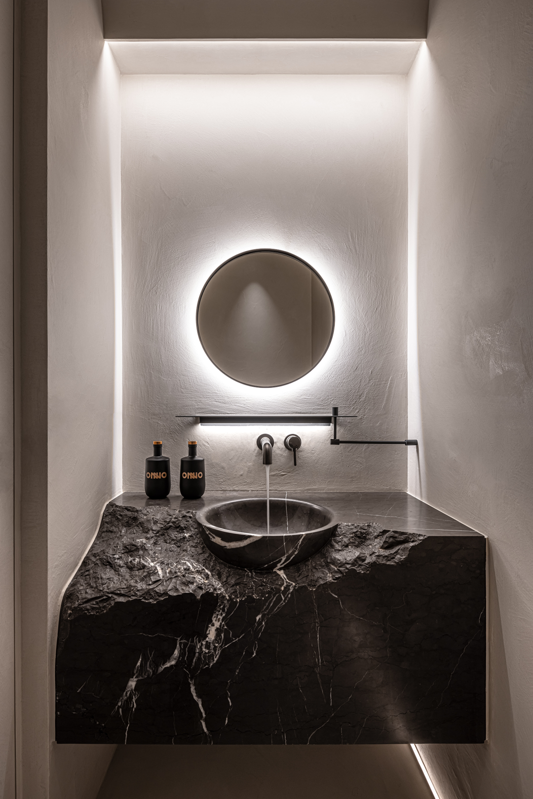 客卫的洗手台,设计师精心的设计,保留了精致与粗旷的双重属性,经过工匠打造过的大理石台面,创造出原生的艺术细部,圆形镜子和金属构件于细微间呈现出设计的用心,自然在无意识中释放了可贵的质朴。小小的客卫设计,却浸染着自然、工艺、人文与艺术。