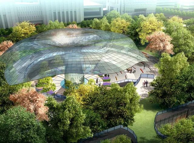 设计践行海绵城市理念,利用雨水花园、下沉式绿地等措施提升城市生态系统功能。林带保留原有高大乔木,让绿化景观与地下建筑、地铁、综合管廊有机结合,形成优美的景观环境和多元开放绿色空间,为周边企业和居民提供充满绿色科技的室外环境。