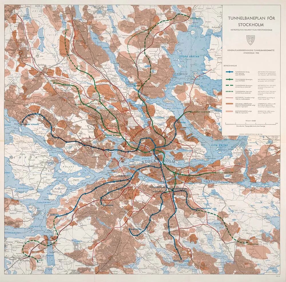 ▼ 1965年的斯德哥尔摩大都会轨道交通计划(来源:Wikipedia)