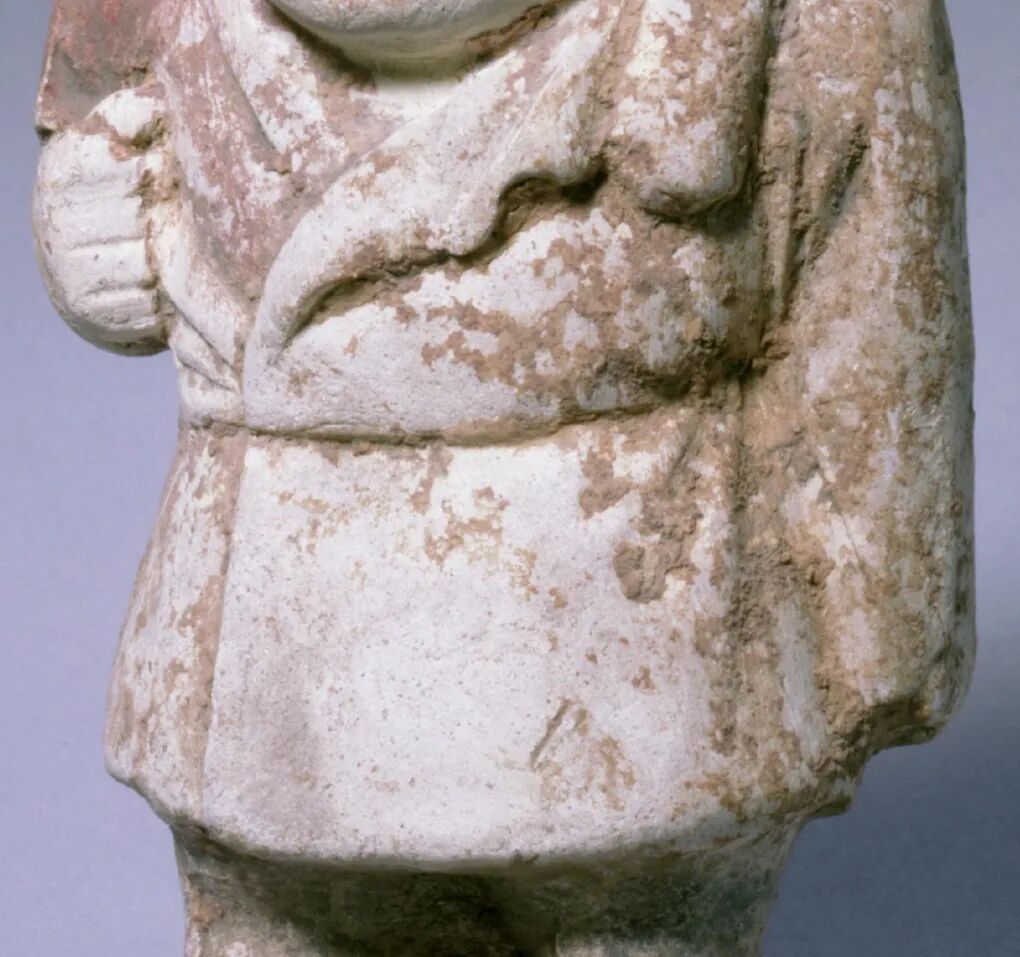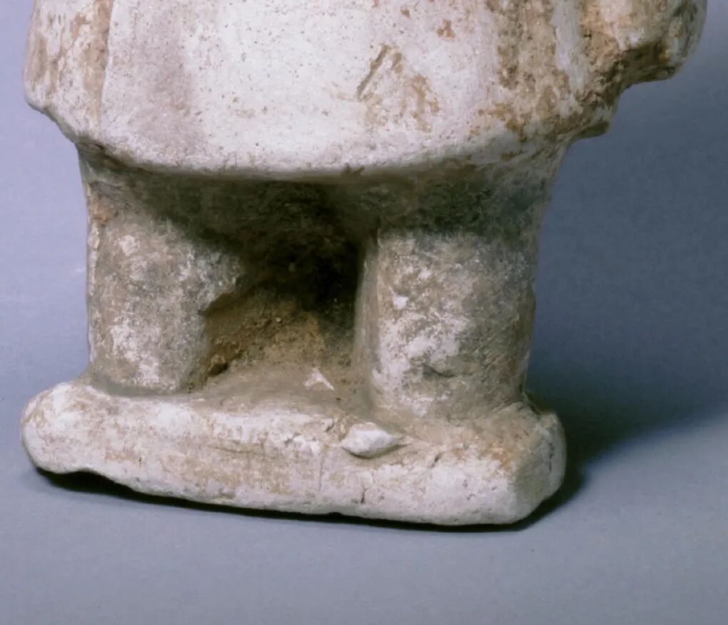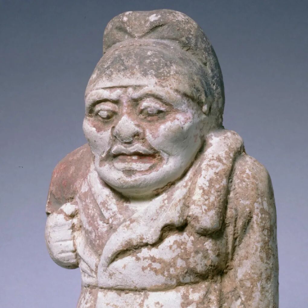 俑头戴黑色幞头,眉弓凸起,大眼圆睁,鼻头较粗上翘,阔口张开。上身内穿半袖衣,外穿翻领大衣,右袖脱下,斜系在腰间,左手下垂,右手握拳抬起。该俑头及上身较大,双腿较短,从形象上看应为一侏儒。唐朝侏儒一般为地方进贡,如道州居民身材短矮,每年都要向朝廷上贡,号为“矮奴”。