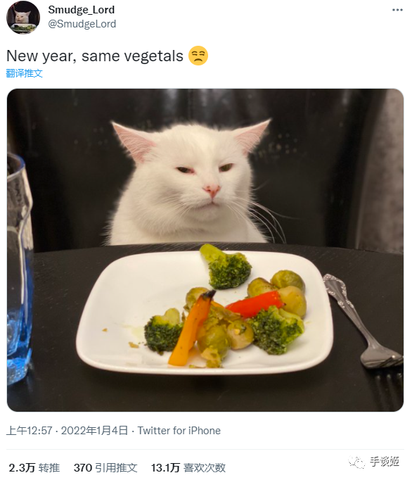1月4日,网络上著名的“讨厌蔬菜的猫”更新了它的抖音推特ins等社交账号,表示“新的一年来到了,还是讨厌蔬菜”,引起了又一波点赞和转发。