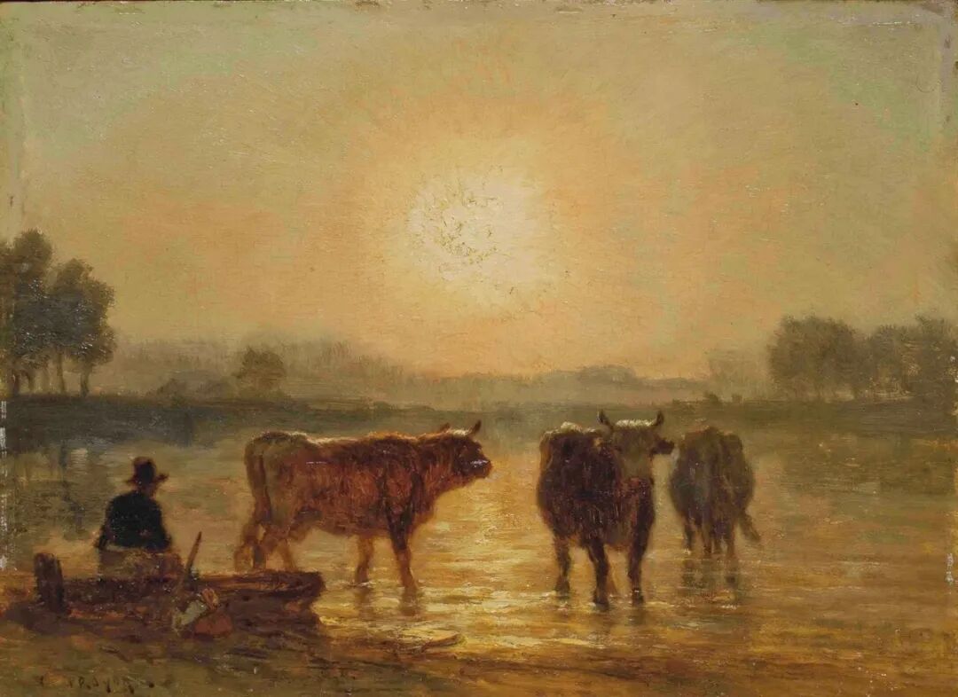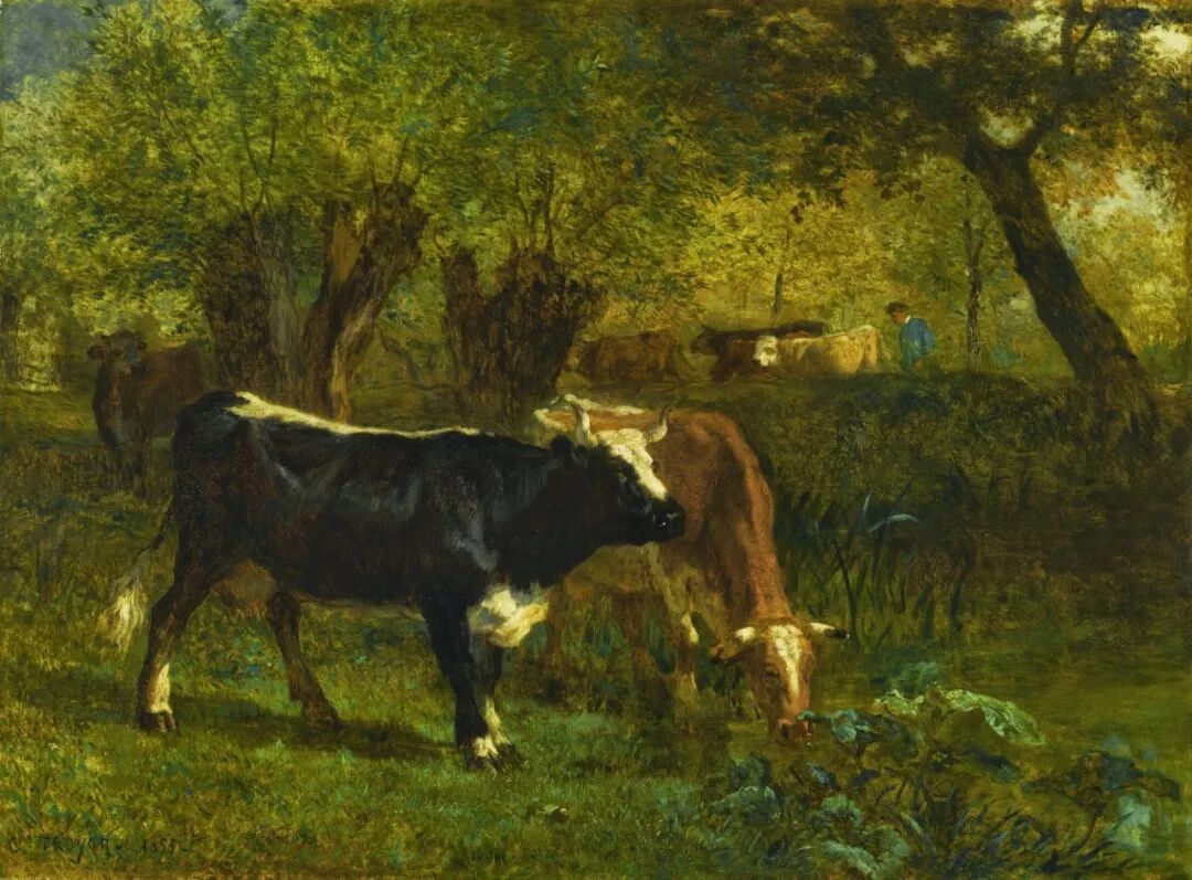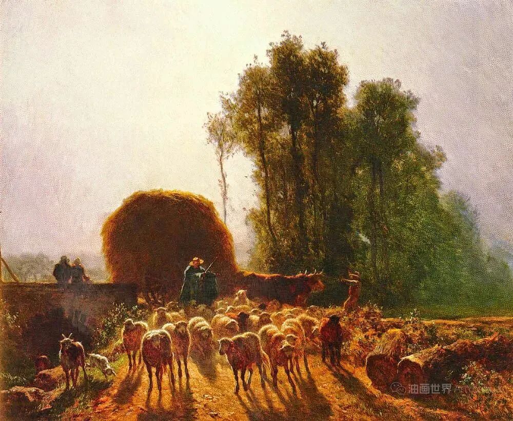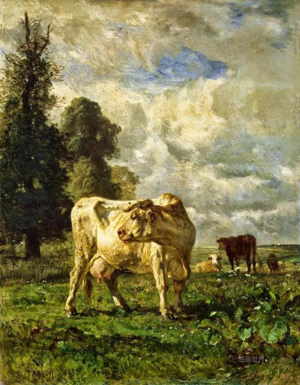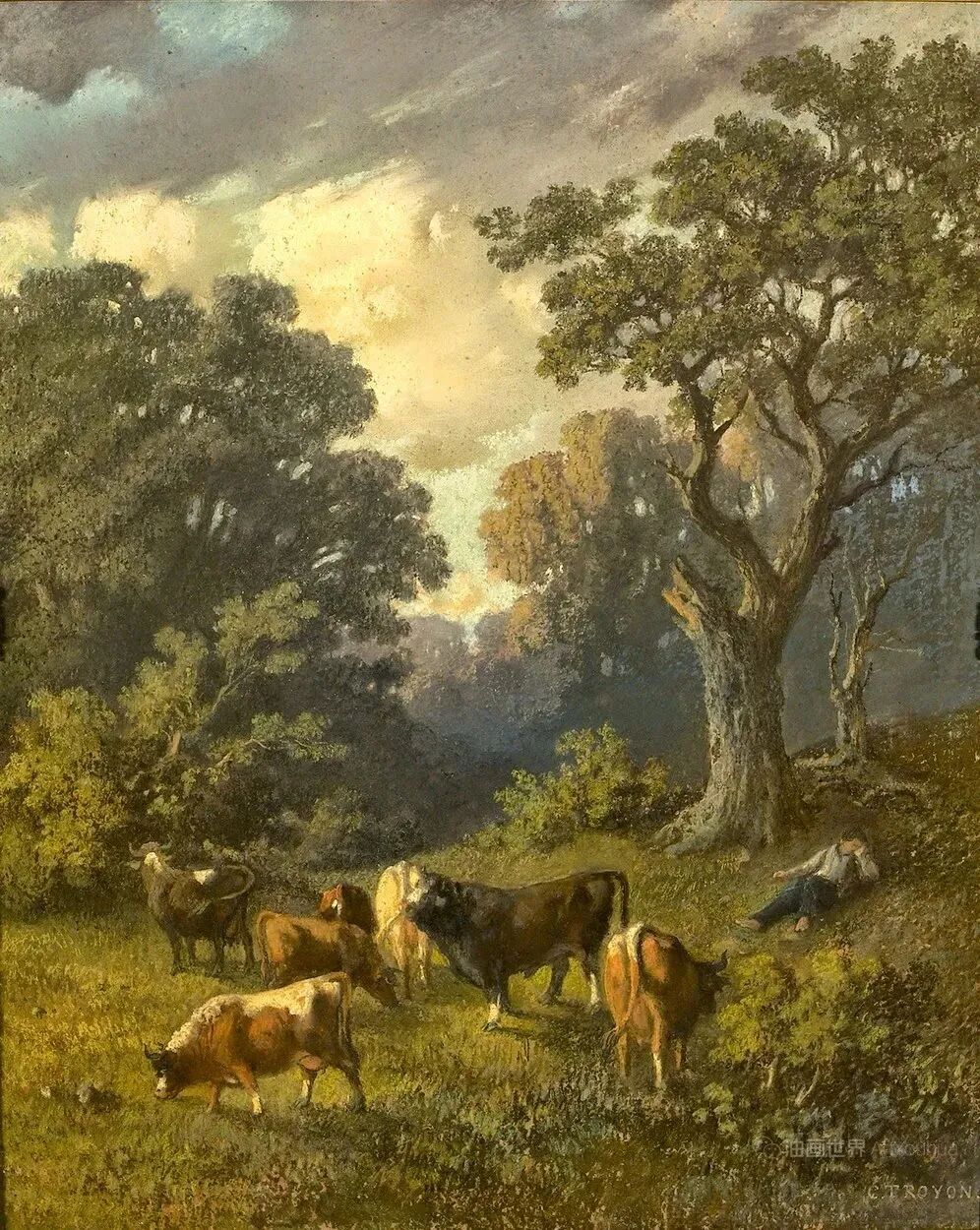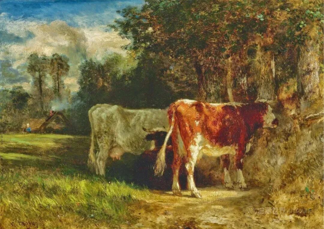 康斯坦·特罗雍(Constant Troyon,1810-1865年)是巴比松画派中擅长画有动物的风景画的法国画家,也喜欢描绘逆光中的景象。特罗雍的主要作品有《牛羊群》、《暴风雨将临》、《去耕作的牛群》、《晨光》等。