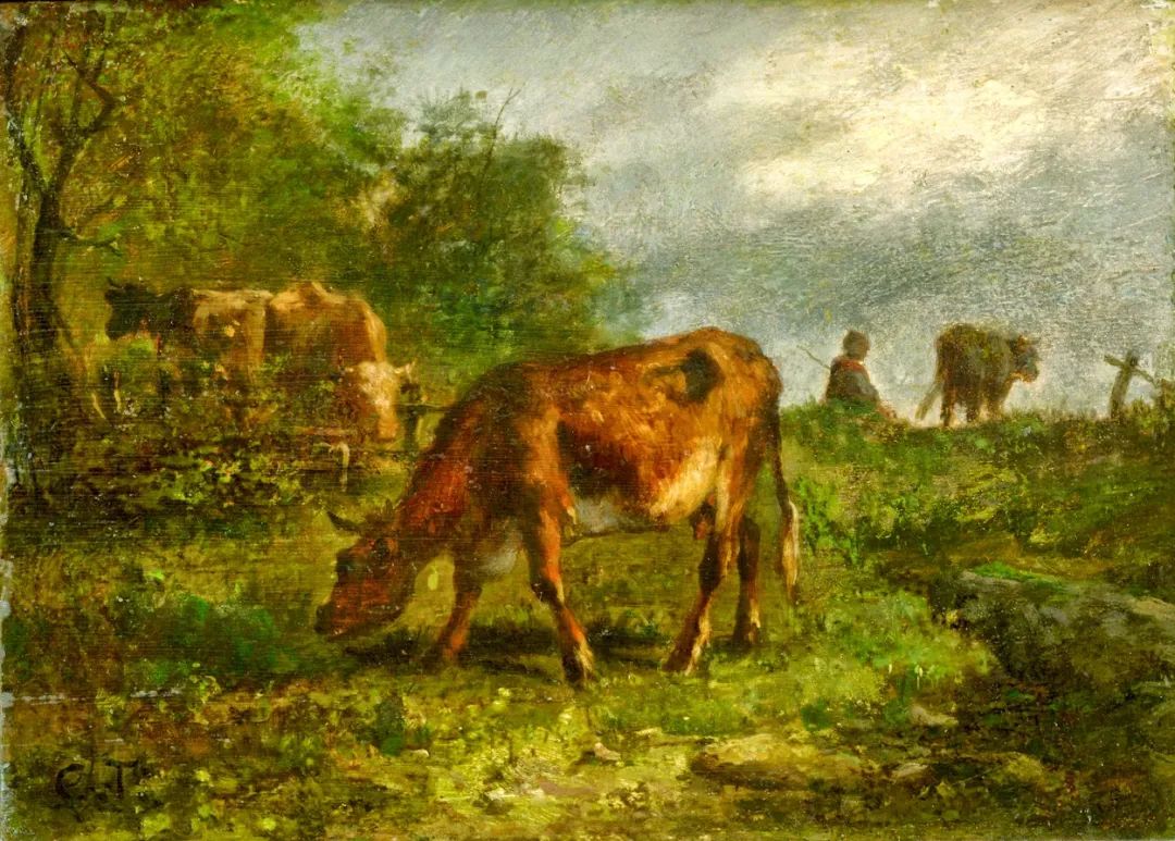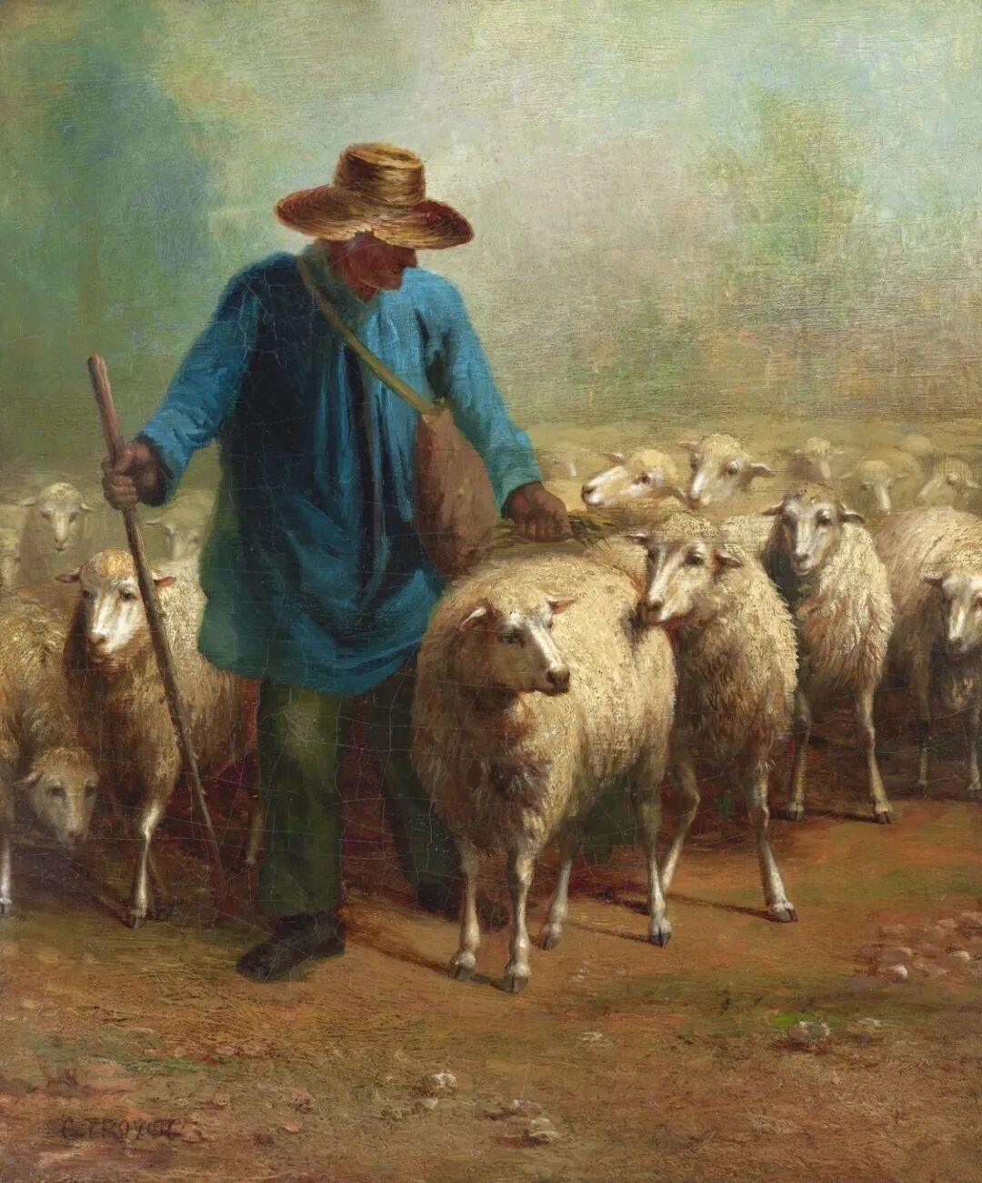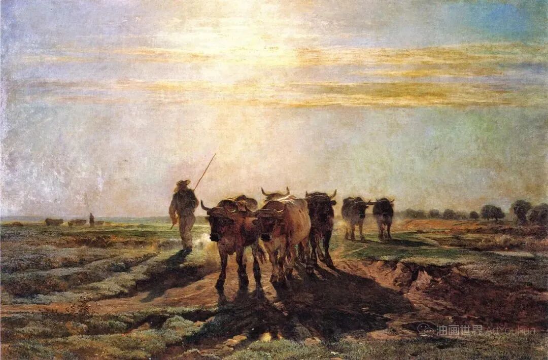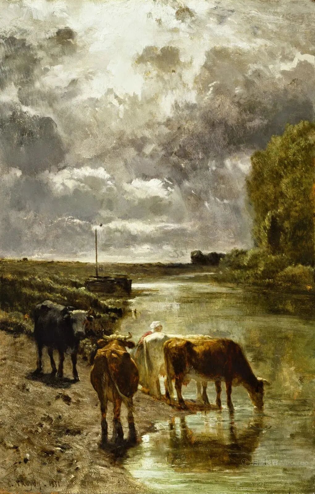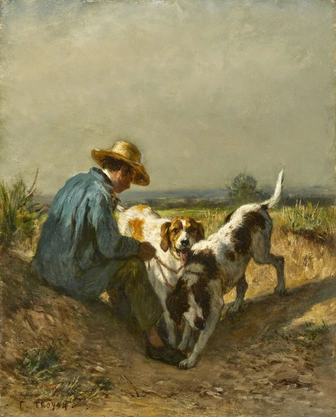 康斯坦·特罗雍(Constant Troyon,1810-1865年)是巴比松画派中擅长画有动物的风景画的法国画家,也喜欢描绘逆光中的景象。特罗雍的主要作品有《牛羊群》、《暴风雨将临》、《去耕作的牛群》、《晨光》等。