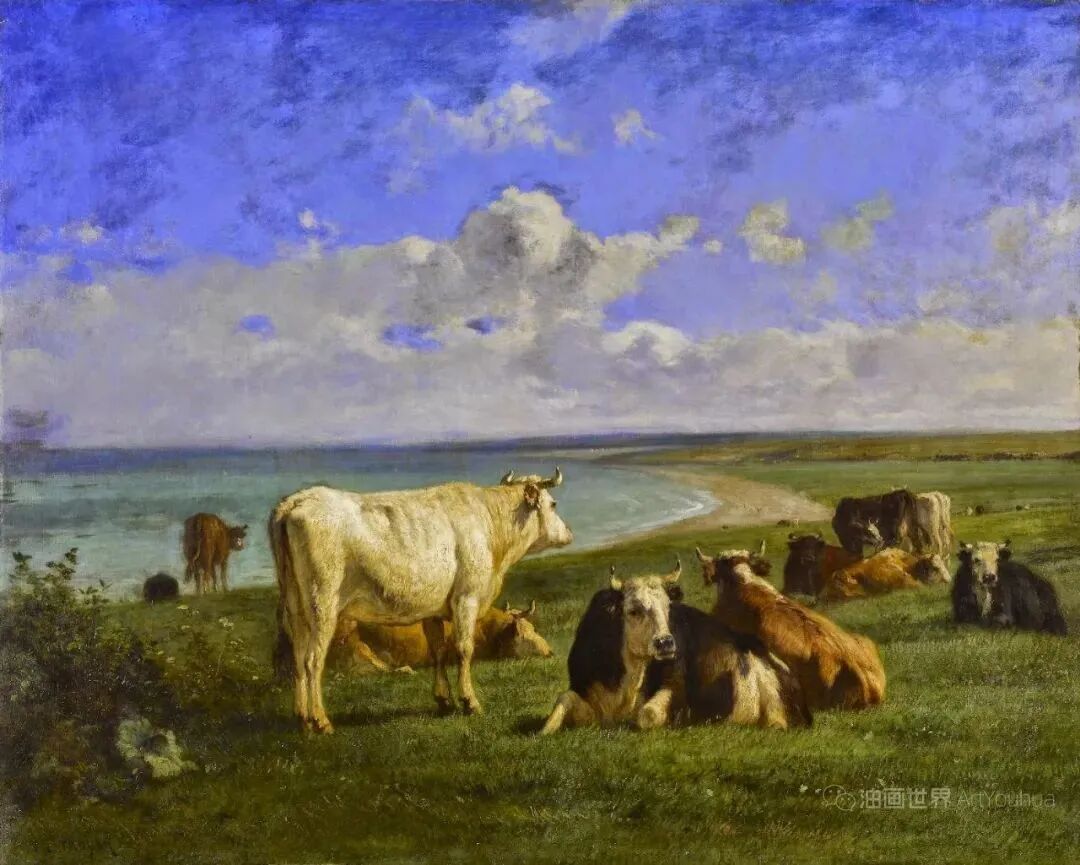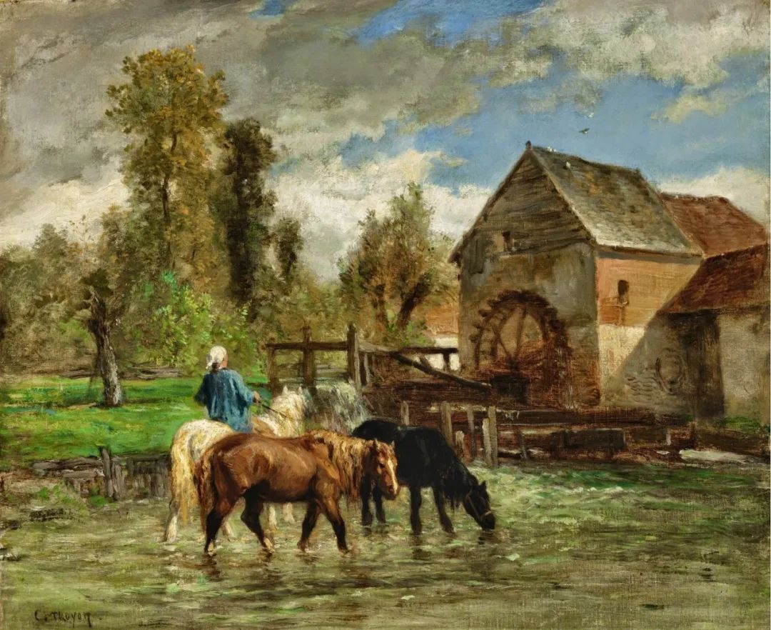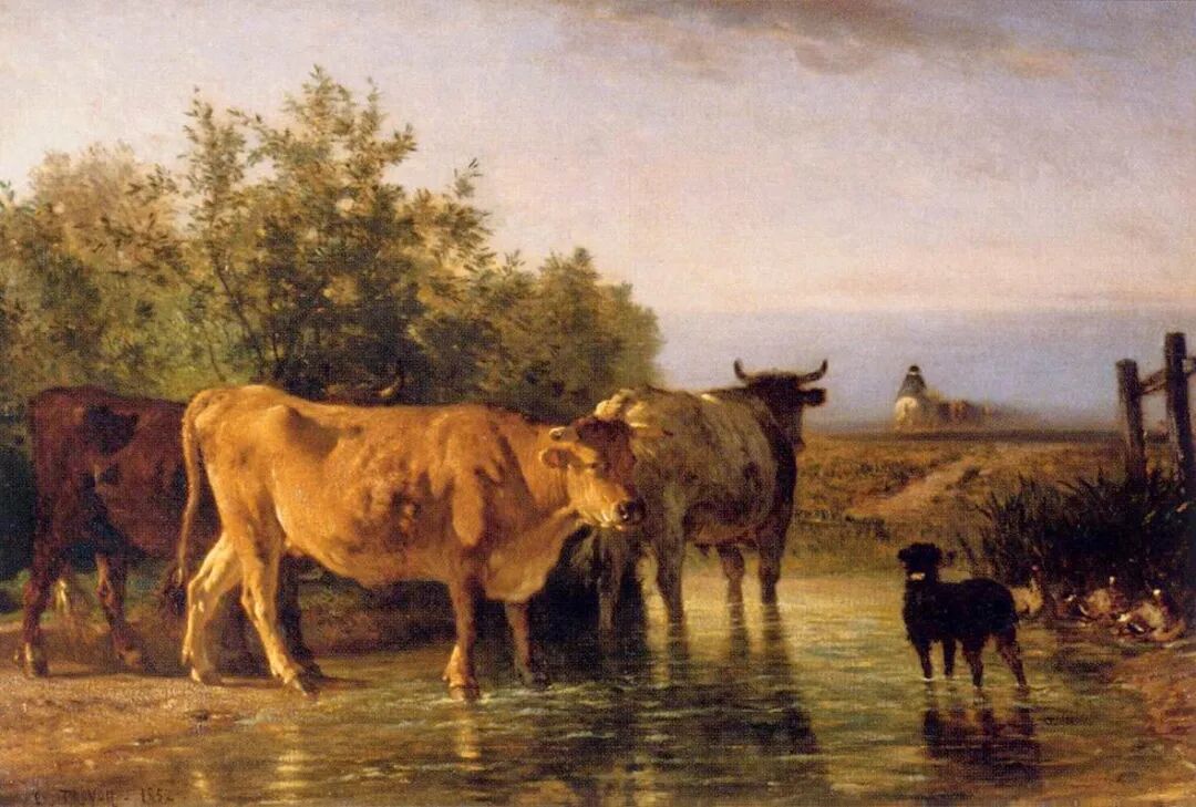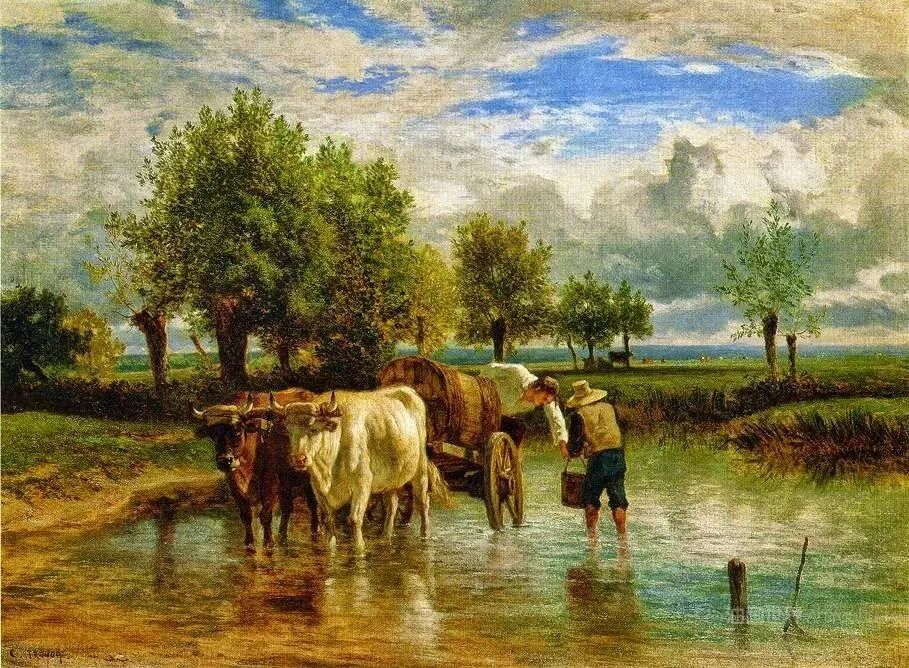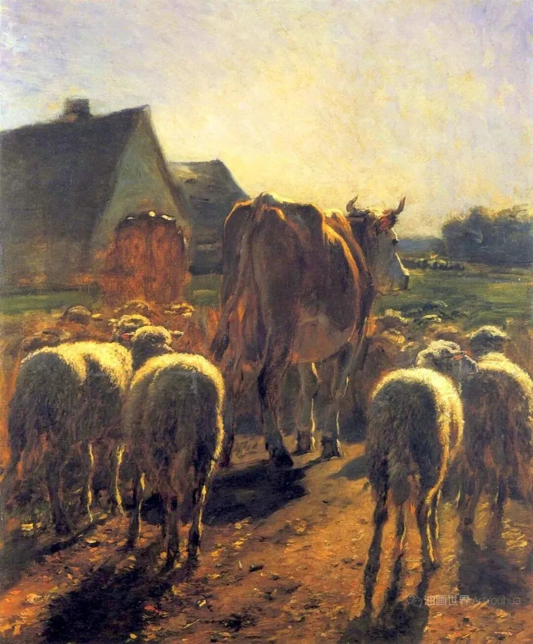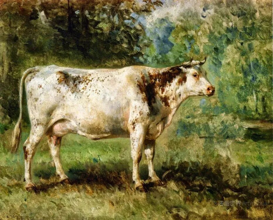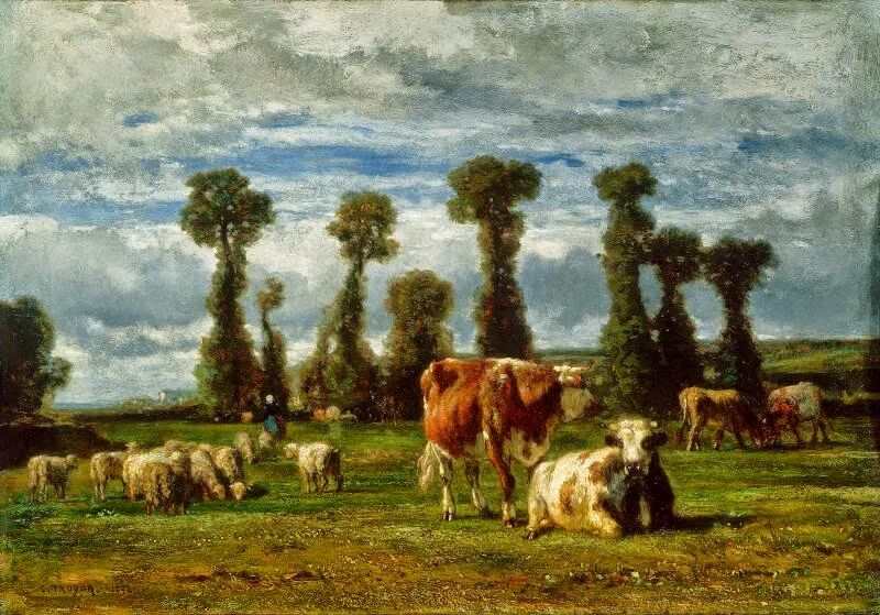 康斯坦·特罗雍(Constant Troyon,1810-1865年)是巴比松画派中擅长画有动物的风景画的法国画家,也喜欢描绘逆光中的景象。特罗雍的主要作品有《牛羊群》、《暴风雨将临》、《去耕作的牛群》、《晨光》等。