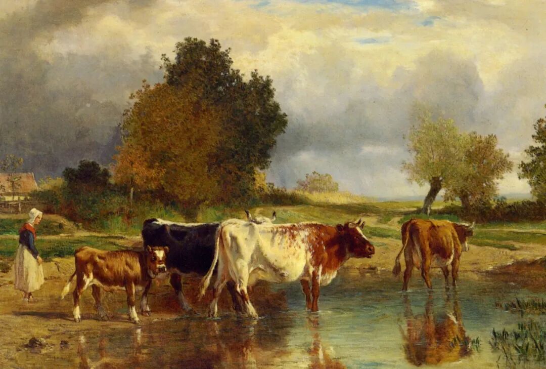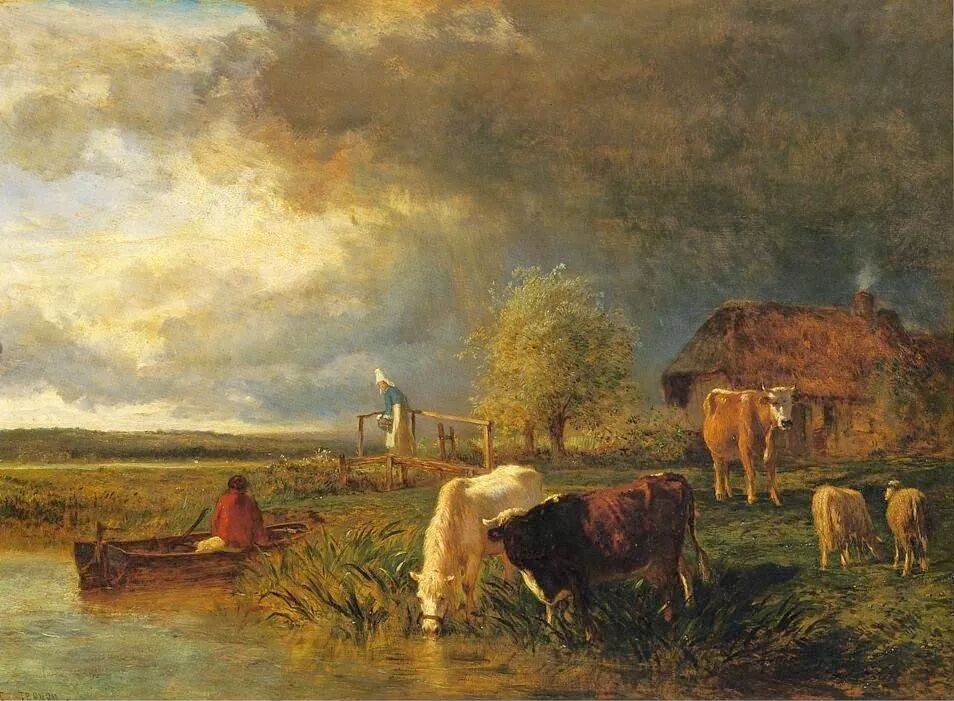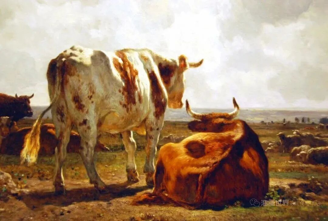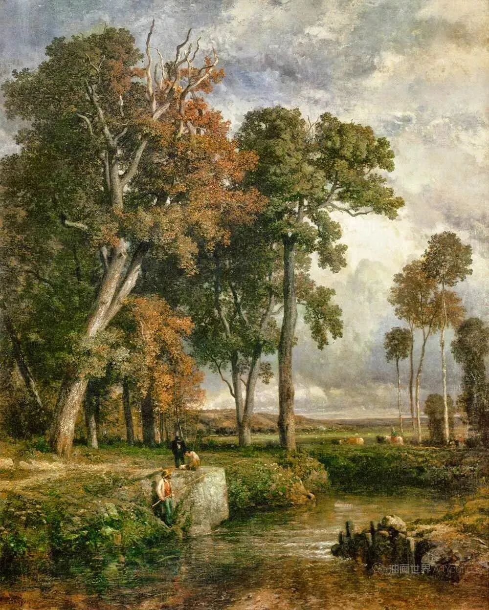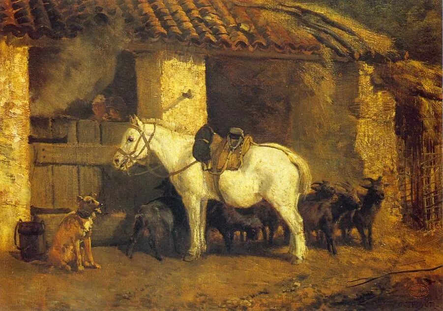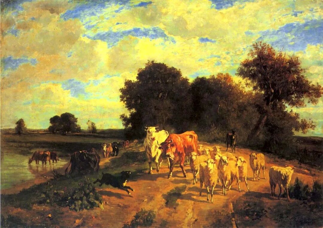 康斯坦·特罗雍(Constant Troyon,1810-1865年)是巴比松画派中擅长画有动物的风景画的法国画家,也喜欢描绘逆光中的景象。特罗雍的主要作品有《牛羊群》、《暴风雨将临》、《去耕作的牛群》、《晨光》等。