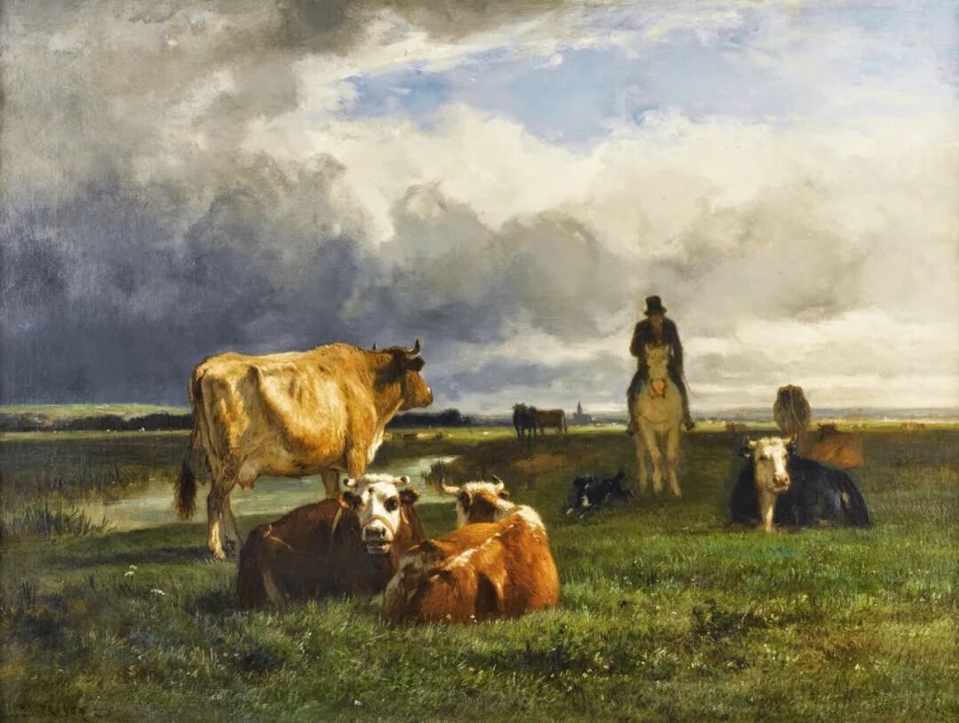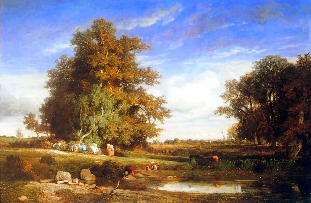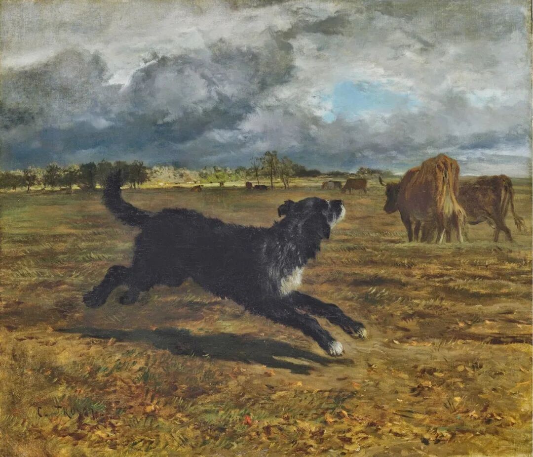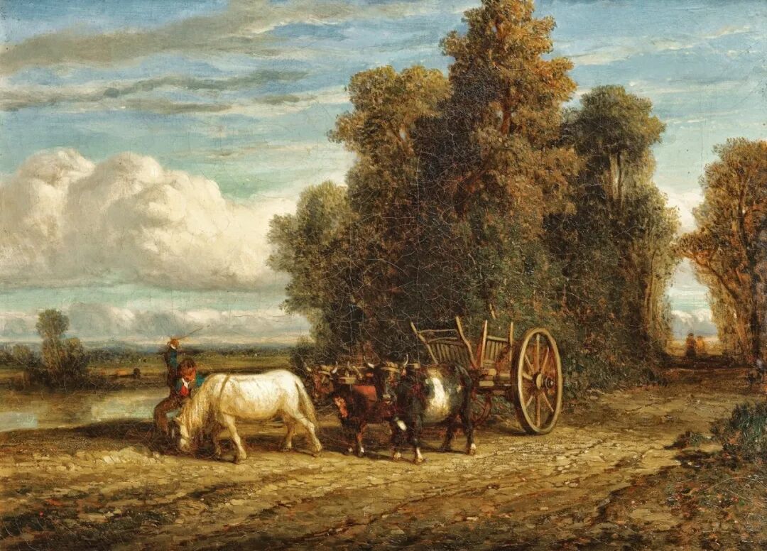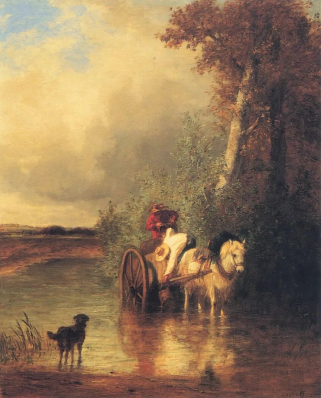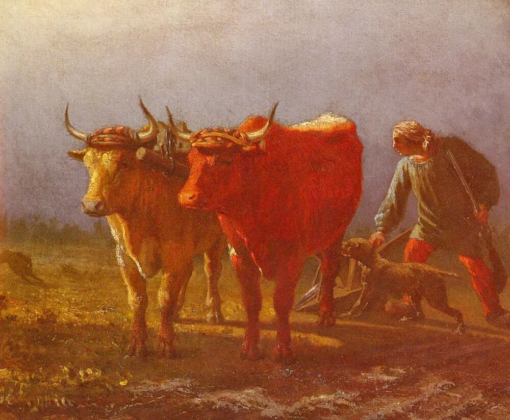 康斯坦·特罗雍(Constant Troyon,1810-1865年)是巴比松画派中擅长画有动物的风景画的法国画家,也喜欢描绘逆光中的景象。特罗雍的主要作品有《牛羊群》、《暴风雨将临》、《去耕作的牛群》、《晨光》等。