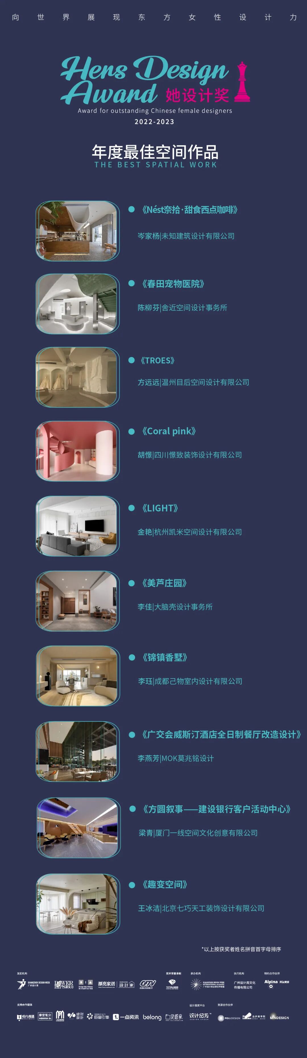 祝贺以上获得2022她设计奖·最佳空间作品的10位设计师!至此,2022她设计奖年度最佳作品榜单已经全部揭晓。这让我们看到了来自东方女性的设计力量,诠释着「她」独特的东方女性美学韵味。最终年度荣誉“2022她设计奖年度杰出女性人物”花落谁家呢?12月10日2022HDA她设计奖年度杰出女性人物颁奖典礼隆重揭晓,敬请期待!