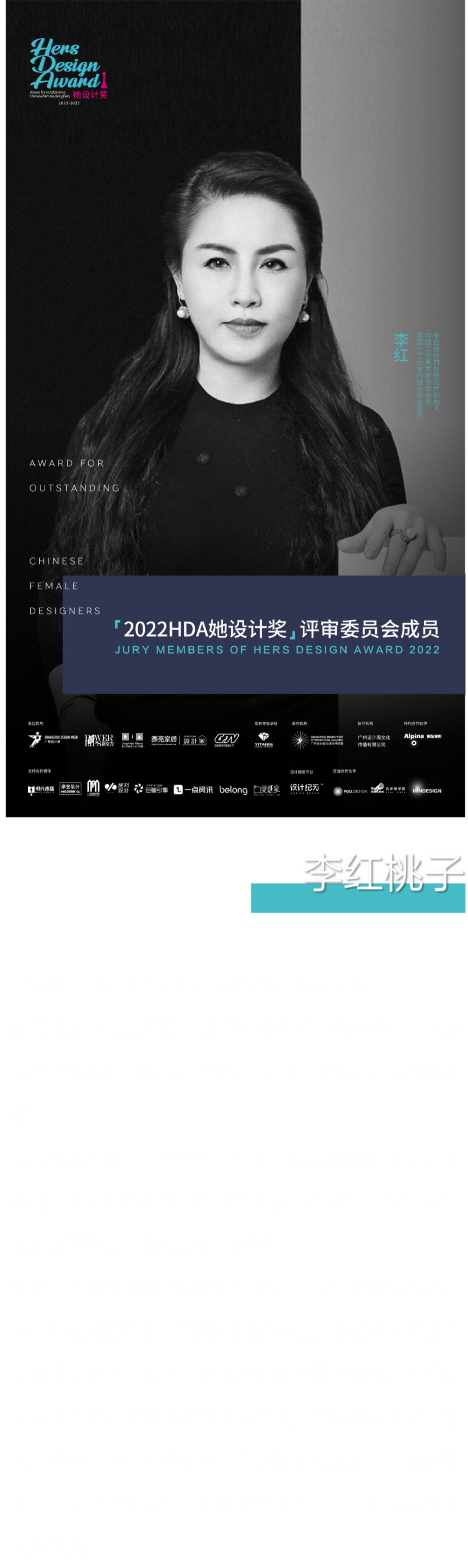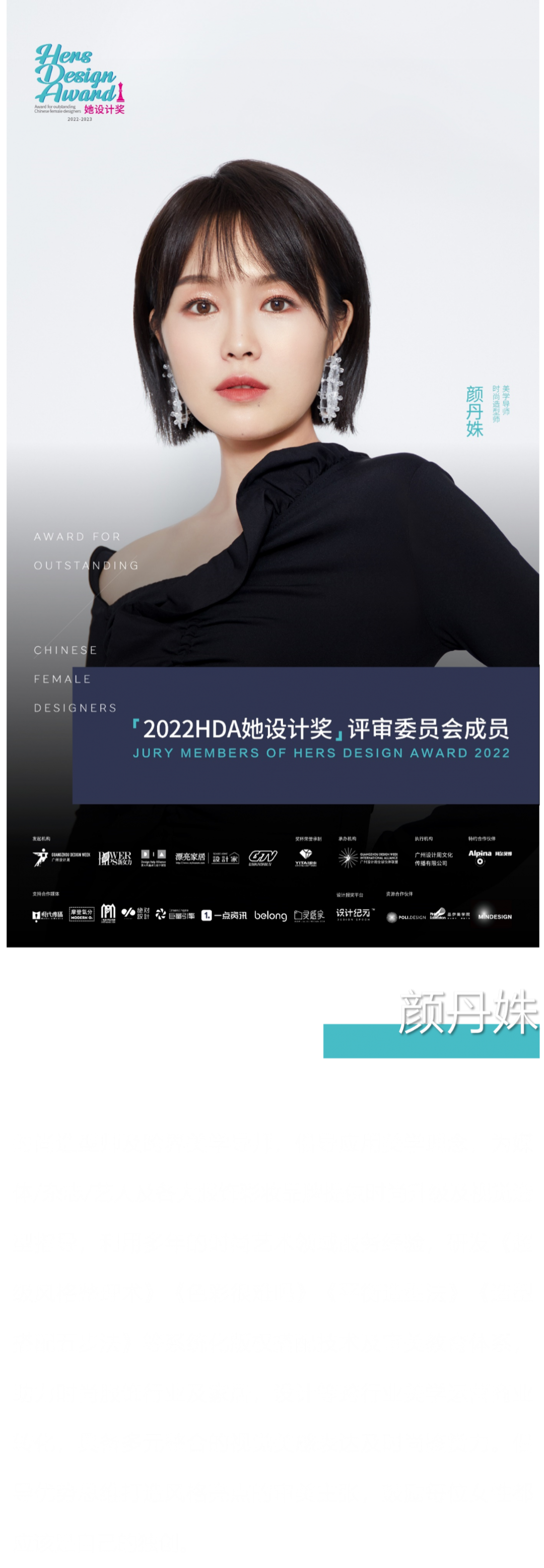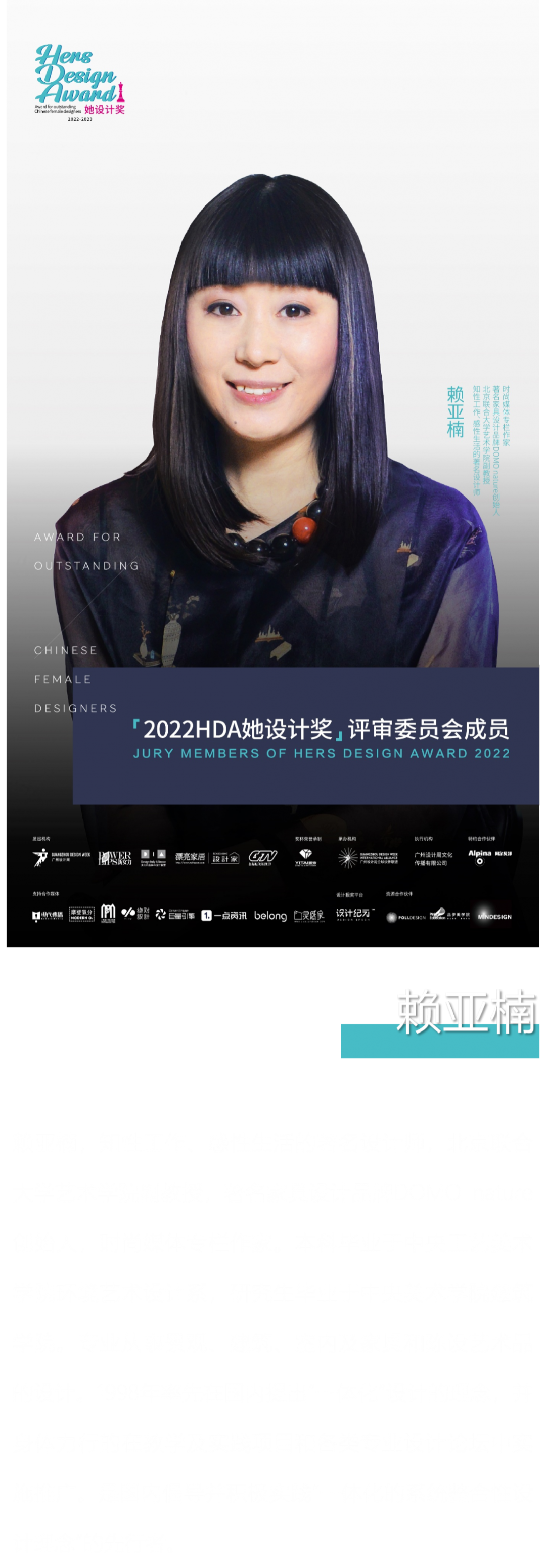 赖亚楠,刘姮,李燕,钟华,邓丽司,颜丹姝,李红,李国华,Mari Sasaki,Giulia Gerosa,Francesca Portesine,Sarah Khoo邱美玲12位来自不同领域的行业精英组成了2022HDA她设计奖的评委阵容,共同发掘更多优秀的东方女性设计师!