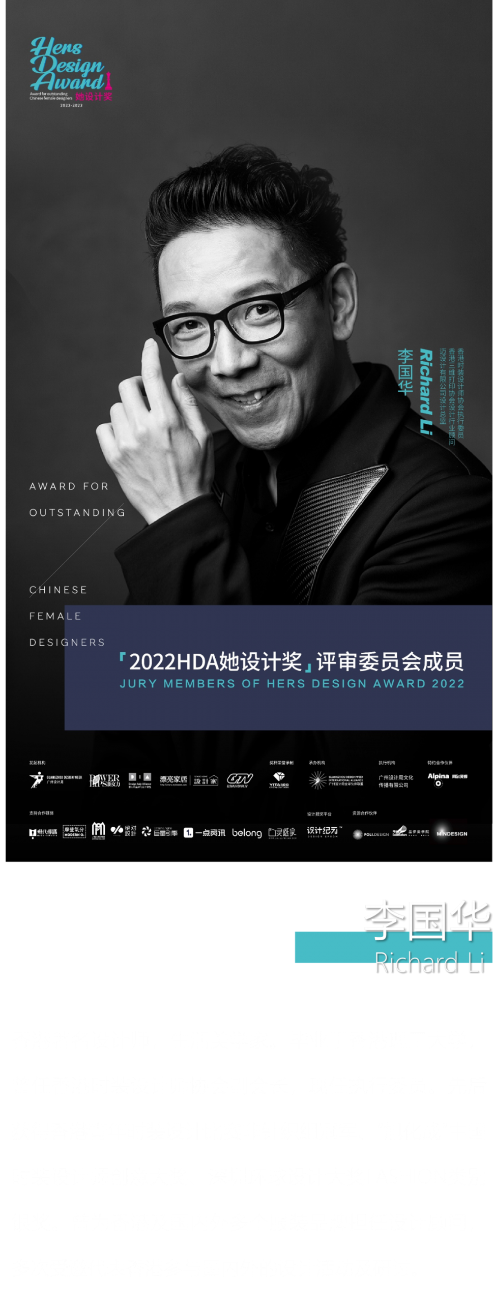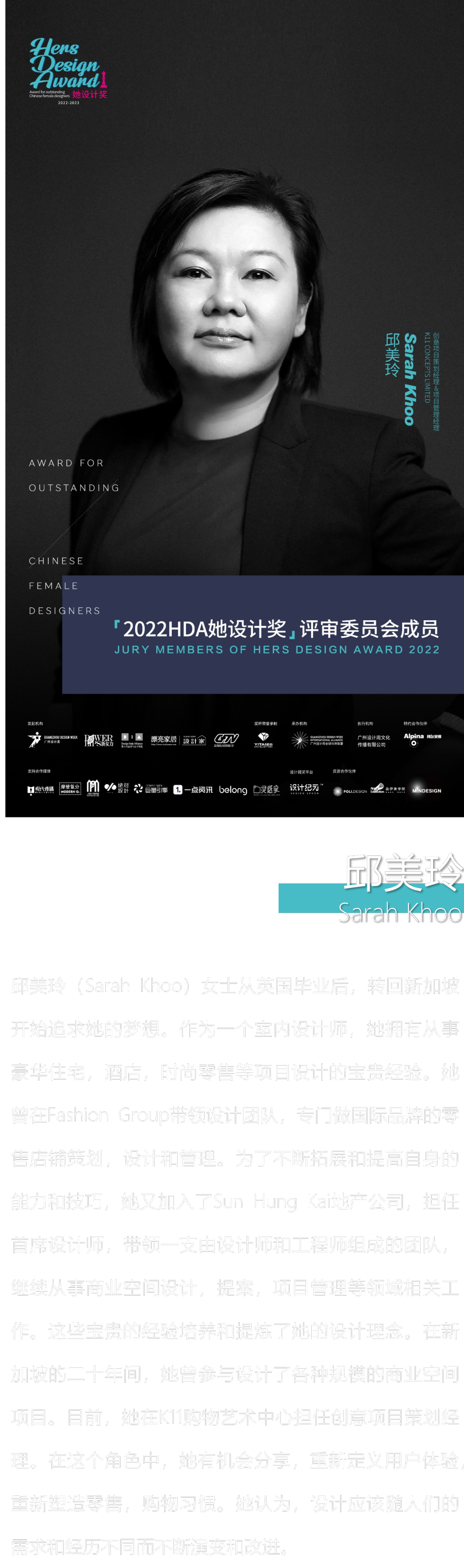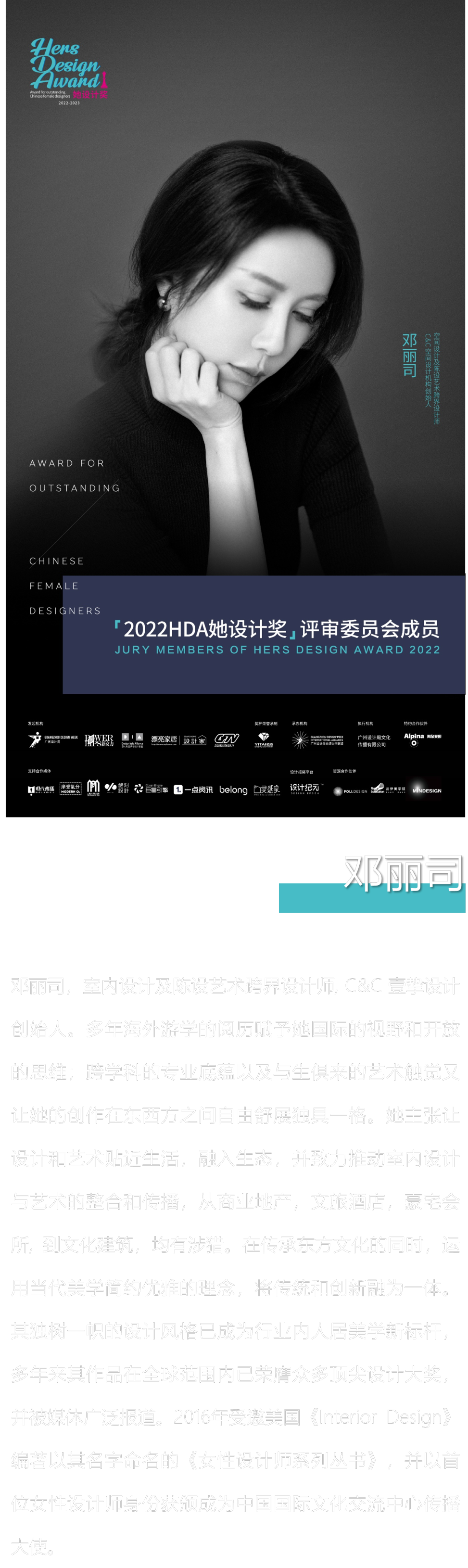 赖亚楠,刘姮,李燕,钟华,邓丽司,颜丹姝,李红,李国华,Mari Sasaki,Giulia Gerosa,Francesca Portesine,Sarah Khoo邱美玲12位来自不同领域的行业精英组成了2022HDA她设计奖的评委阵容,共同发掘更多优秀的东方女性设计师!