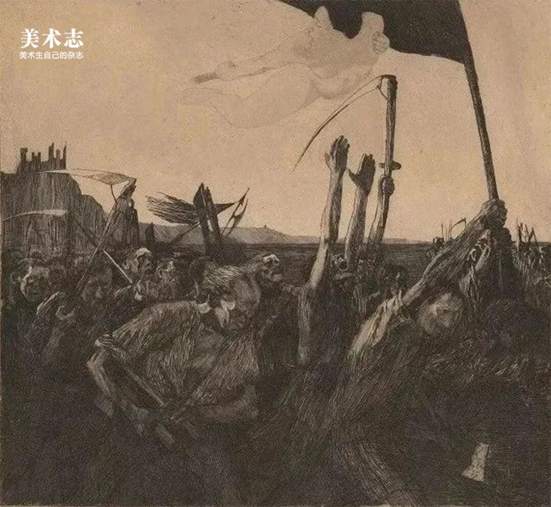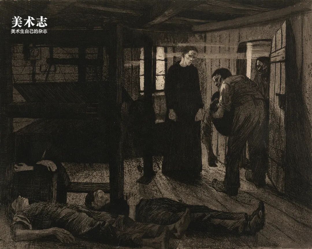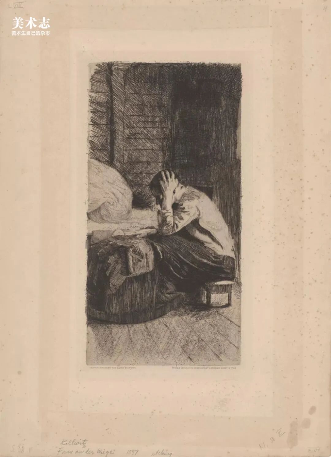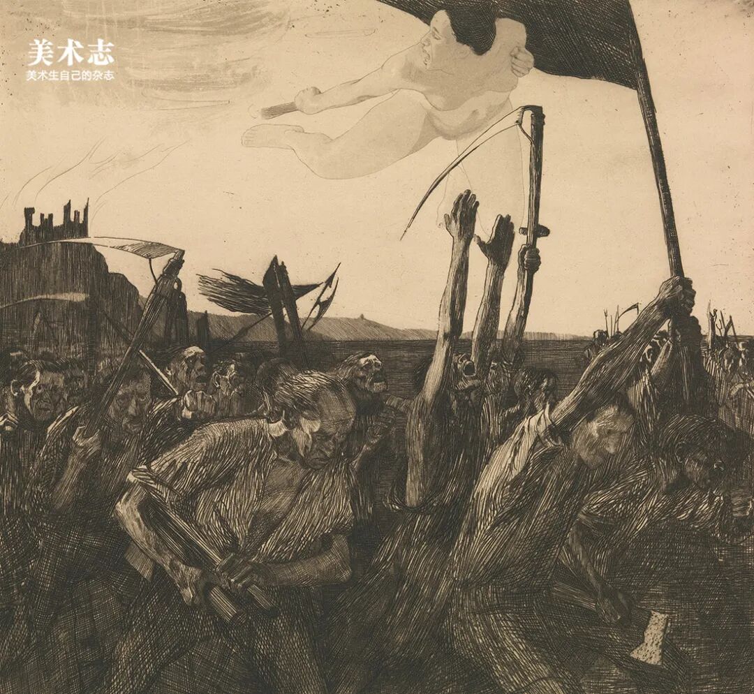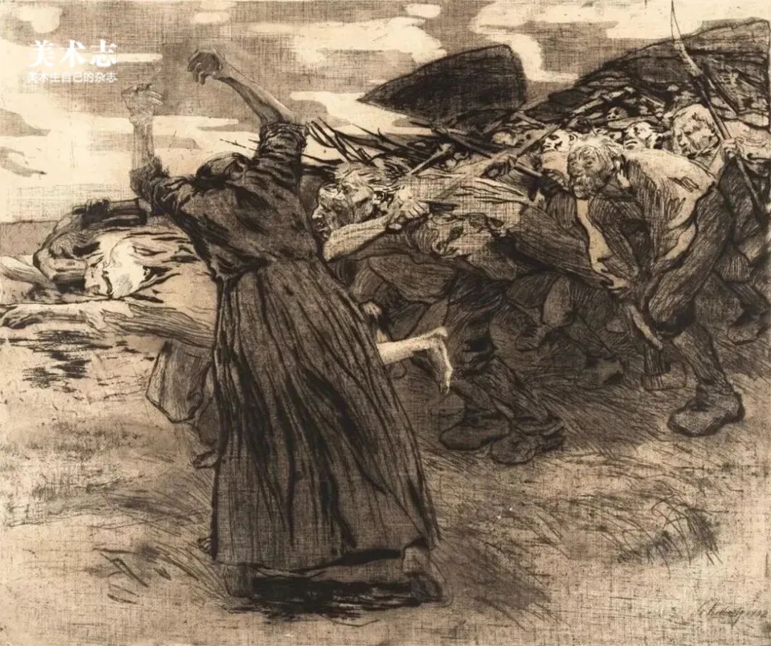 当时的德国正处于转型期,新兴资本家与无产阶级矛盾尖锐。资本家无情地剥削没有相应法律保护的工人,而工人的反抗、罢工却被普鲁士专制政府血腥镇压。珂勒惠支用自己独特的女性视角创作了《织工的反抗》组画,并被冠以“社会主义艺术家”的头衔。“织工起义”(Ein Weberaufstand)和“农民战争”(Bauernkrieg)是她探索社会不公现象的两大系列,呈现了一种时刻存在的死亡意识,尤其是作为一位母亲的哀痛。