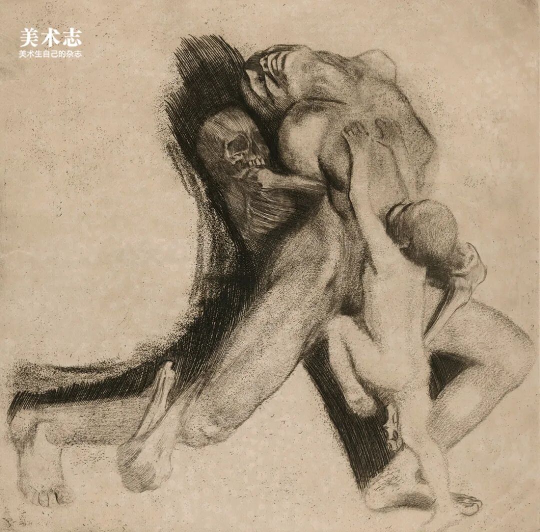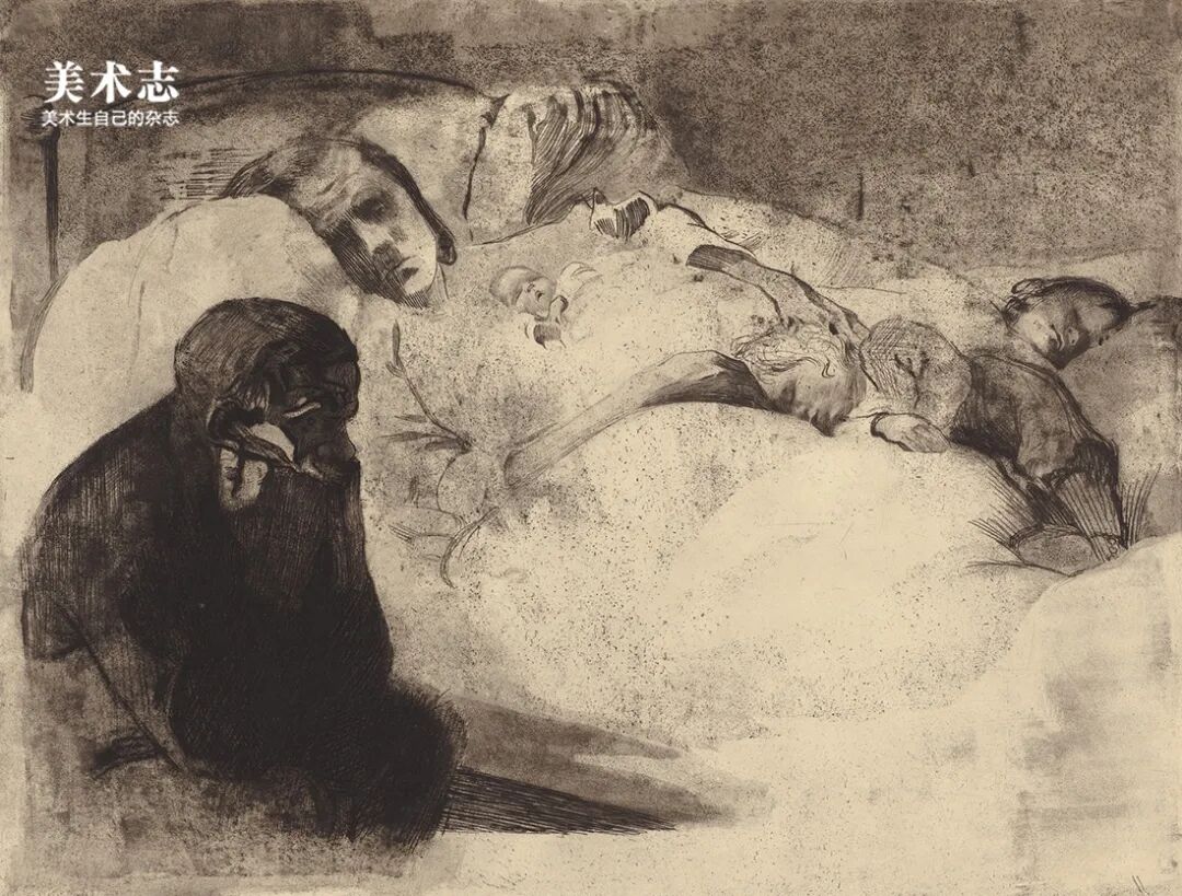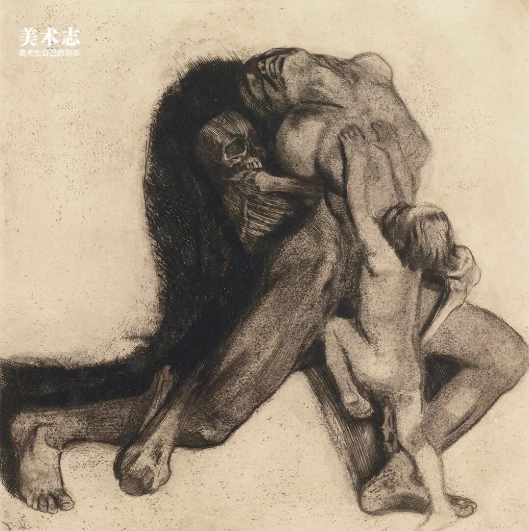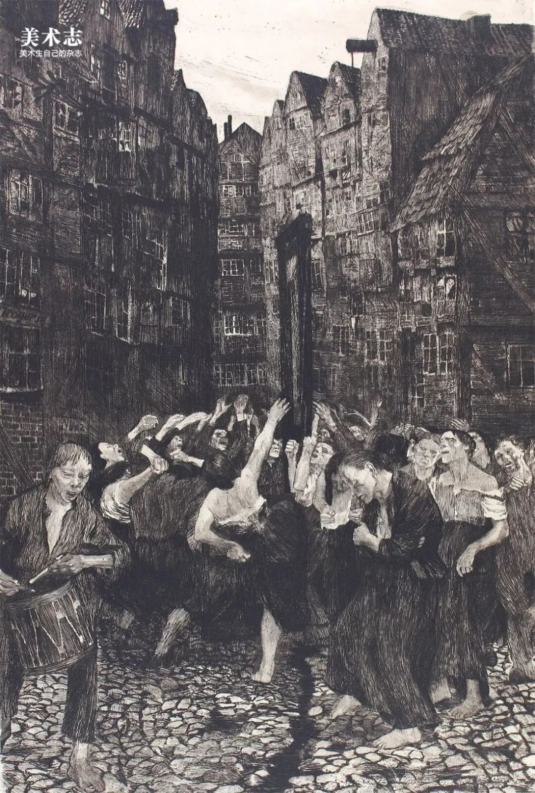 当时的德国正处于转型期,新兴资本家与无产阶级矛盾尖锐。资本家无情地剥削没有相应法律保护的工人,而工人的反抗、罢工却被普鲁士专制政府血腥镇压。珂勒惠支用自己独特的女性视角创作了《织工的反抗》组画,并被冠以“社会主义艺术家”的头衔。“织工起义”(Ein Weberaufstand)和“农民战争”(Bauernkrieg)是她探索社会不公现象的两大系列,呈现了一种时刻存在的死亡意识,尤其是作为一位母亲的哀痛。