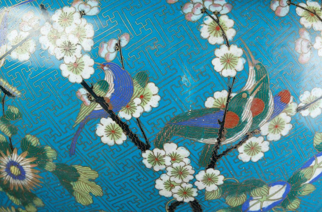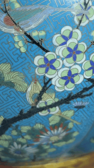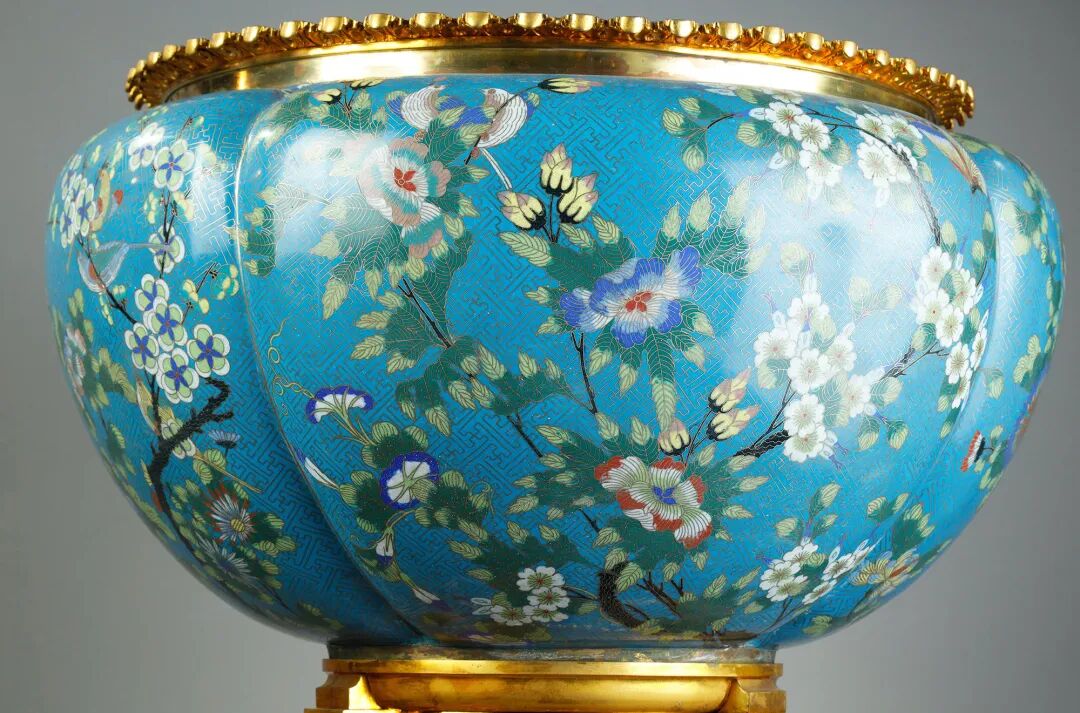 花盆主体为鲜丽蓝釉地,以铜胎掐丝,勾勒精致繁盛的东方富贵花鸟,雅致纹理娟丽秀巧,不论外形、工艺、用色还是纹样的刻画,处处可圈可点。