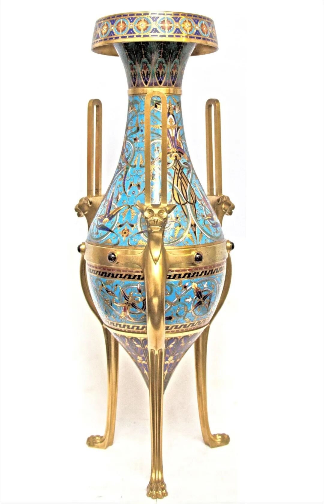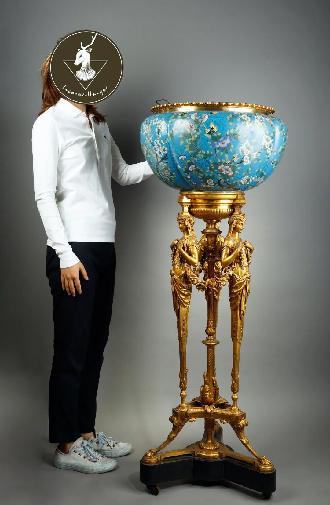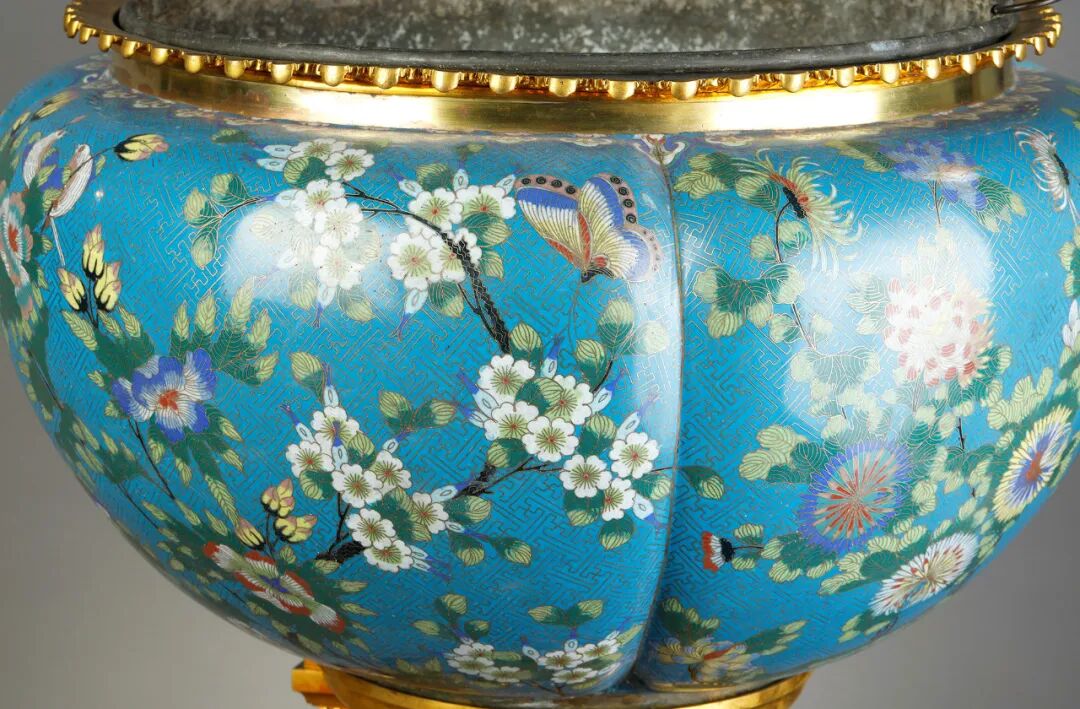 如此独特的一件古董花盆架整体纤长高挑,器形圆融优雅,精湛掐丝珐琅工艺源自中国,再以法式铜鎏金装饰,推测出自19世纪著名铸铜工坊Barbedienne之手。