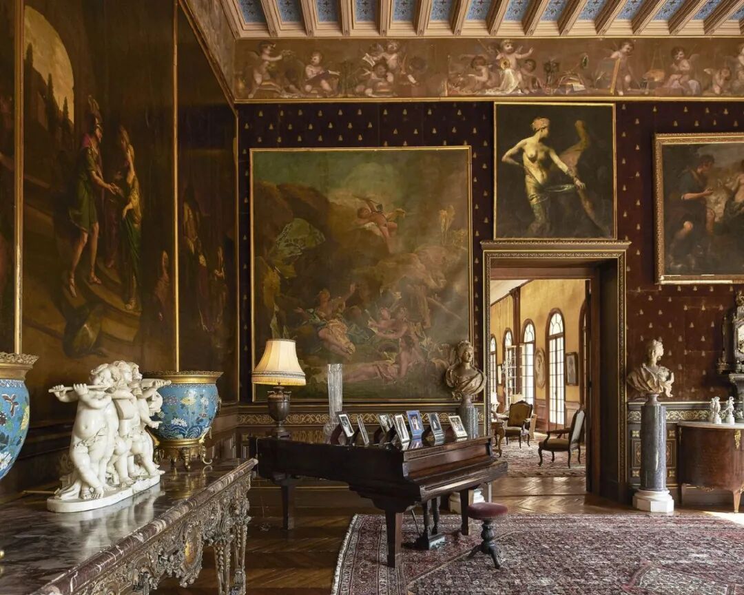 与此同时,在这场空前盛大的东方盛宴中,不同文化的交融也成为了装饰艺术的聚焦点。在古雅的青花瓷、粉彩瓷及掐丝珐琅器上,由欧洲匠人精妙打造的鎏金雕饰承载着西方神话纹样,与中国器皿合二为一,将奢华宅邸衬得堂皇瑰丽。