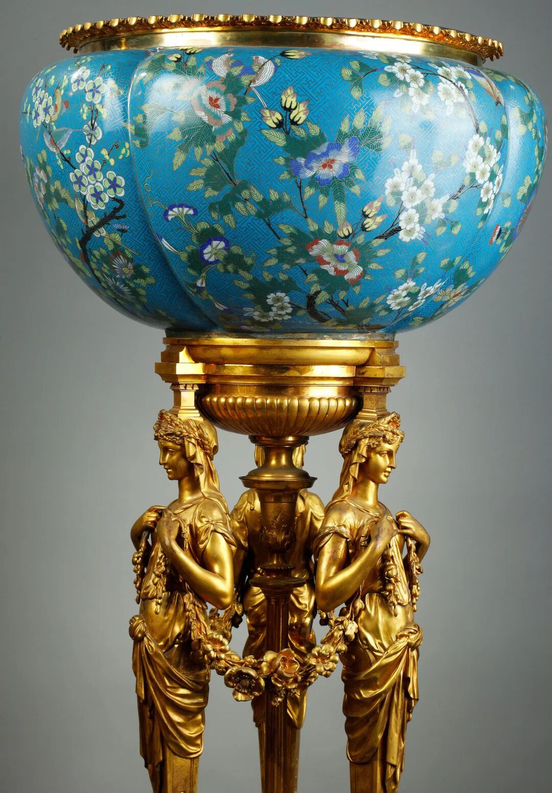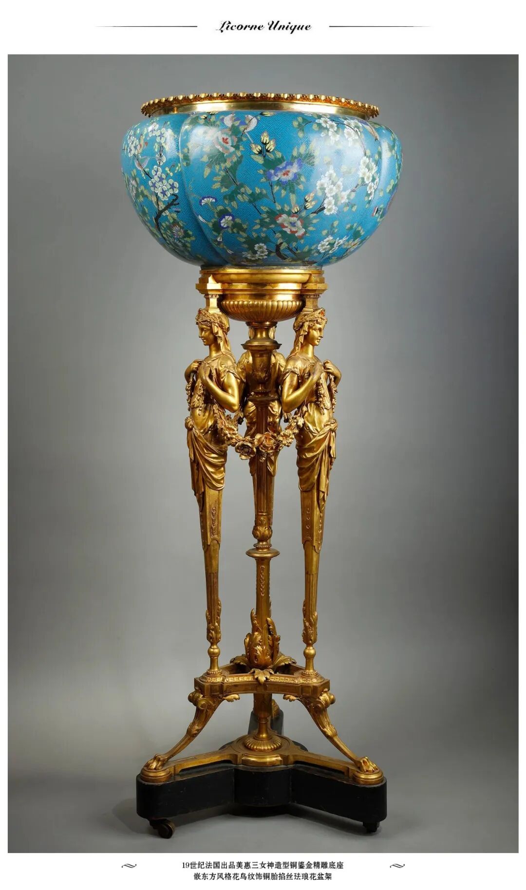 小鹿今日臻选的这件来自19世纪法国出品美惠三女神造型铜鎏金精雕底座嵌东方风格花鸟纹饰铜胎掐丝珐琅花盆架,正是彼时东西方艺术交流与融合的时代见证。从珐琅彩工艺到鎏金雕琢,无一不精彩绝伦。