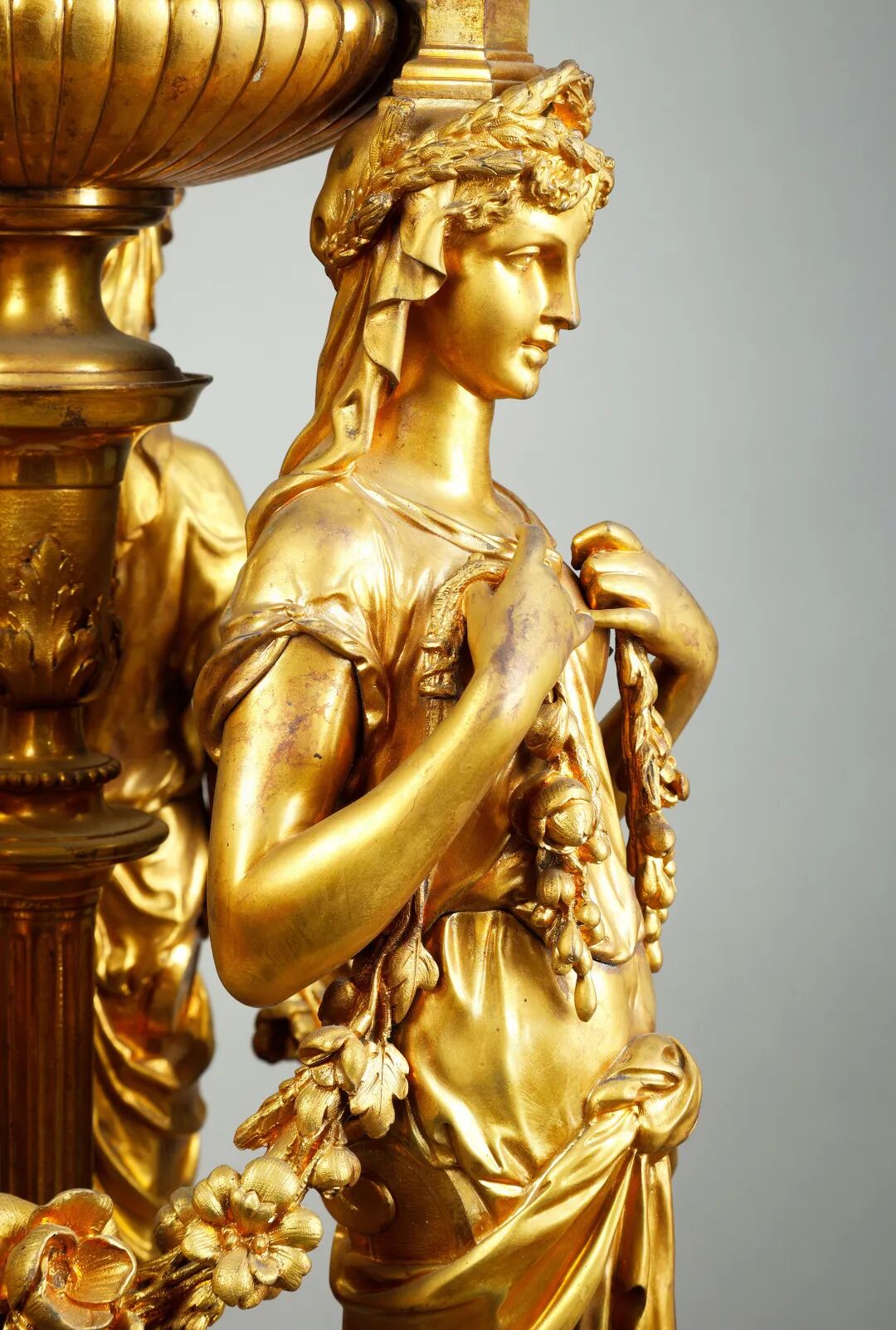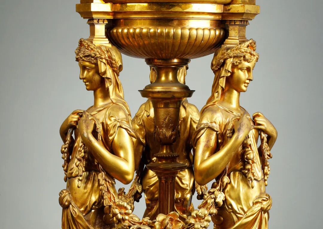 花盆架底座上,匠人以璀璨华美的金色,再现了古希腊神话中的美惠三女神,整体布局端丽大气,雕塑刻画精致而美好。