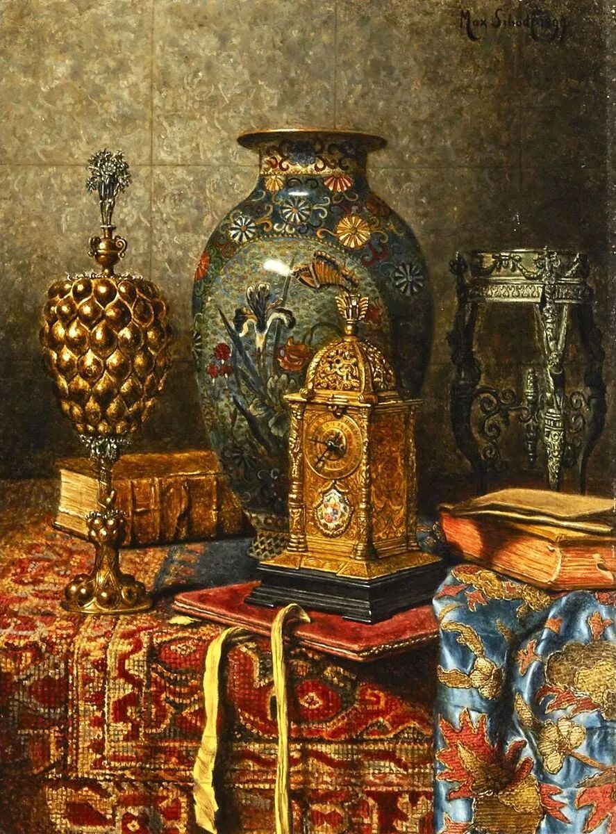 19世纪静物画名家max schödl常在作品中表现中国掐丝珐琅器,浓郁蓝釉将画面衬得更加鲜亮