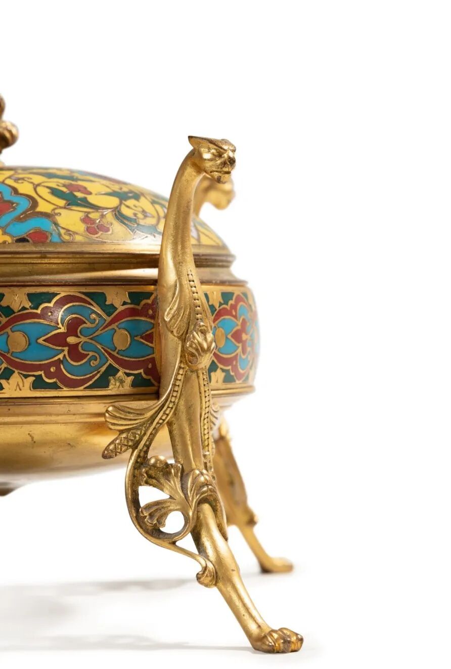 这件花盆架细节之处无不体现着彼时工匠高超的工艺水平和时代品味,置于光线之下,可见华丽鎏金与莹泽珐琅质地结合之美,亦见证了19世纪欧洲对东方绚丽珐琅风采的崇尚与追捧。
