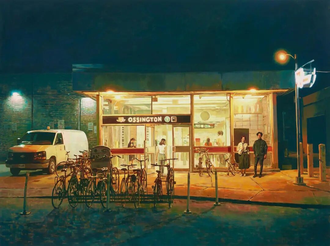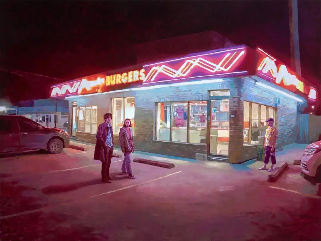 森本启太因为夜间画作而得名,原因就在于对光线的灵活掌控,他总是能够找到一幅画面中最合适设置光的位置,普通的场景,通过光源的注入,一下子变得充满戏剧性,平凡的街道变成了非凡的世界,夜色下的自动售货机、快餐店、停车场,都仿佛有了情感,让人感到亲切和安心。
