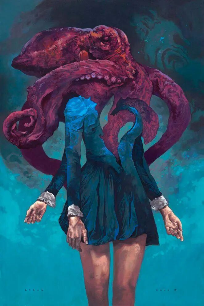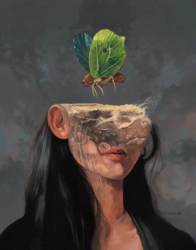 今天小绛要介绍给大家的这组超现实主义画作,就来自史蒂文·拉塞尔·布莱克,画中的主角是一些不完整的女孩,她们的形象与我们见到的那些光鲜亮丽的女孩完全不一样,她们的一半是女性的特征,一半则被自然生物盘踞、缠绕、控制着。