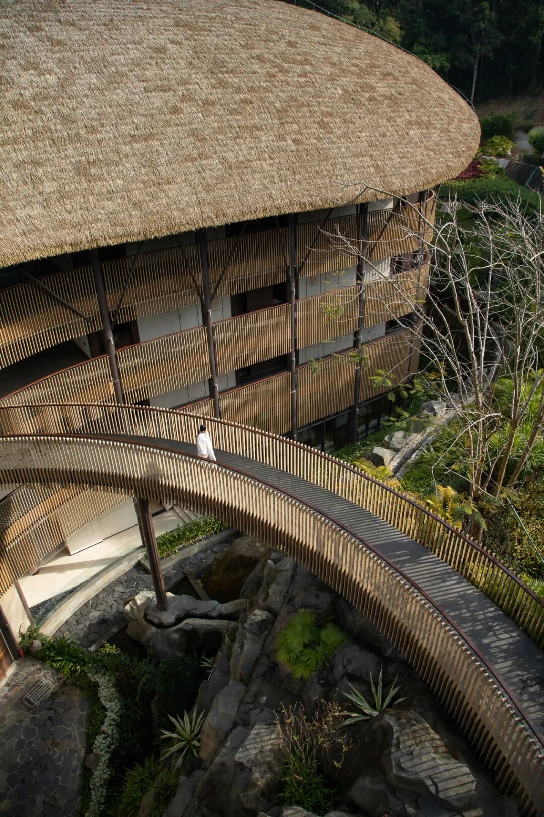 这是蓝调首个自然野奢度假酒店景观,首次禅修佗寂美的尝试,也是首次对天地人合技法的探索。我们希望回归设计的本身,从基地本身拥有的古木参天的热带雨林、原初风采的静谧山湖、传统隐秘的原始村落出发,采用低干预的策略,融入自然,保护生态环境。