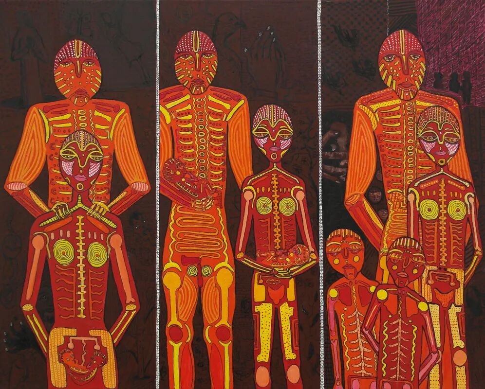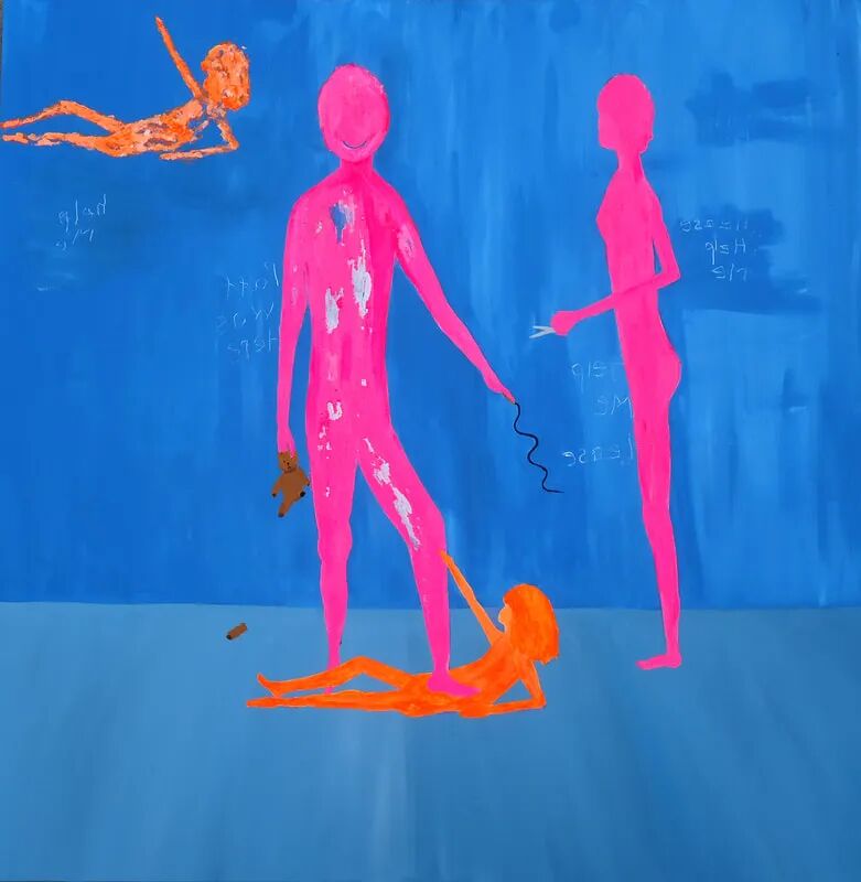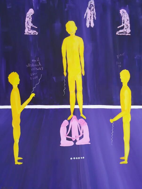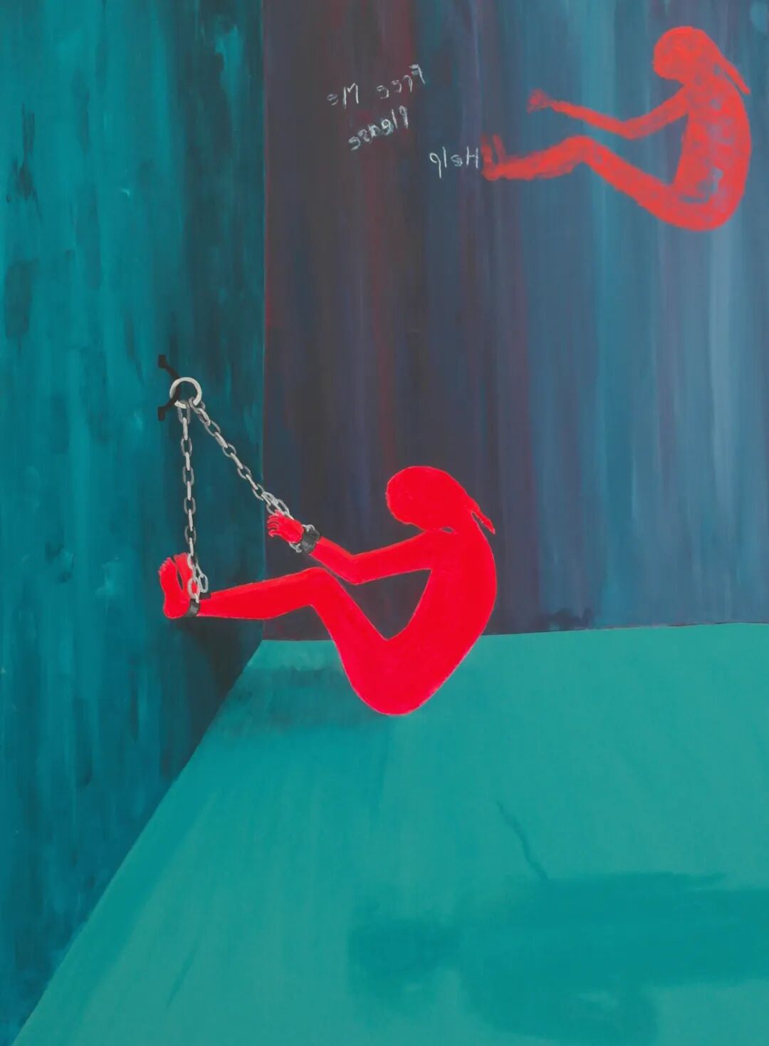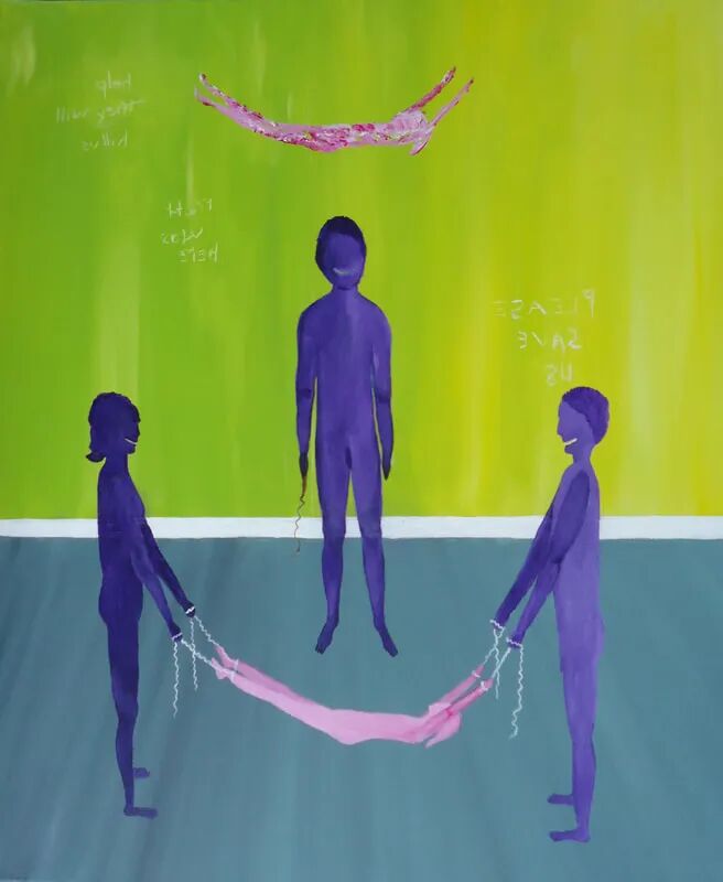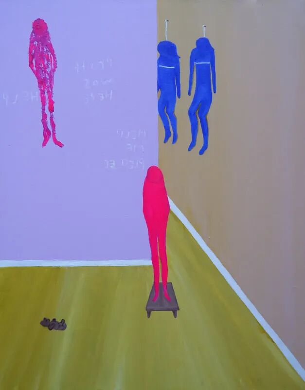 在这幅作品中,三个色彩鲜艳的人物挂在绞索上