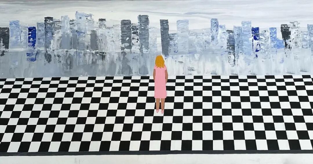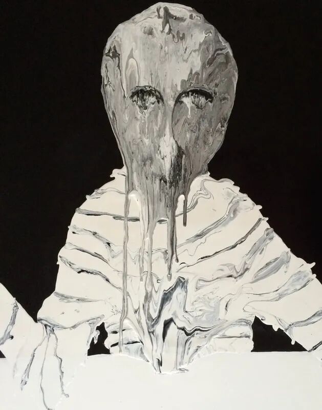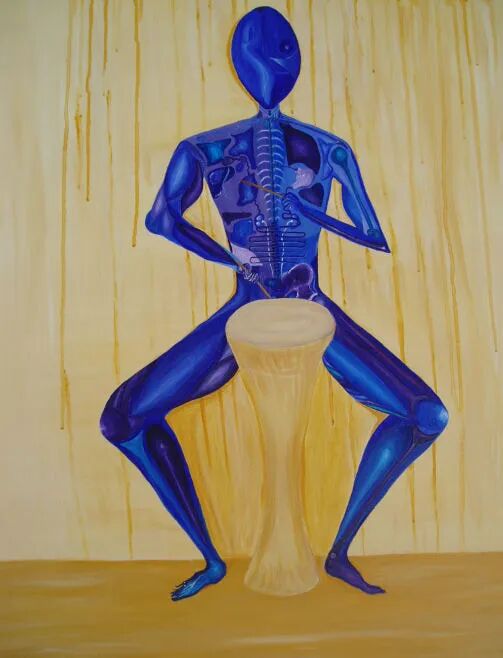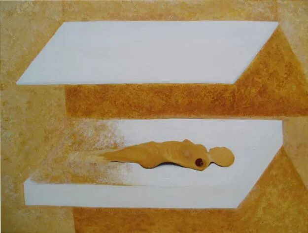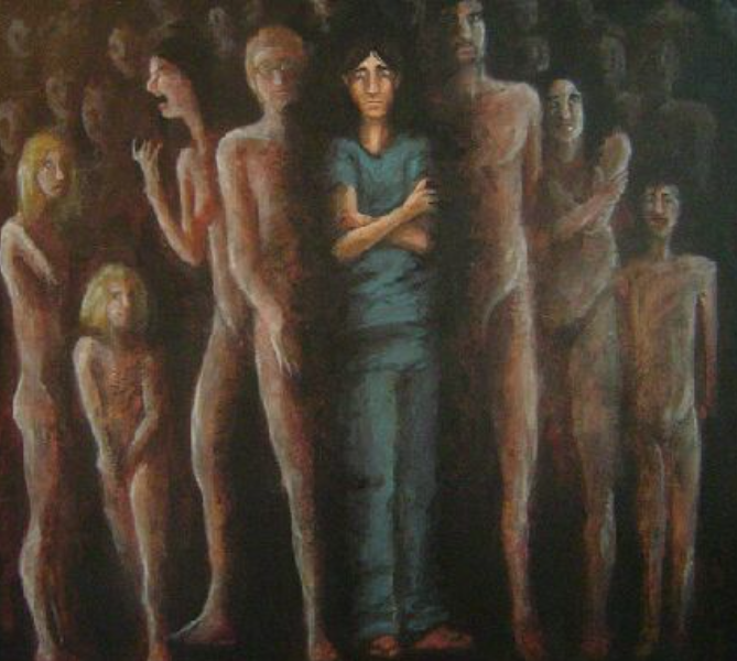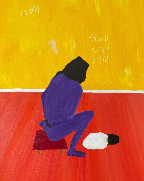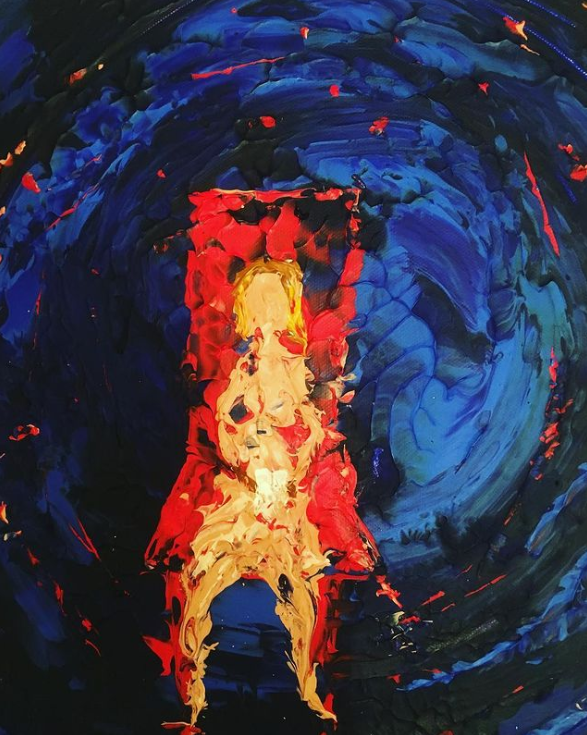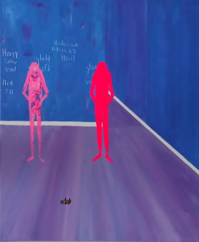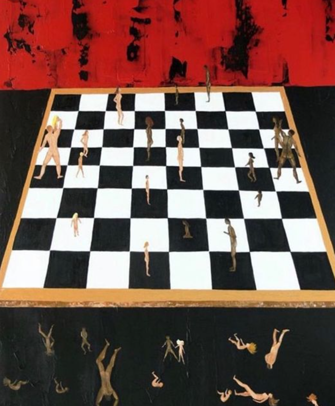 在这幅作品中,三个色彩鲜艳的人物挂在绞索上