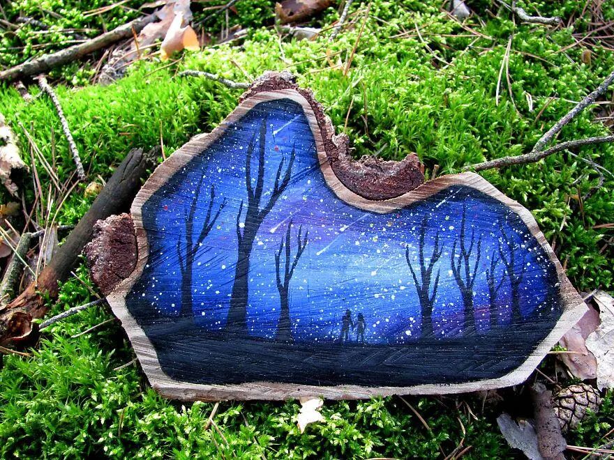 在大学林业专业毕业后,安娜将绘画和她喜欢的森林结合起来,在绘画之余就是去森林中寻找掉落的树枝和无用的木块,再使用丙烯颜料在木块上绘制她想象中的童话图案。
