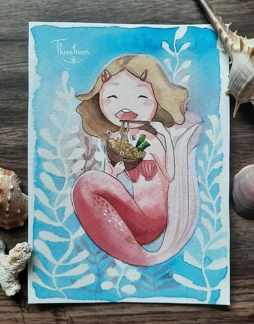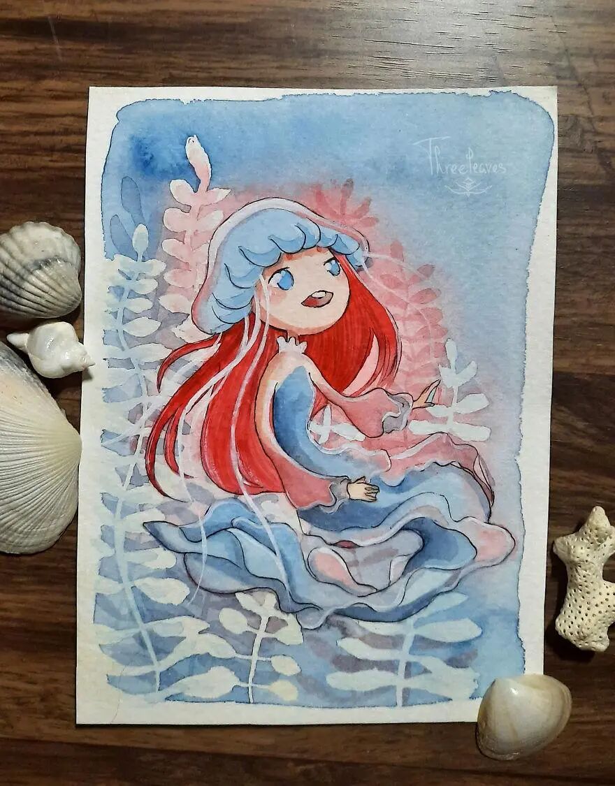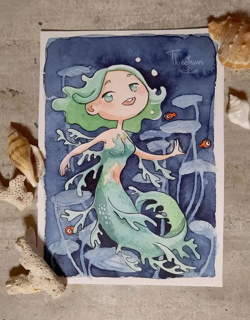这位艺术家就是三叶,她发起了一个30日画30幅美人鱼插画的挑战,并且顺利完成了这个挑战。在美人鱼的基础上,艺术家融入了更多的流行文化元素,其中包括动物、动漫角色以及节日主题等等。