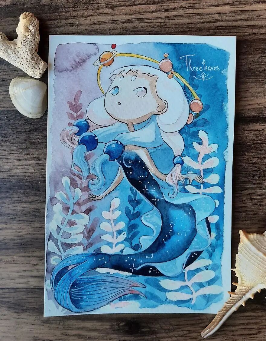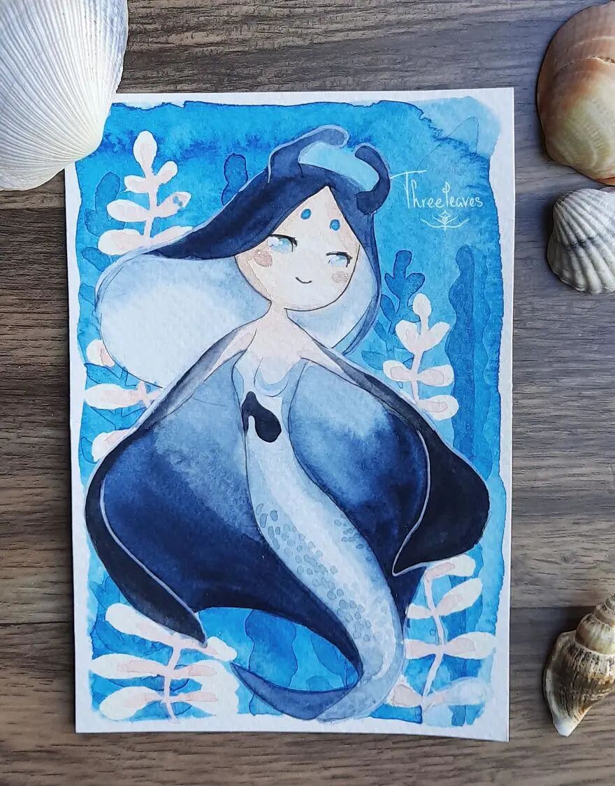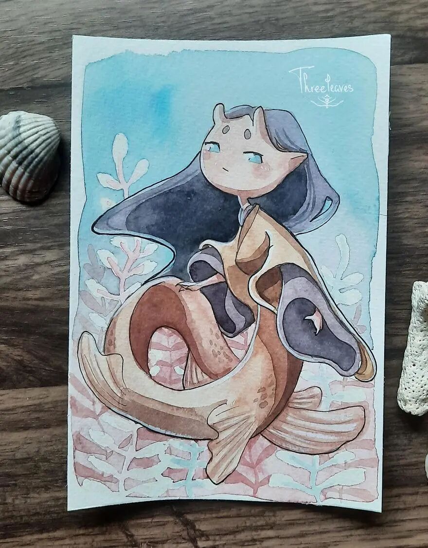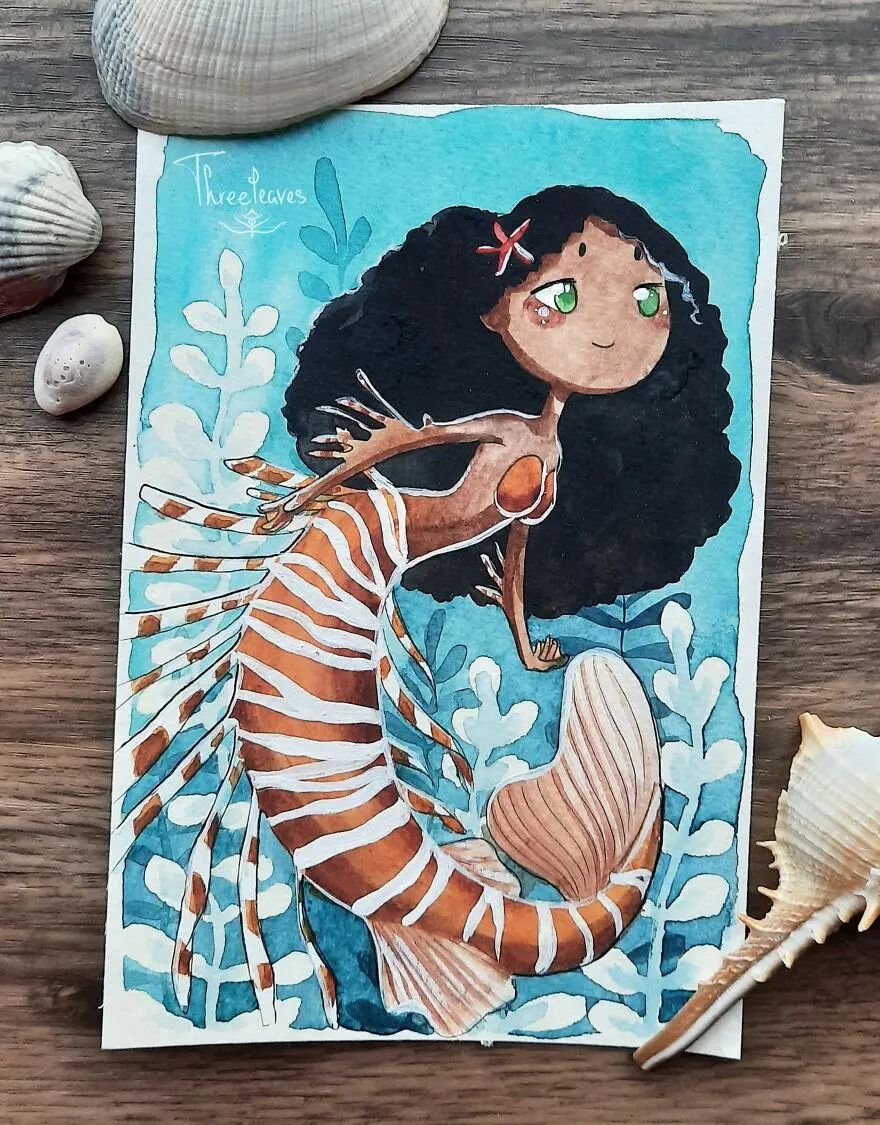 这位艺术家就是三叶,她发起了一个30日画30幅美人鱼插画的挑战,并且顺利完成了这个挑战。在美人鱼的基础上,艺术家融入了更多的流行文化元素,其中包括动物、动漫角色以及节日主题等等。