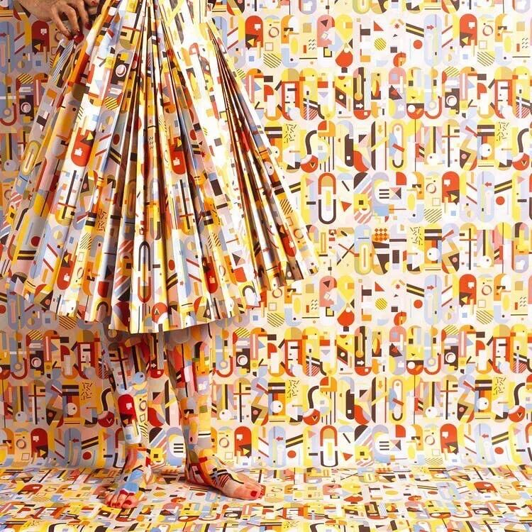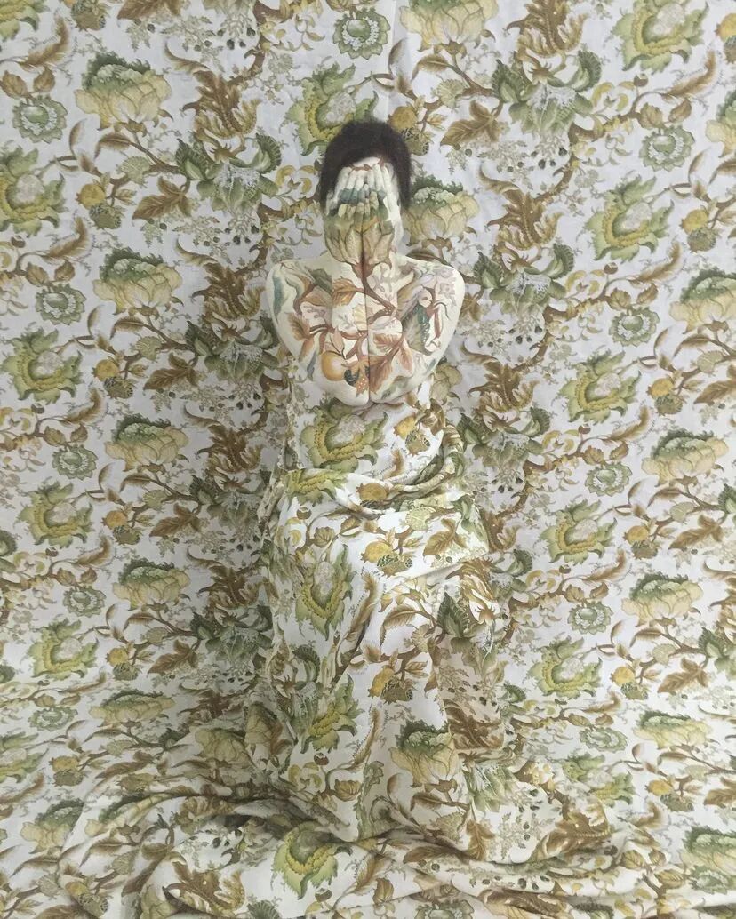 她说:“我用相同的材料图案包裹、覆盖或涂抹我的身体,并将自己描绘成风景的一部分。通过这一行动,我致力于在我生活的地方或我觉得可以称之为家的地方,与周围的人或世界的一部分建立我自己的认同。”