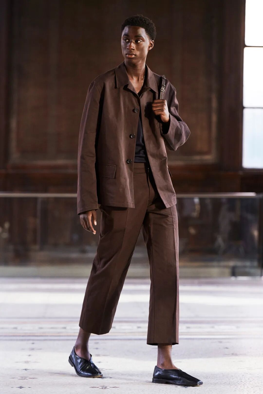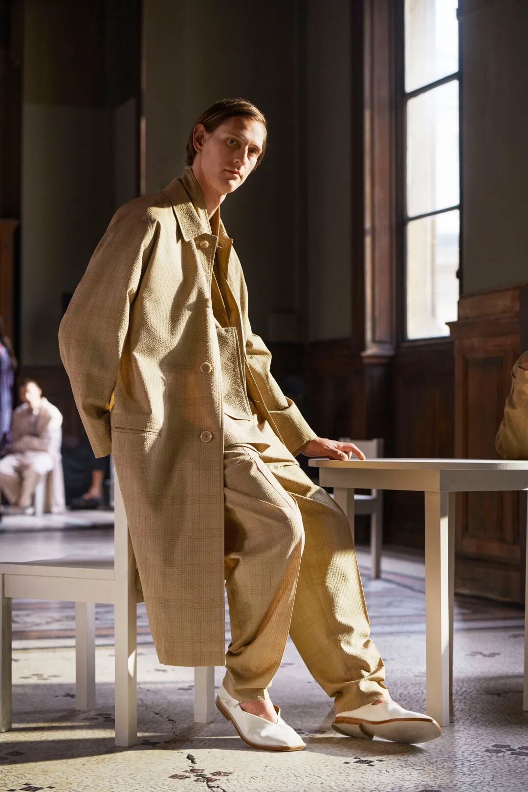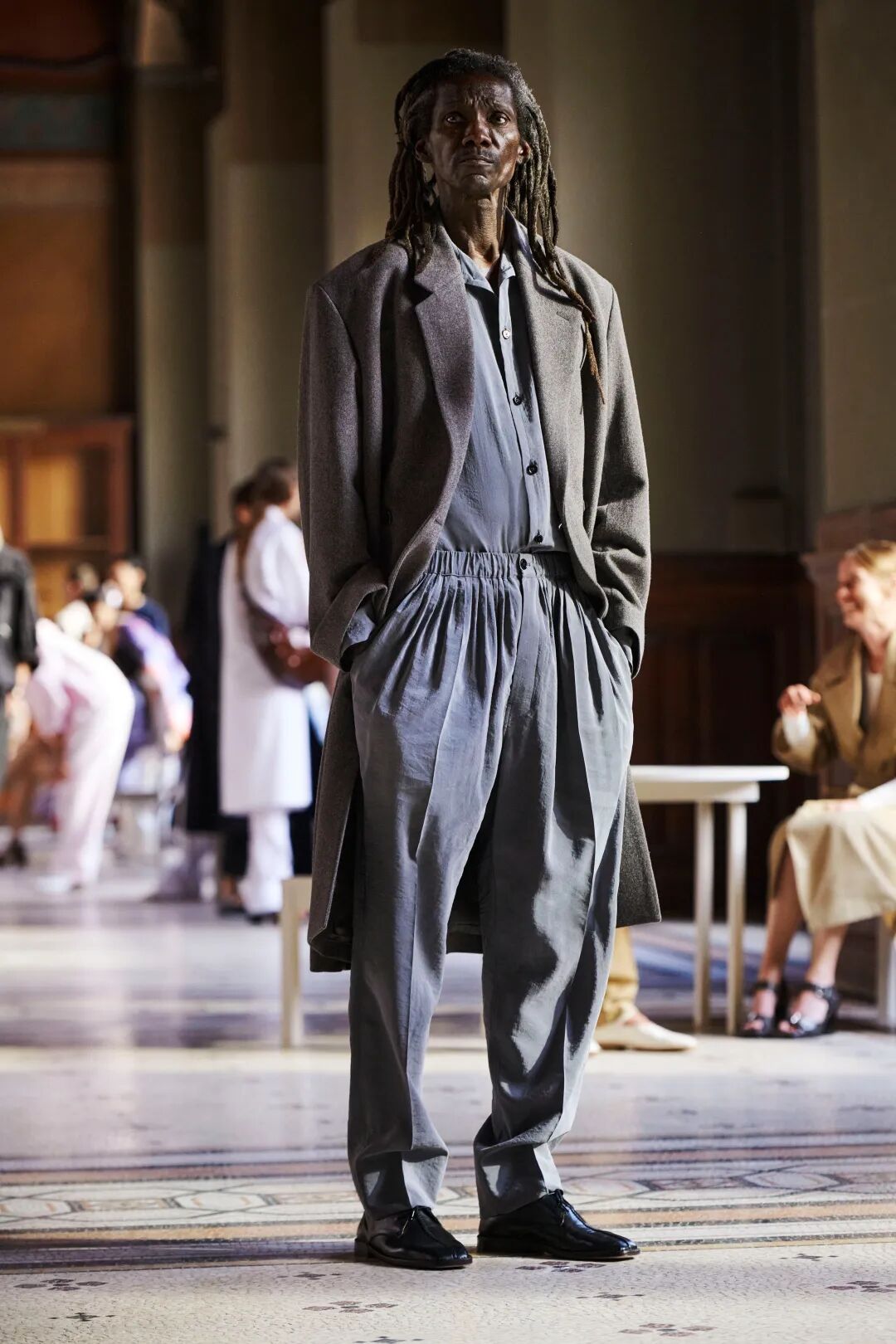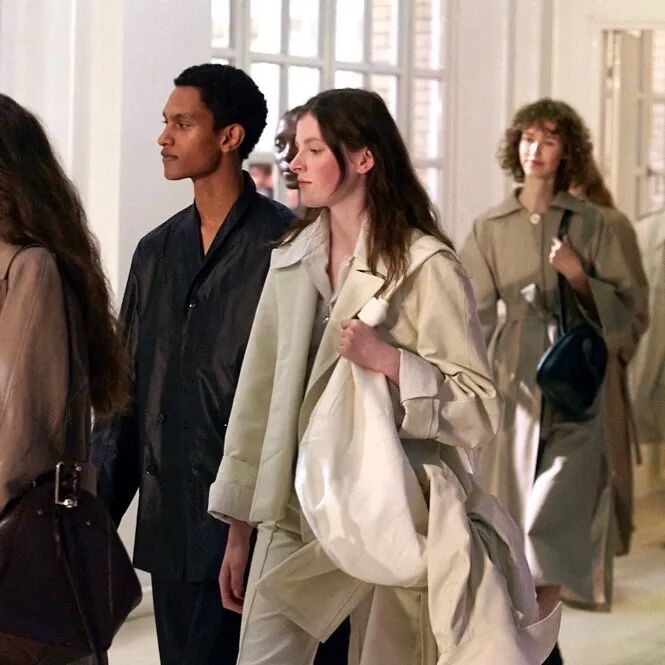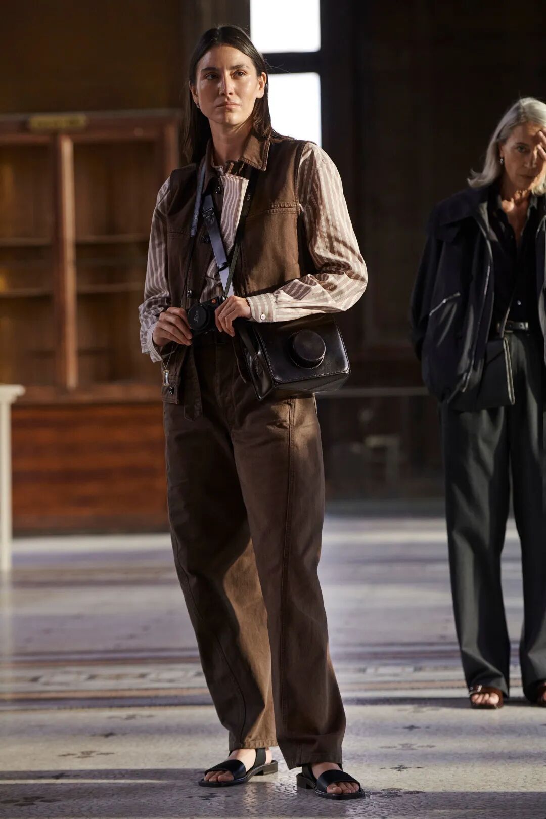 2023春夏系列,Lemaire以They’re waiting(等待的人)为主题,让模特们在场地中自由穿行,正如巴黎人的日常生活场景般。观者变身旅客,进入一个好似火车站的大厅之中。