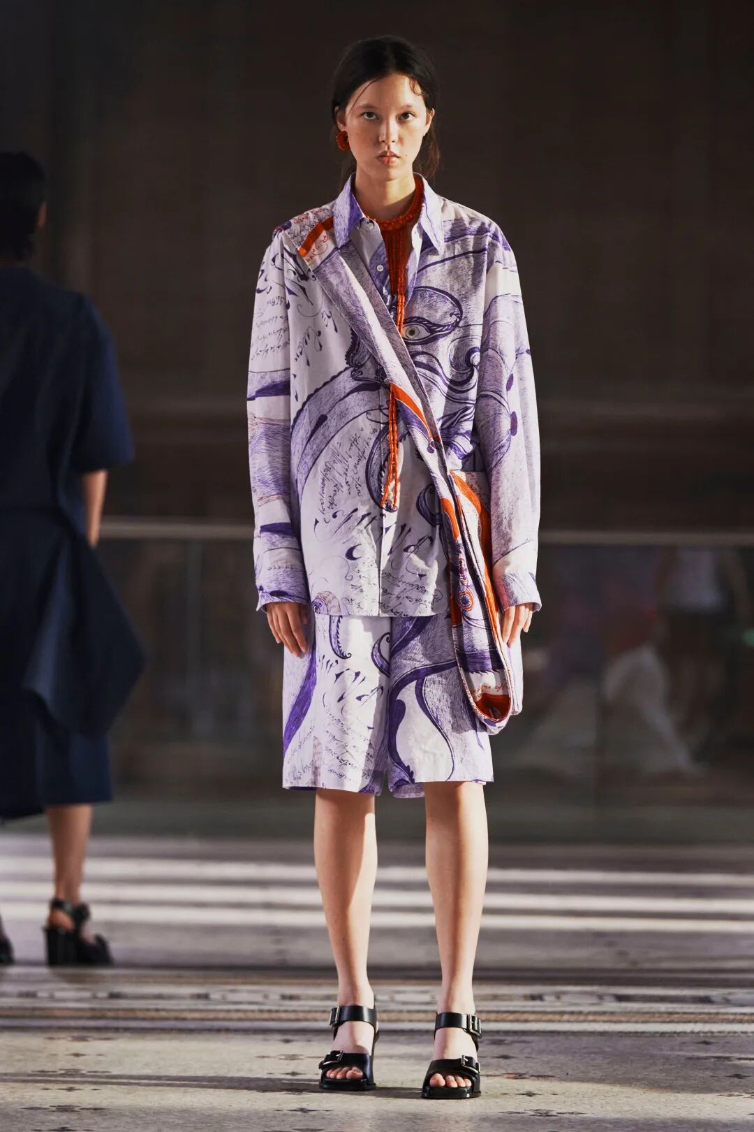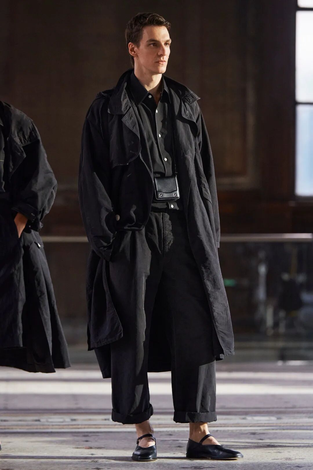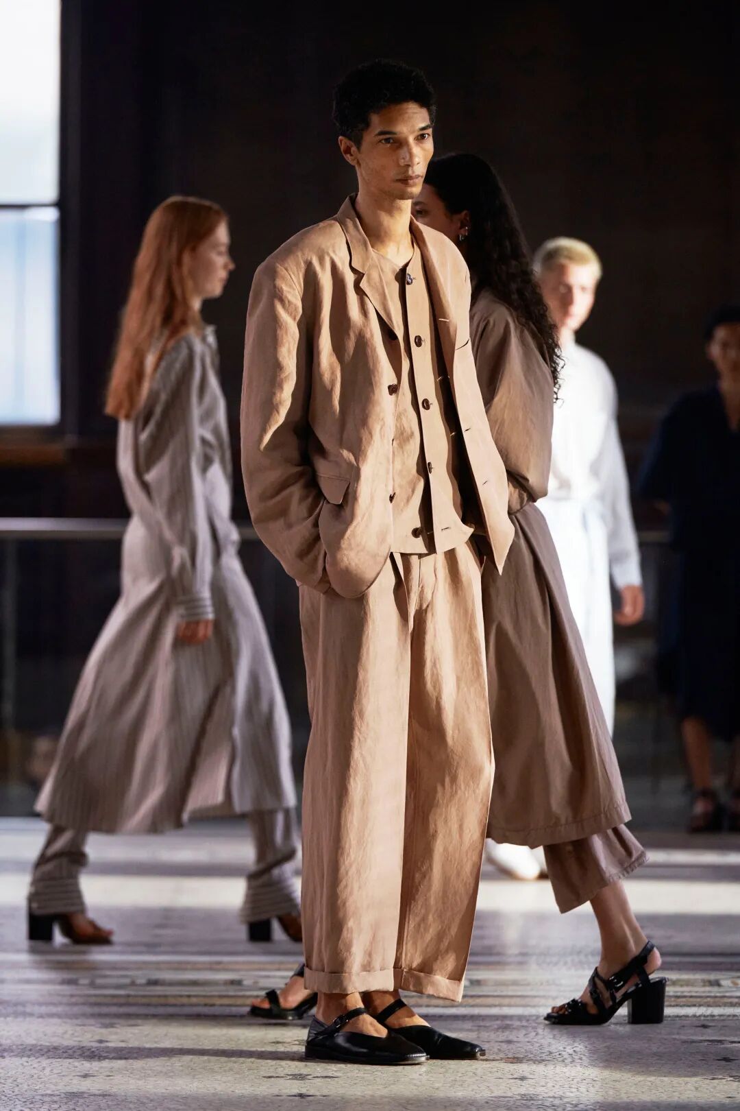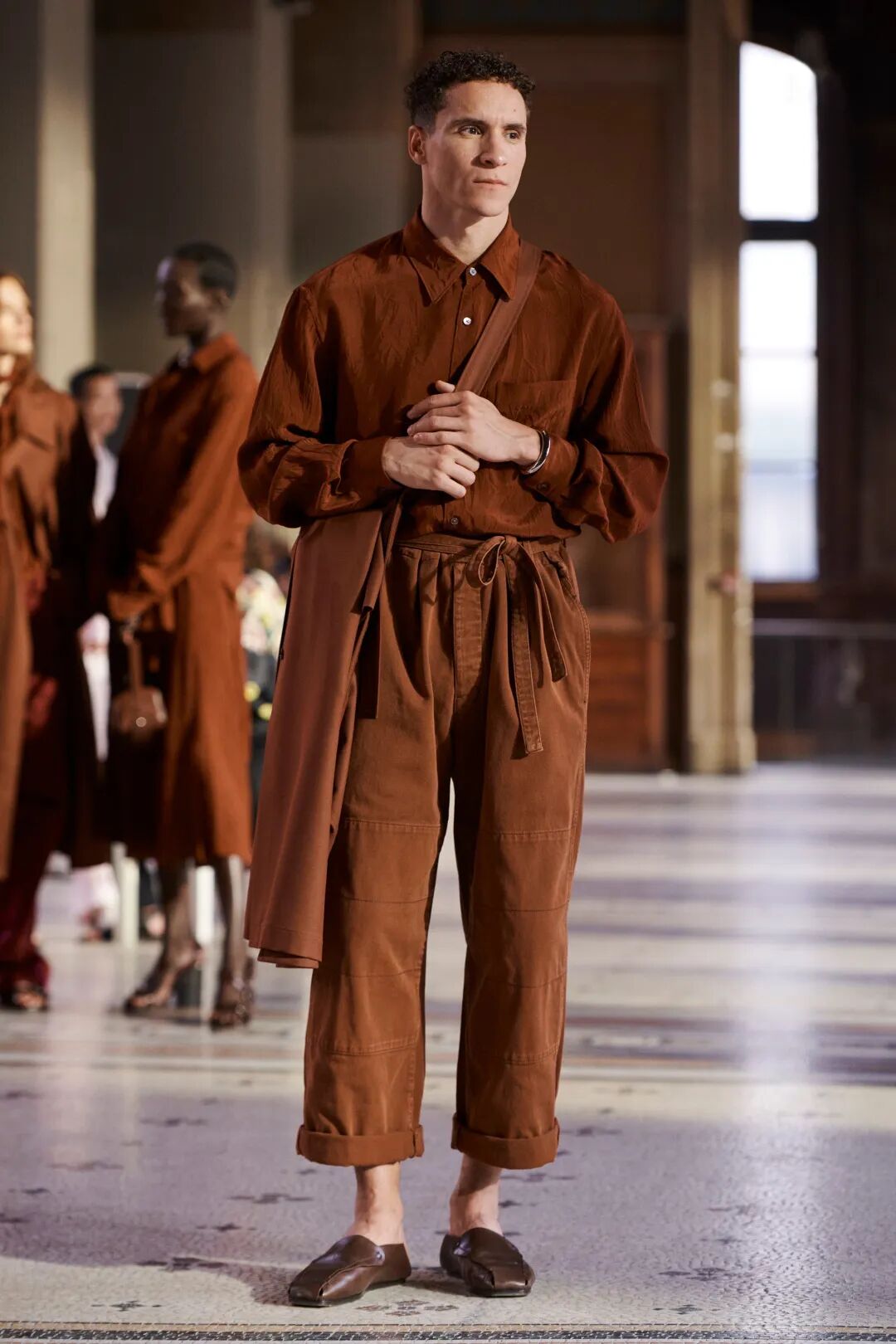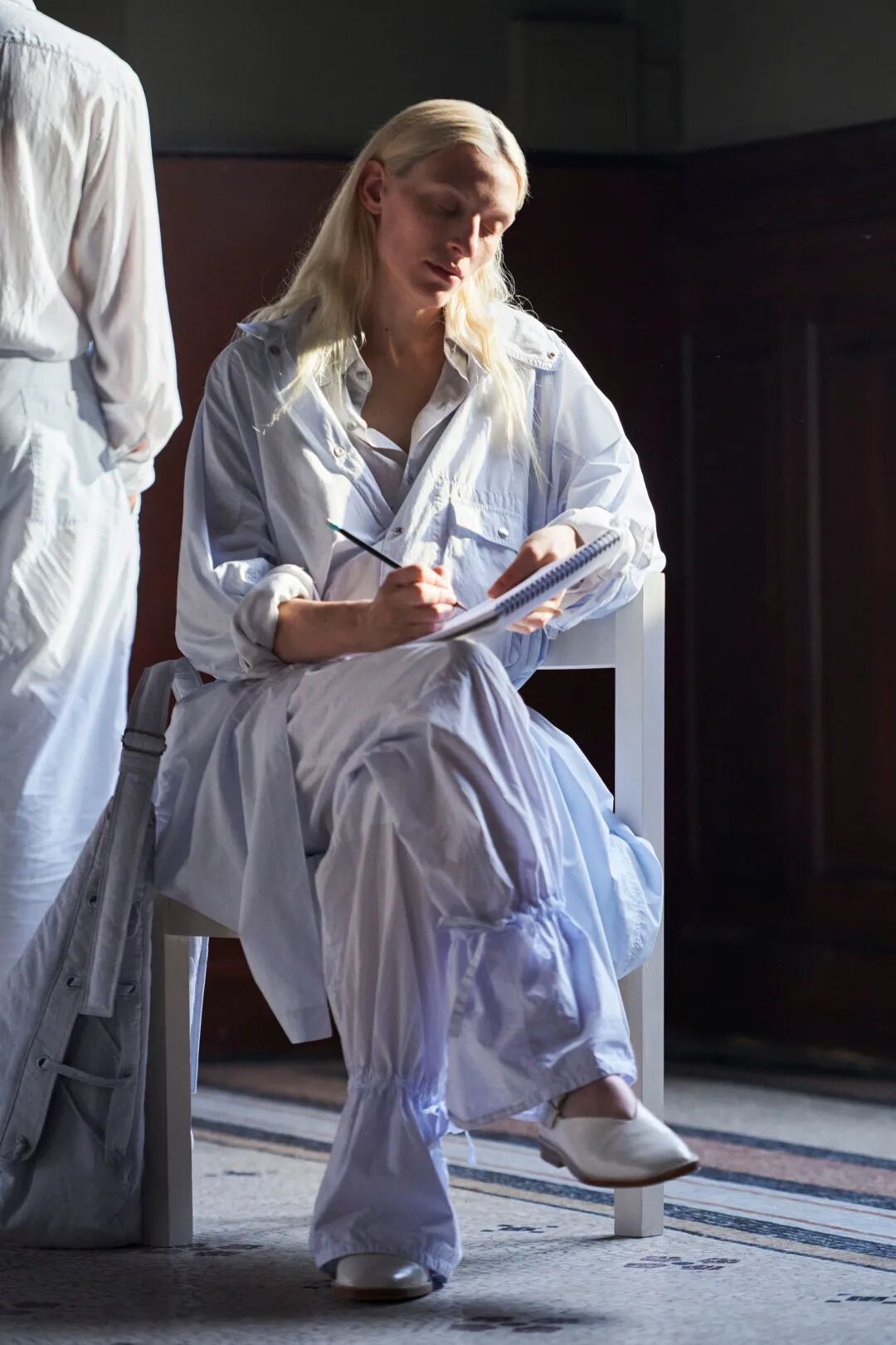 2023春夏系列,Lemaire以They’re waiting(等待的人)为主题,让模特们在场地中自由穿行,正如巴黎人的日常生活场景般。观者变身旅客,进入一个好似火车站的大厅之中。