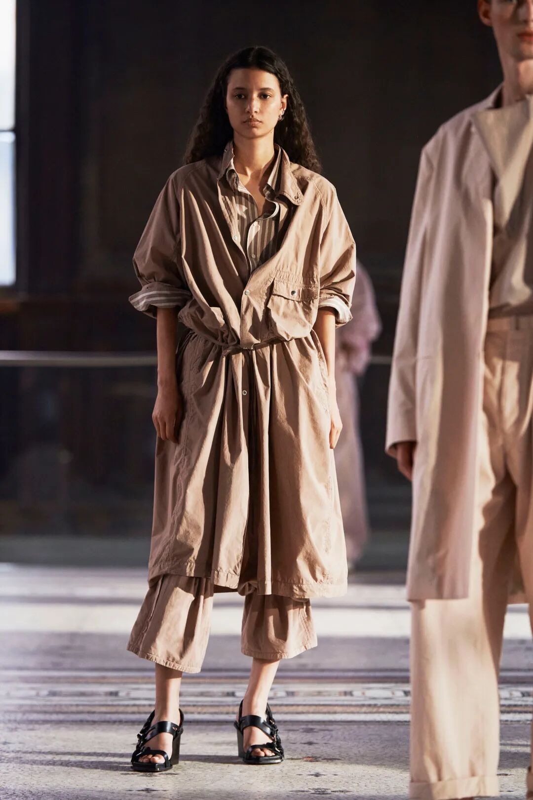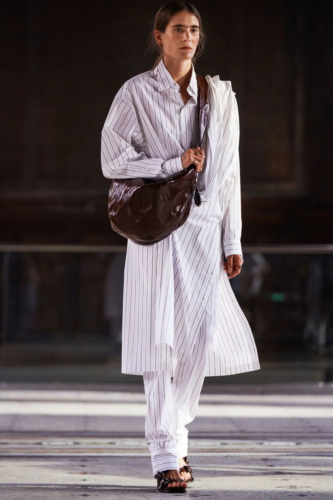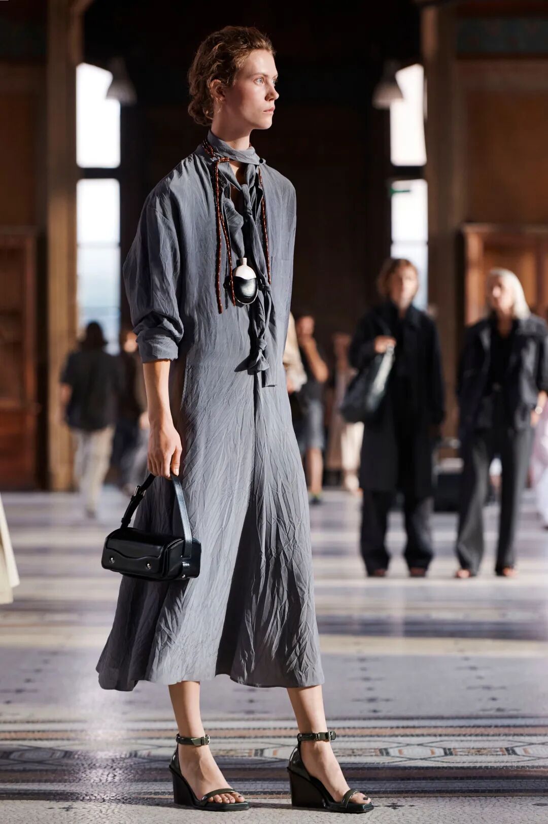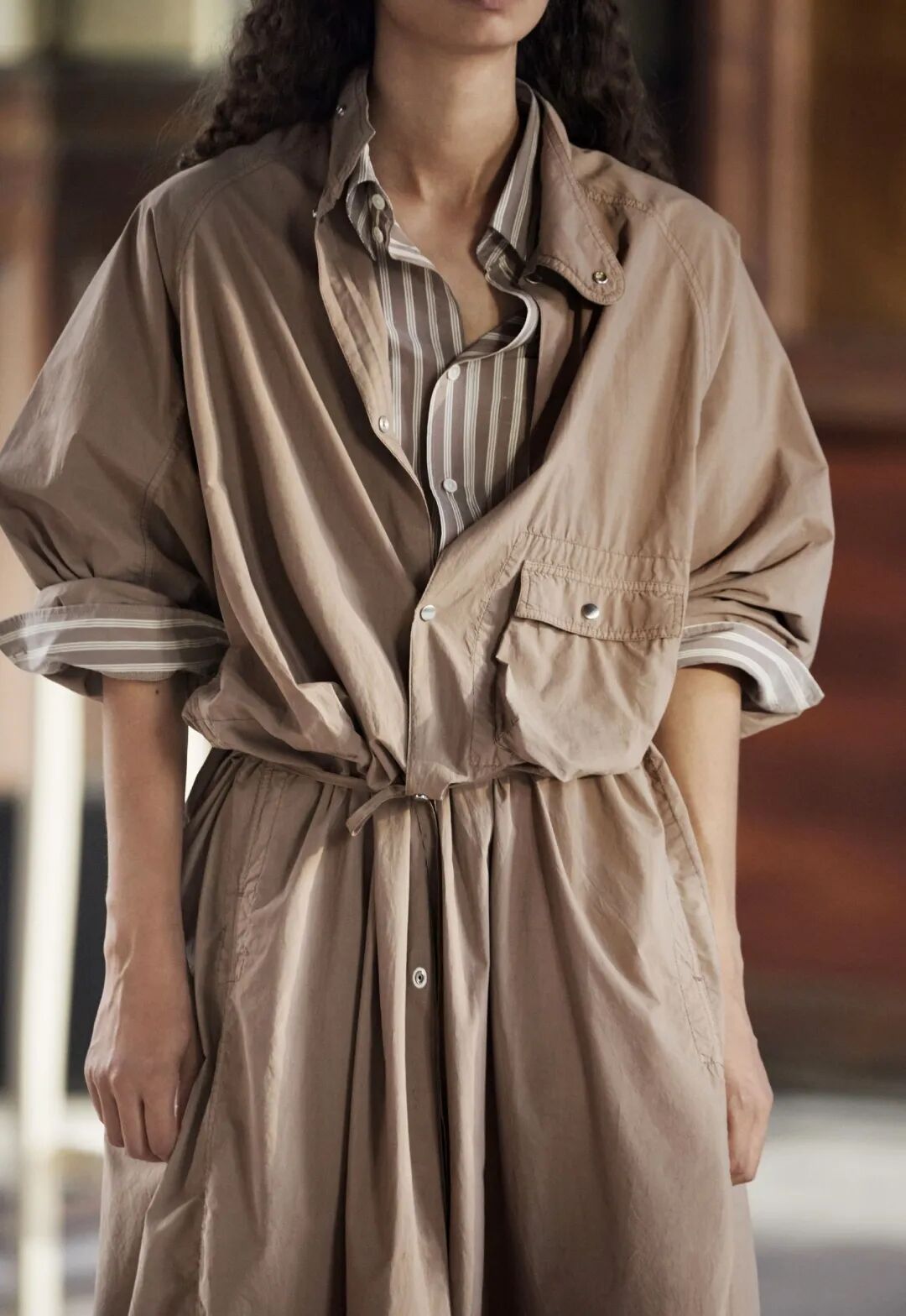 柔软而充满空气感的衬衫、连衣裙和长袍。宽松的廓型便于律动,在着衣者与衣服之间留有空间,同时在腰部、脚踝处略作调整,以塑造廓型,勾勒出一份几不可察的精致感。
