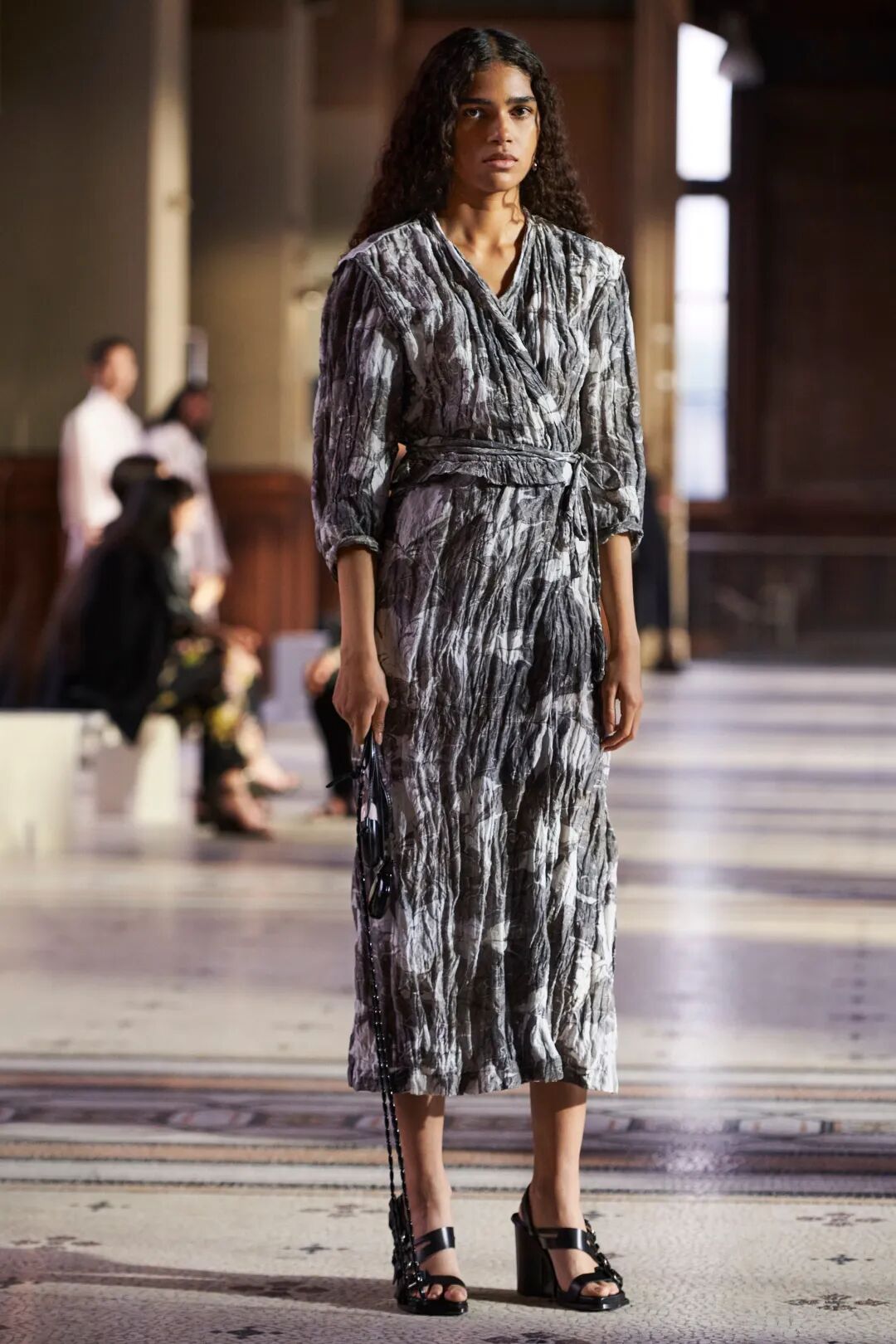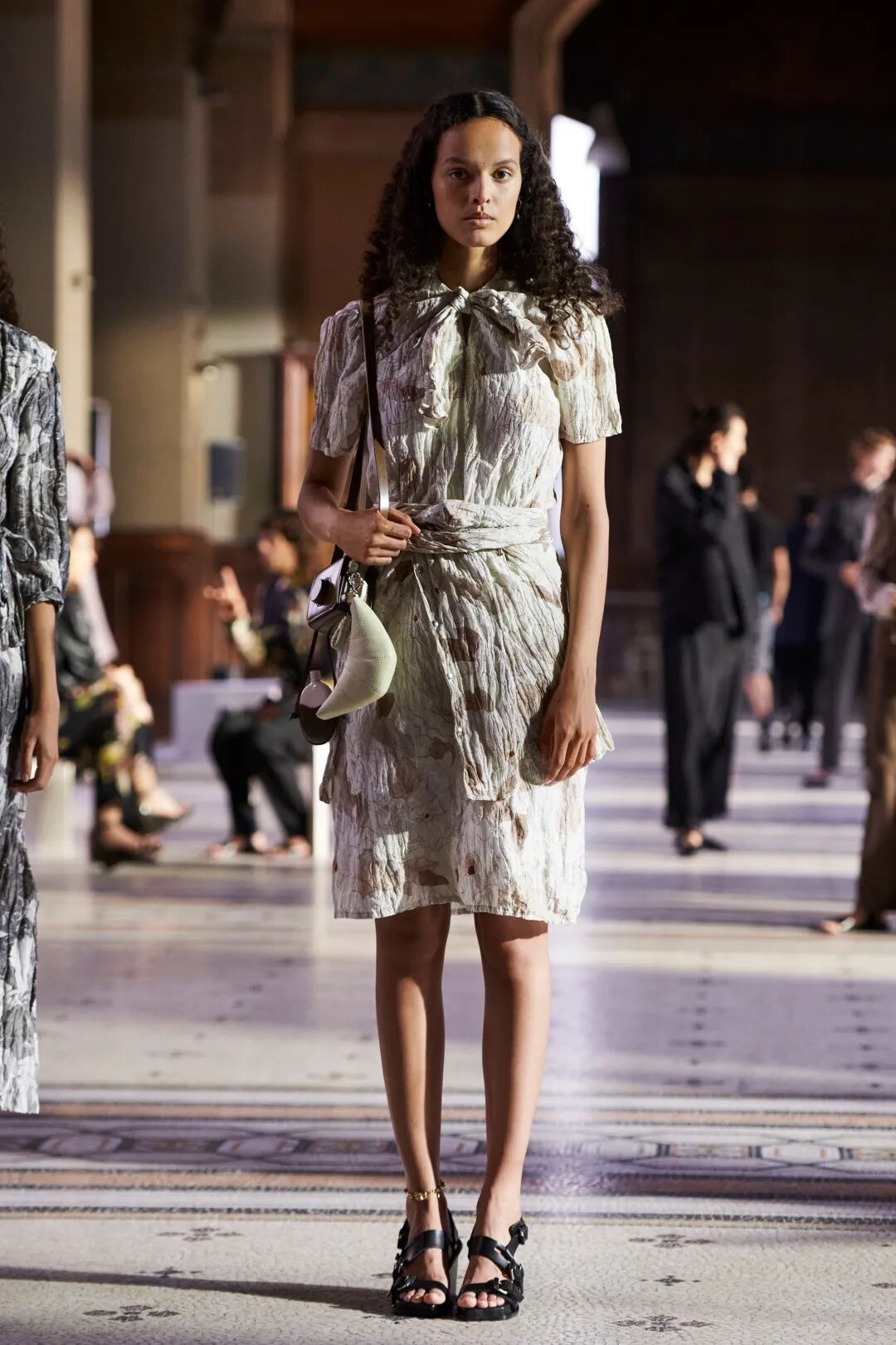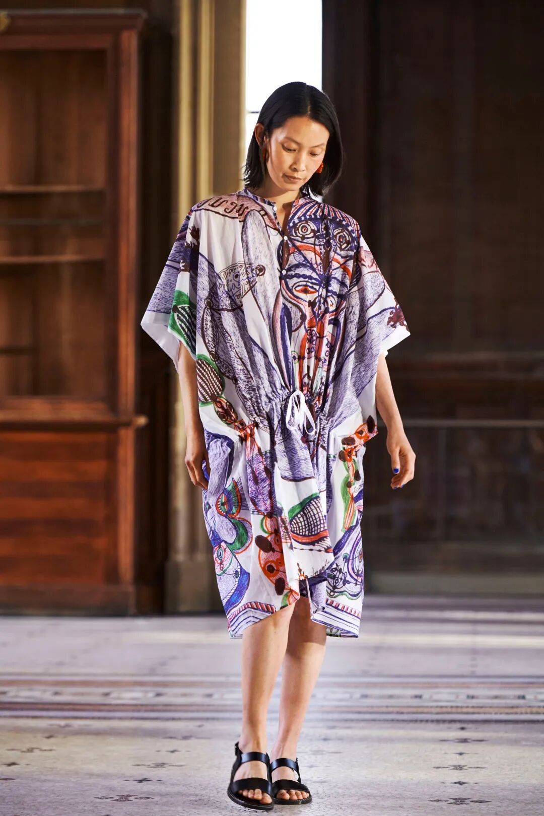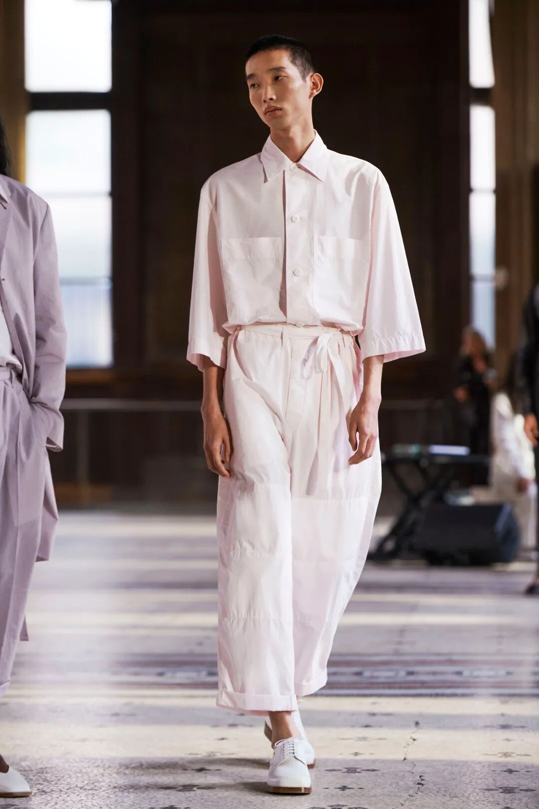 柔软而充满空气感的衬衫、连衣裙和长袍。宽松的廓型便于律动,在着衣者与衣服之间留有空间,同时在腰部、脚踝处略作调整,以塑造廓型,勾勒出一份几不可察的精致感。