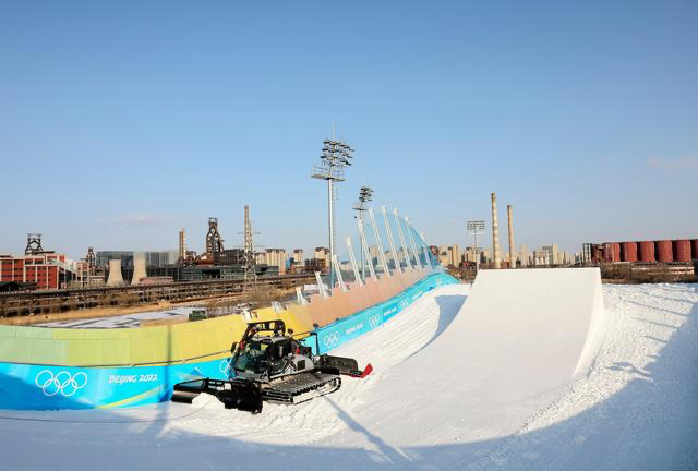 跳台所在地首钢园,是我国第一座国有钢铁厂,场地由北向南依次分布着原首钢发电主厂房、冷却塔及原首钢制氧厂厂房。冬奥会期间,它们分别被改造成为综合服务楼,验票安检大厅和赛事管理办公区。其余的空间,则被草坪、池塘和大量植被填满。