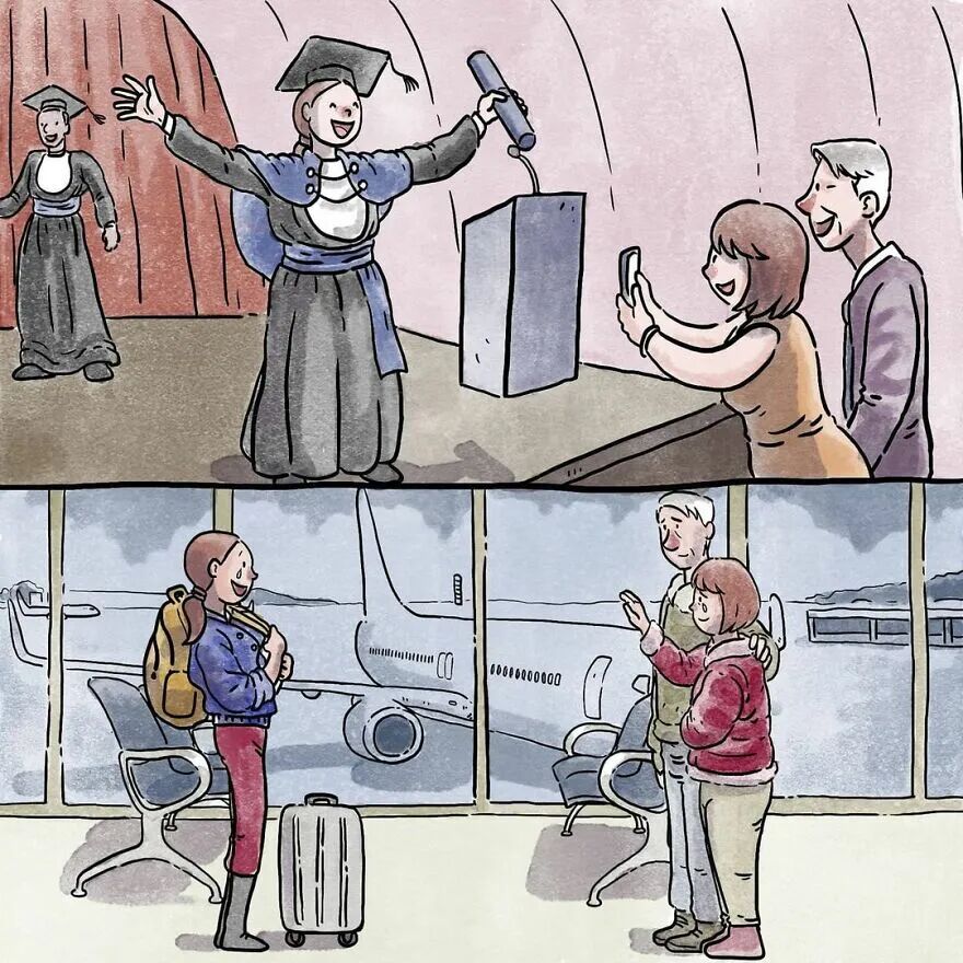 孩子大学毕业了,想去更大的世界看看,男人和女人虽然不舍,还是含泪将她送上了飞往国外的航班。