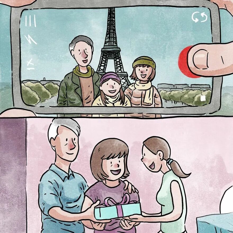 渐渐地,孩子长大了。他们带着孩子到处旅游,孩子也乖巧懂事,会在节日送给自己的妈妈一些暖心的礼物。