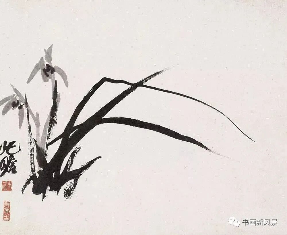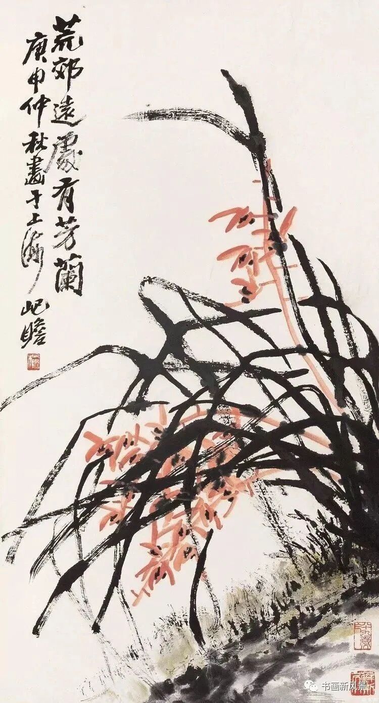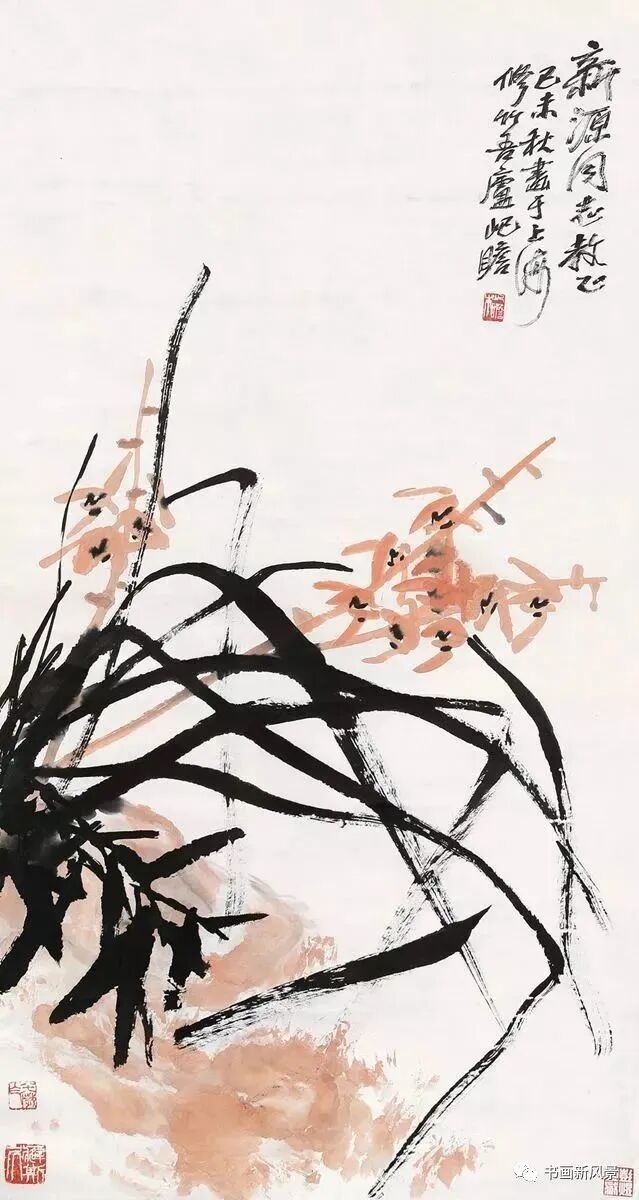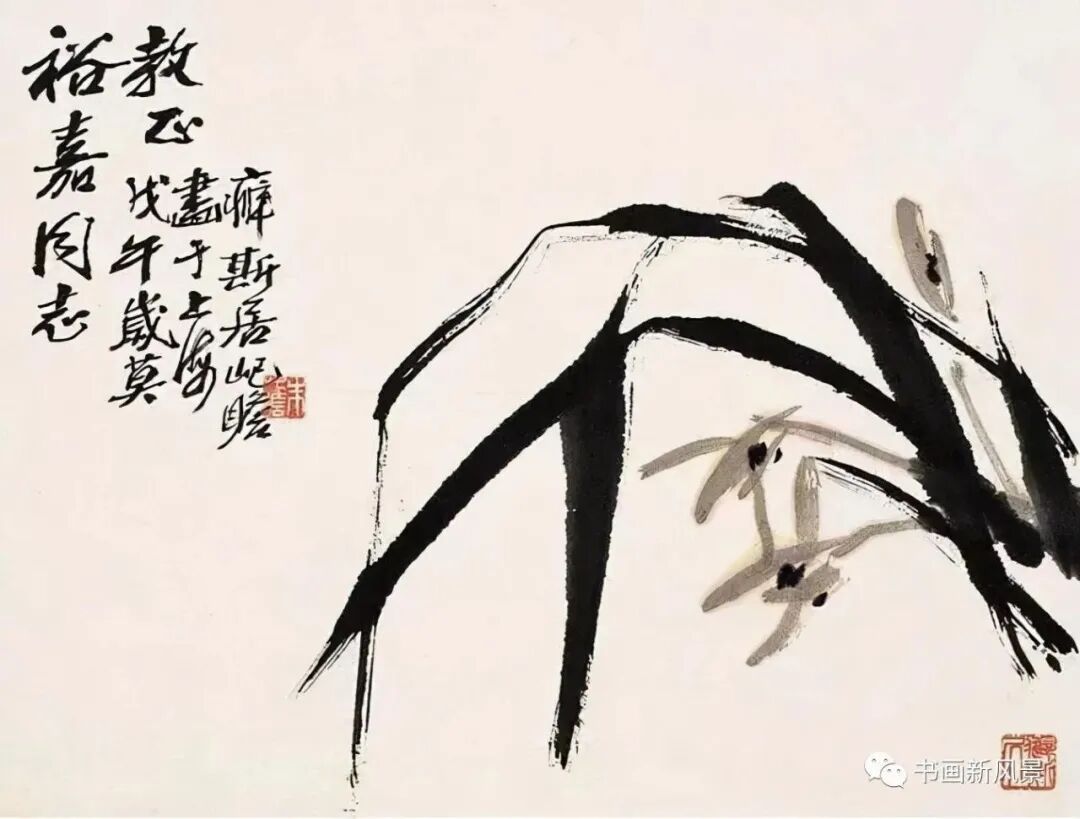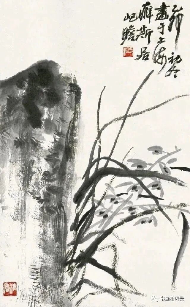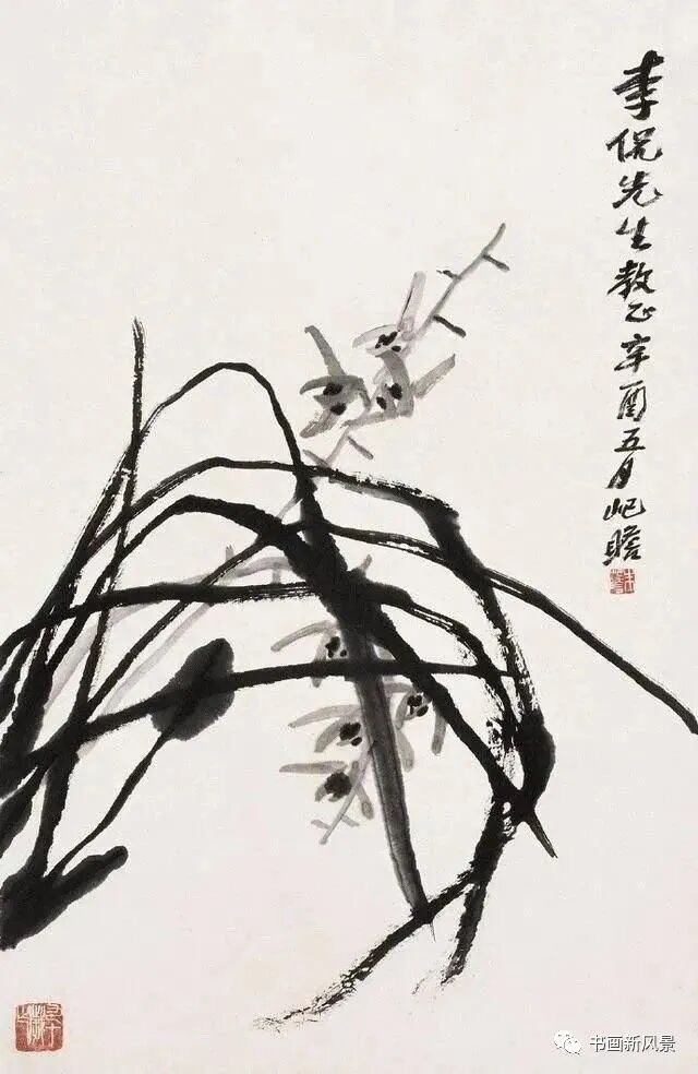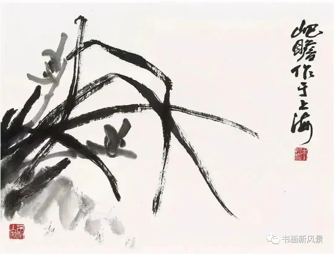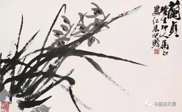 古人云“喜气写兰,怒气写竹”,朱屺瞻却一反常态,是以怒气写兰的。他完全打破了书画界限,直接以书法中的草书施于兰叶,多用枯笔焦墨,意气盘礡,用笔飞舞,朴拙深厚,气力极大。