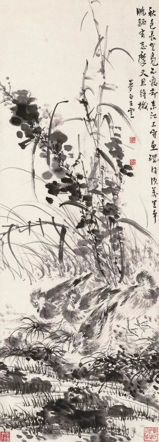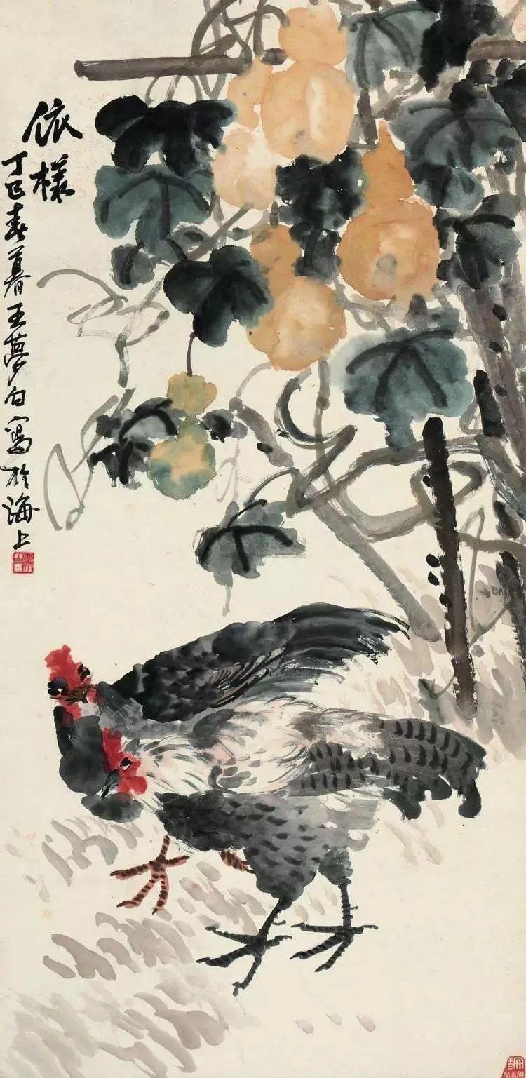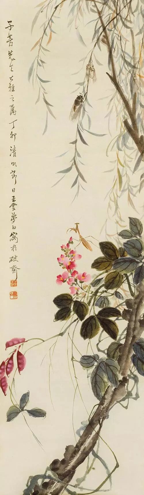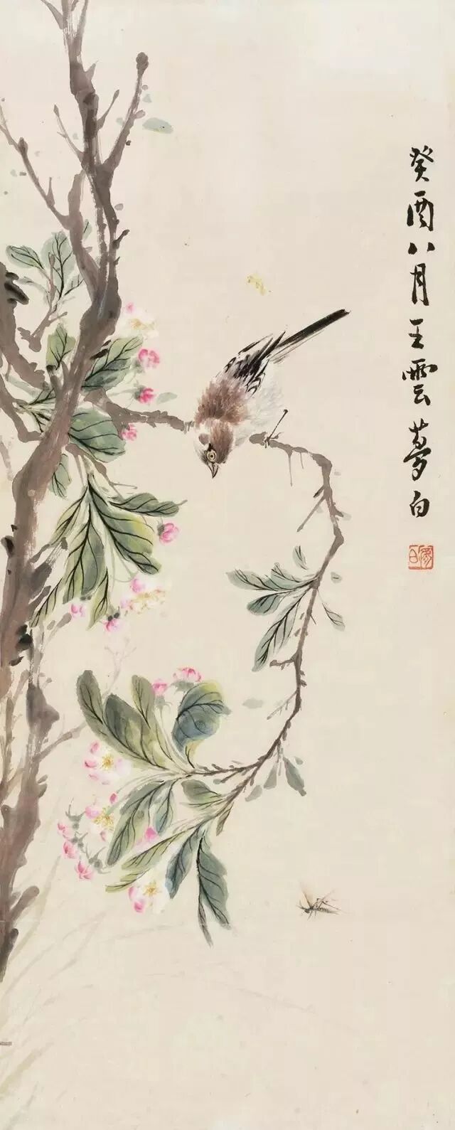 王雪涛称王梦白作画有"三快",即眼快、手快、心快。王梦白的代表之作,比如现藏于中国美术馆的《豆荚蚂蚱图》、《海棠蟋蟀图》等,蚂蚱、蟋蟀的瞬间动态描绘得活灵活现,让人感受到"当其下手风雨快,笔所未到气已吞"的精熟畅快。
